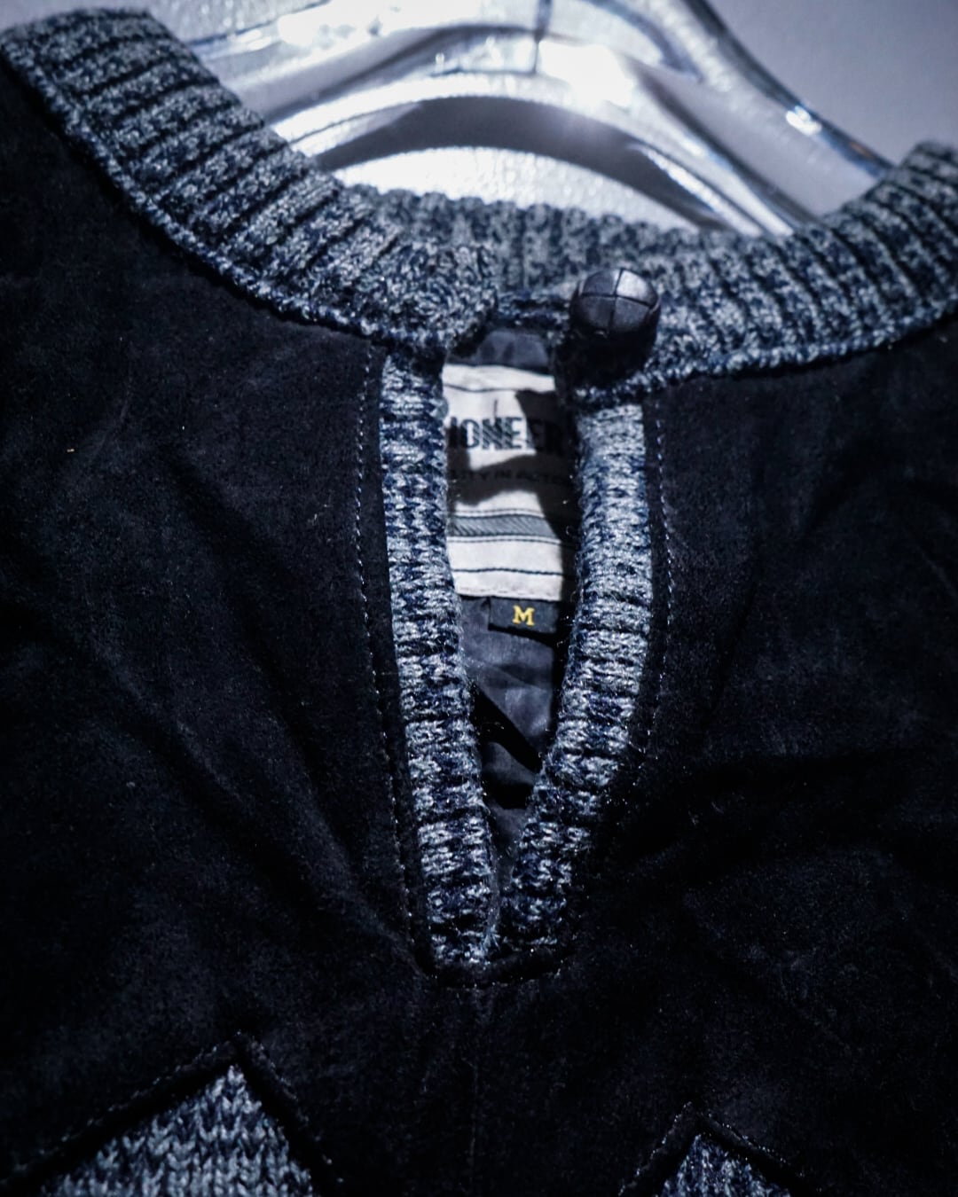 ボディはアクリルニット特有の柔らかさと伸縮性を備えつつ、肩まわりのスエードが全体を引き締めています。ドルマン風の袖作り、キュッと効いたリブによるシルエットも◎素材使いと構成力、どれを取っても80’sアメリカンクラフトの意匠を感じさせますね。