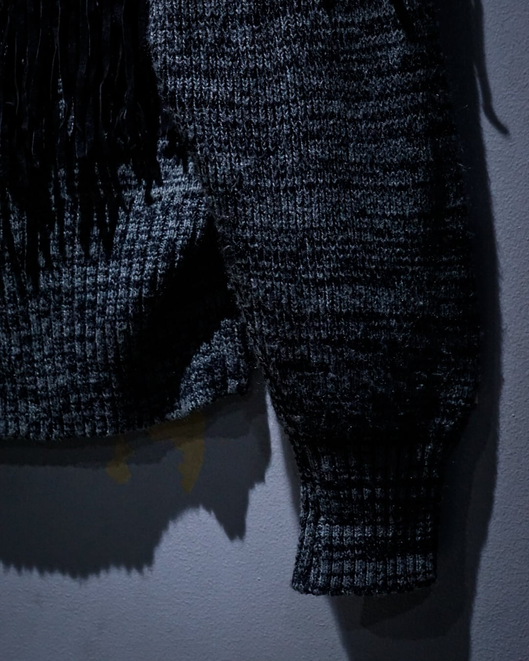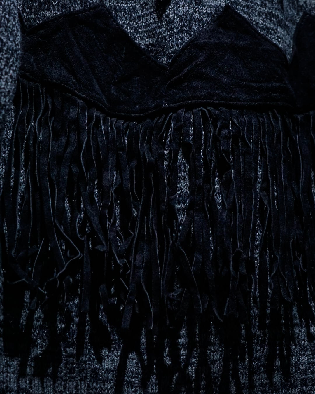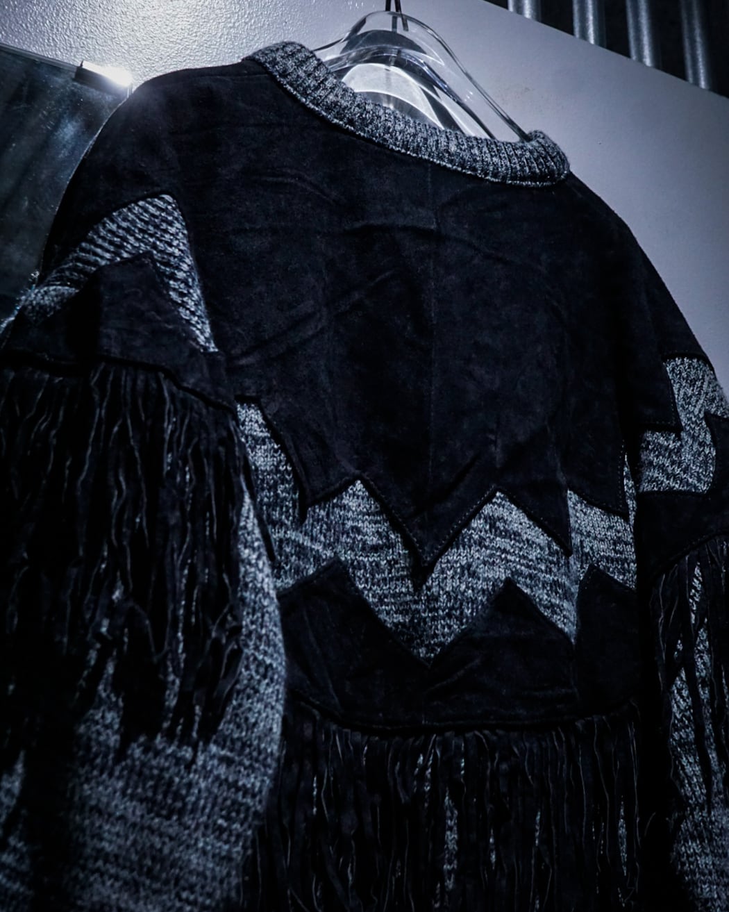 首元はスキッパー風にループボタン。胸元から袖にかけて走るV字の切り替えラインとフリンジ装飾が、ネイティブアメリカンの伝統柄を思わせる仕上がりに。そして動くたびに揺れるロングフリンジが立体的でモードな表情を生み出しています。