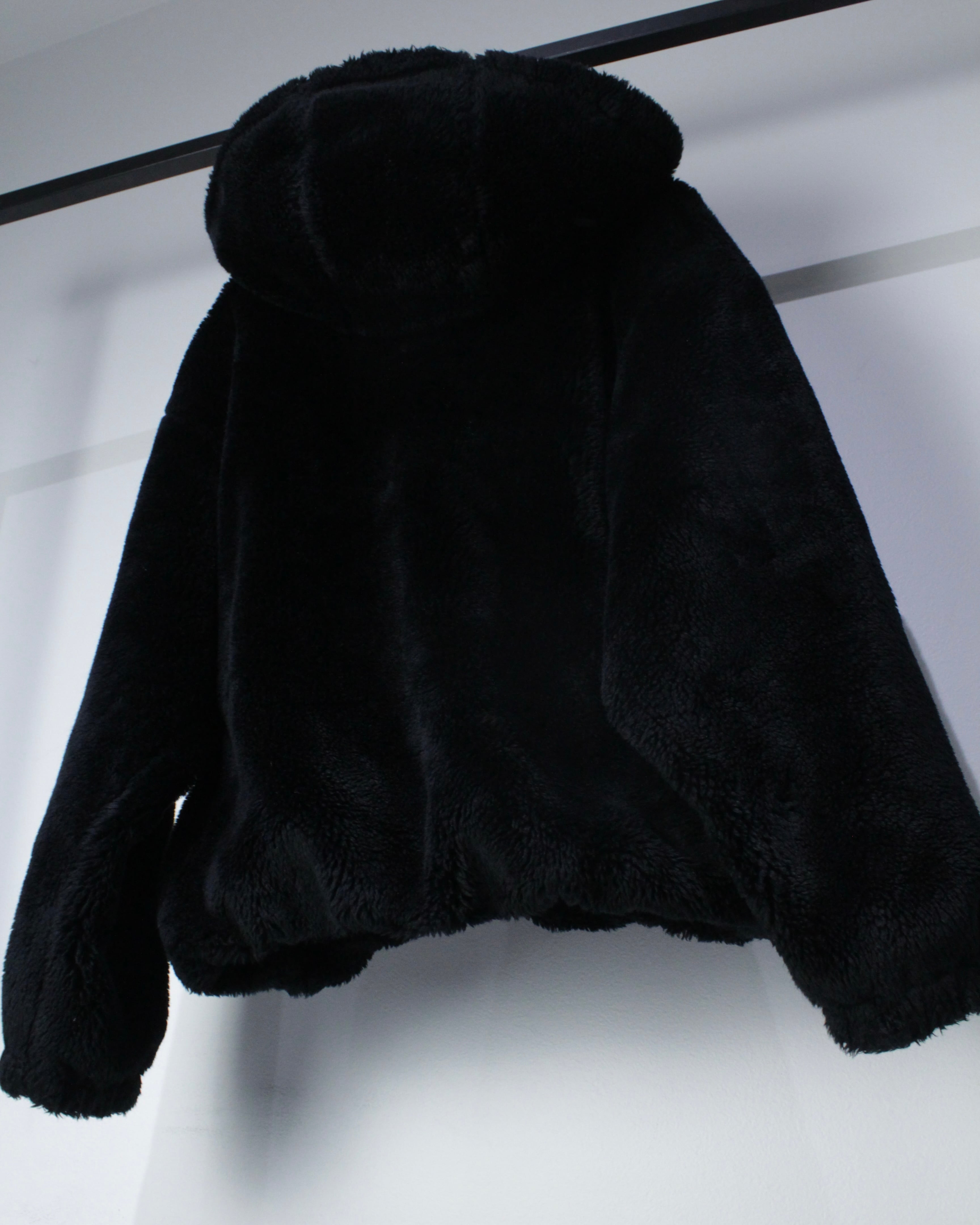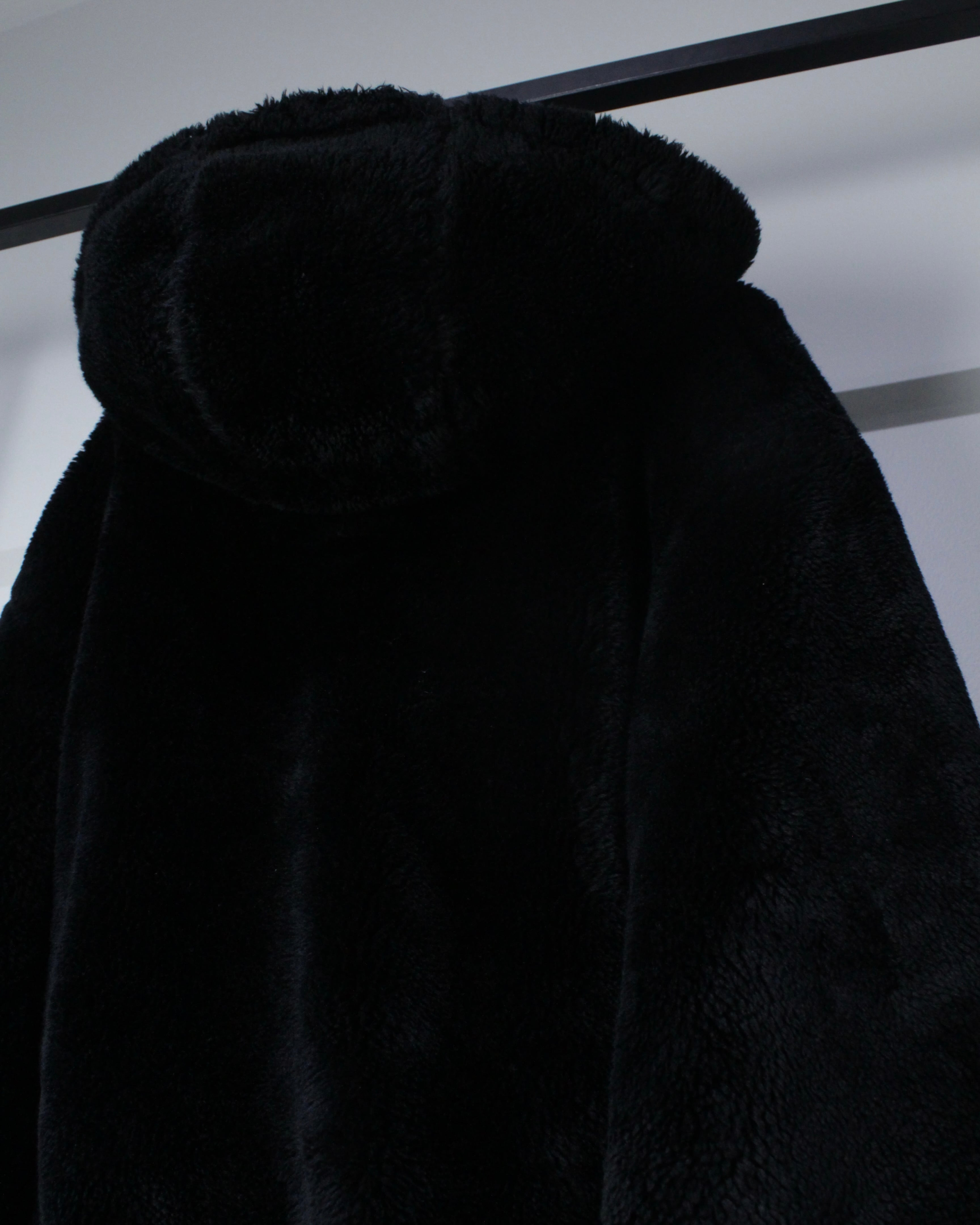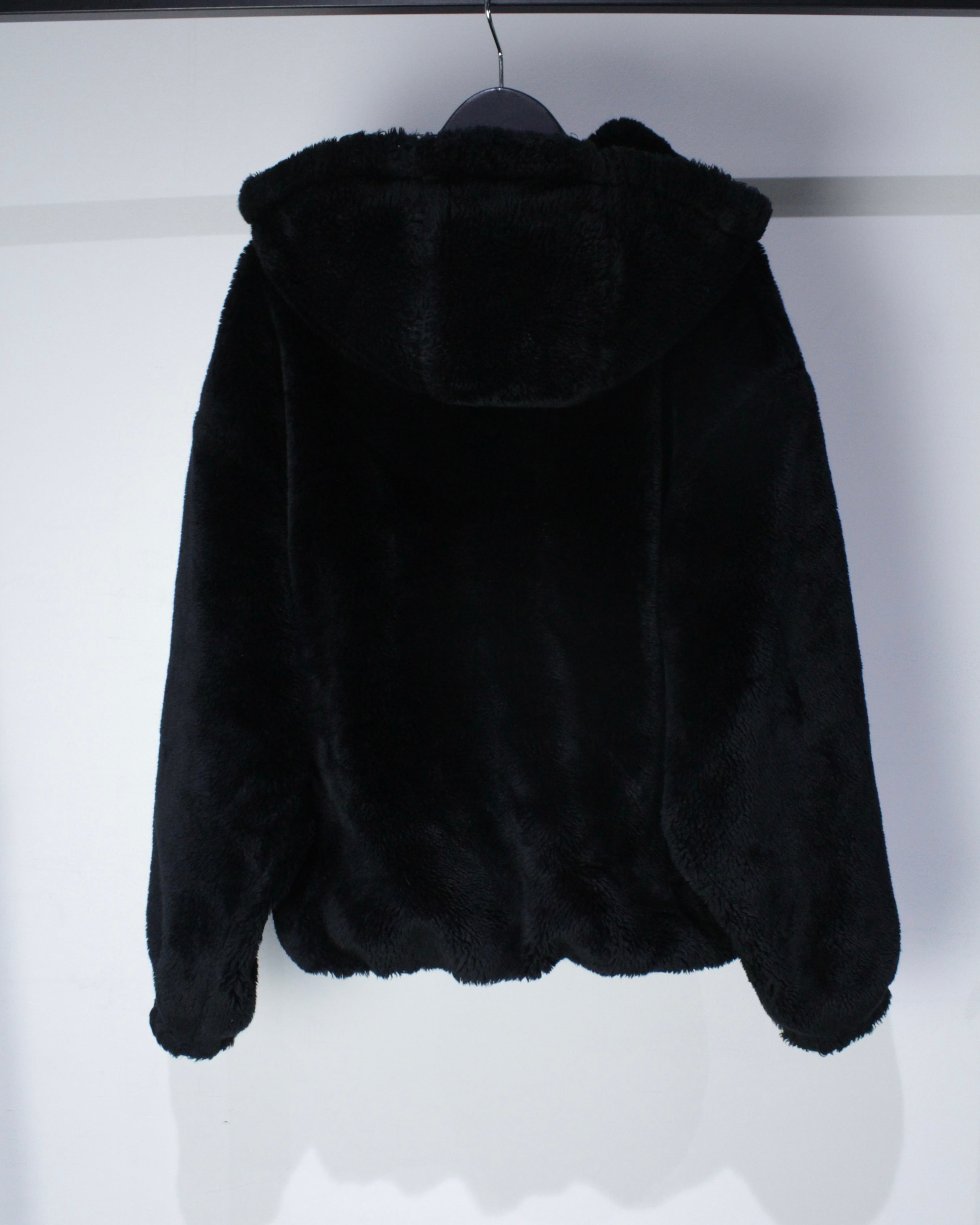 毛足の流れが美しい高密度フェイクファーを採用した、ジップアップフーディジャケット。