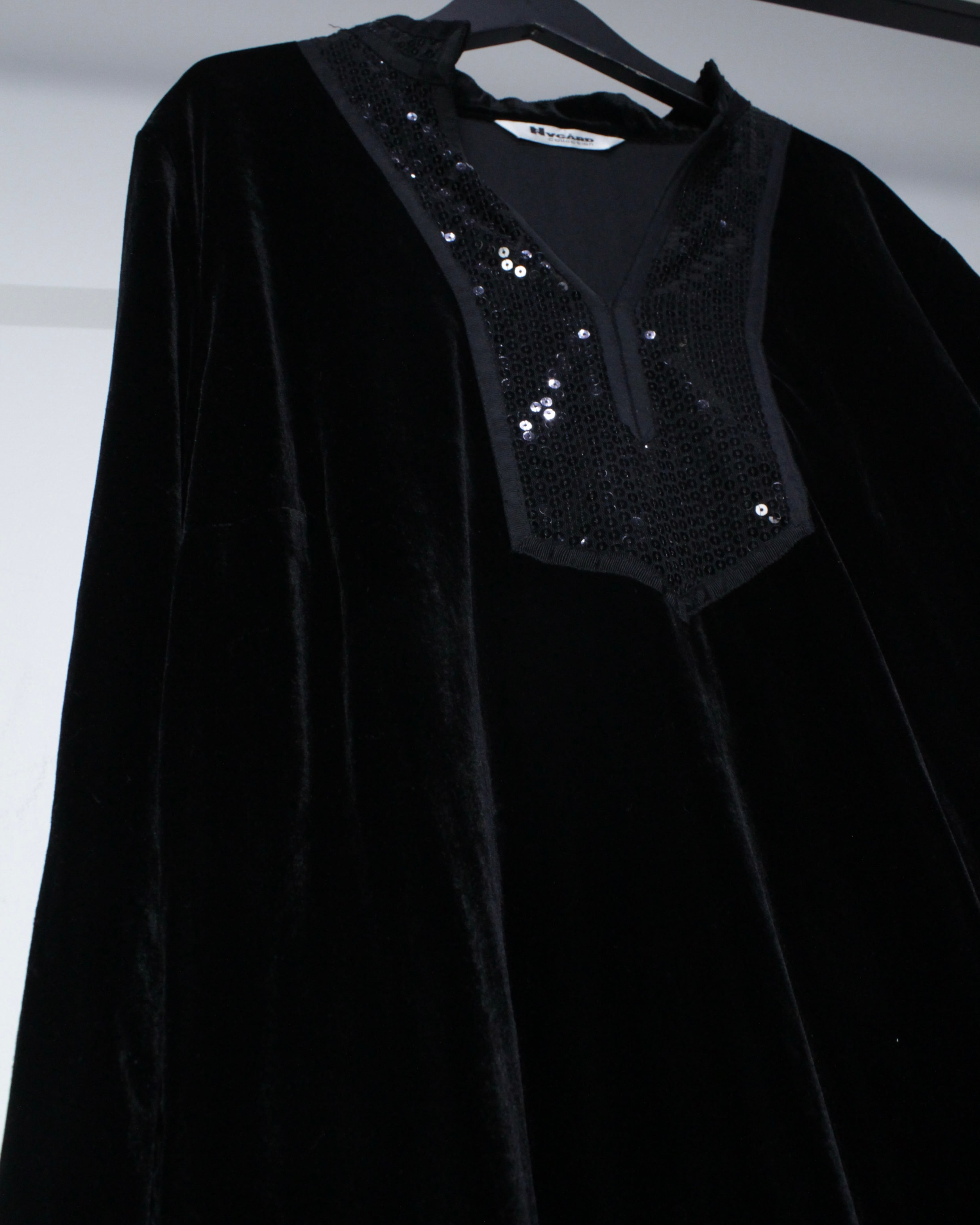 深く沈むようなブラックベロアに、繊細なスパンコール刺繍がリズミカルに輝くスキッパーシャツ。