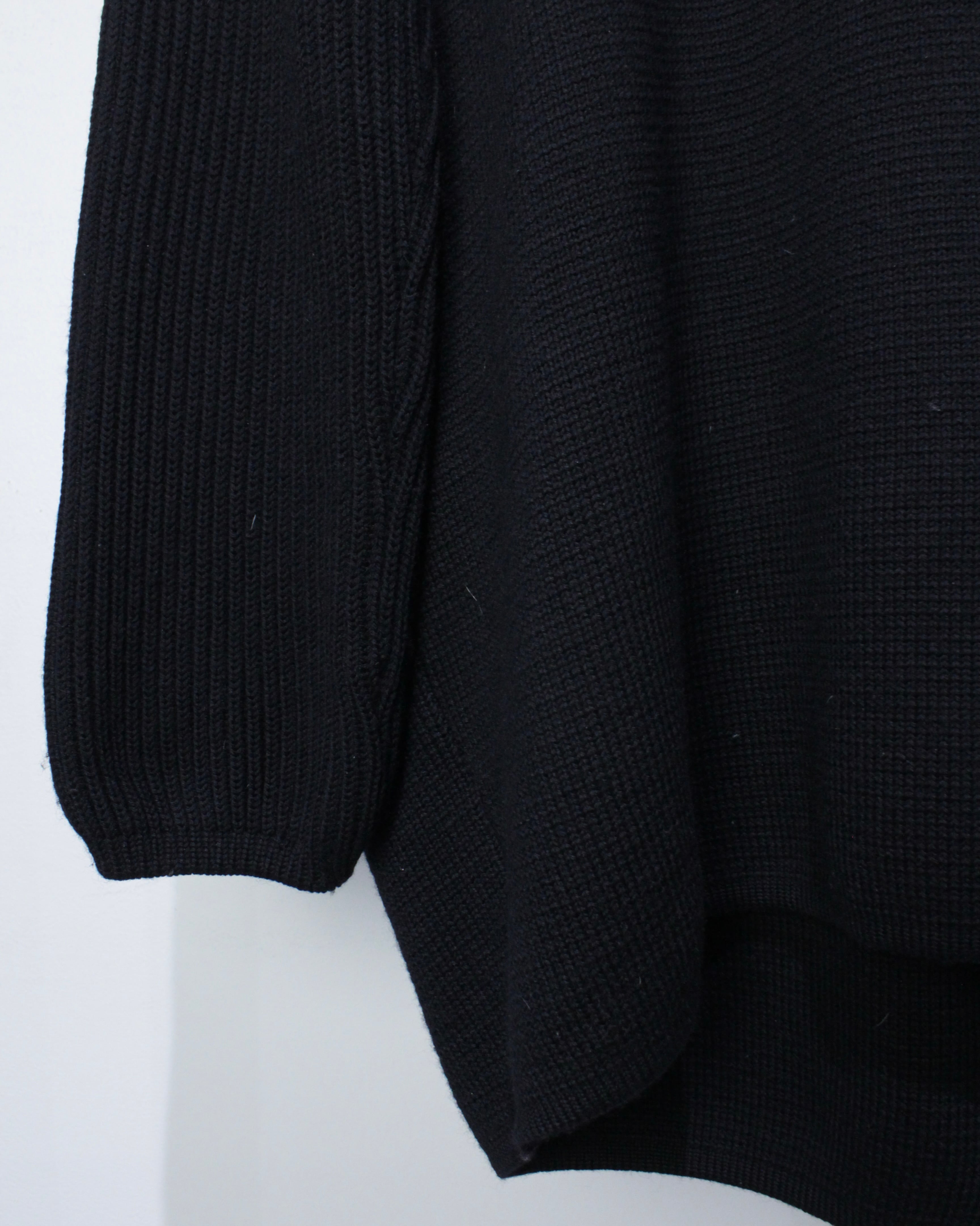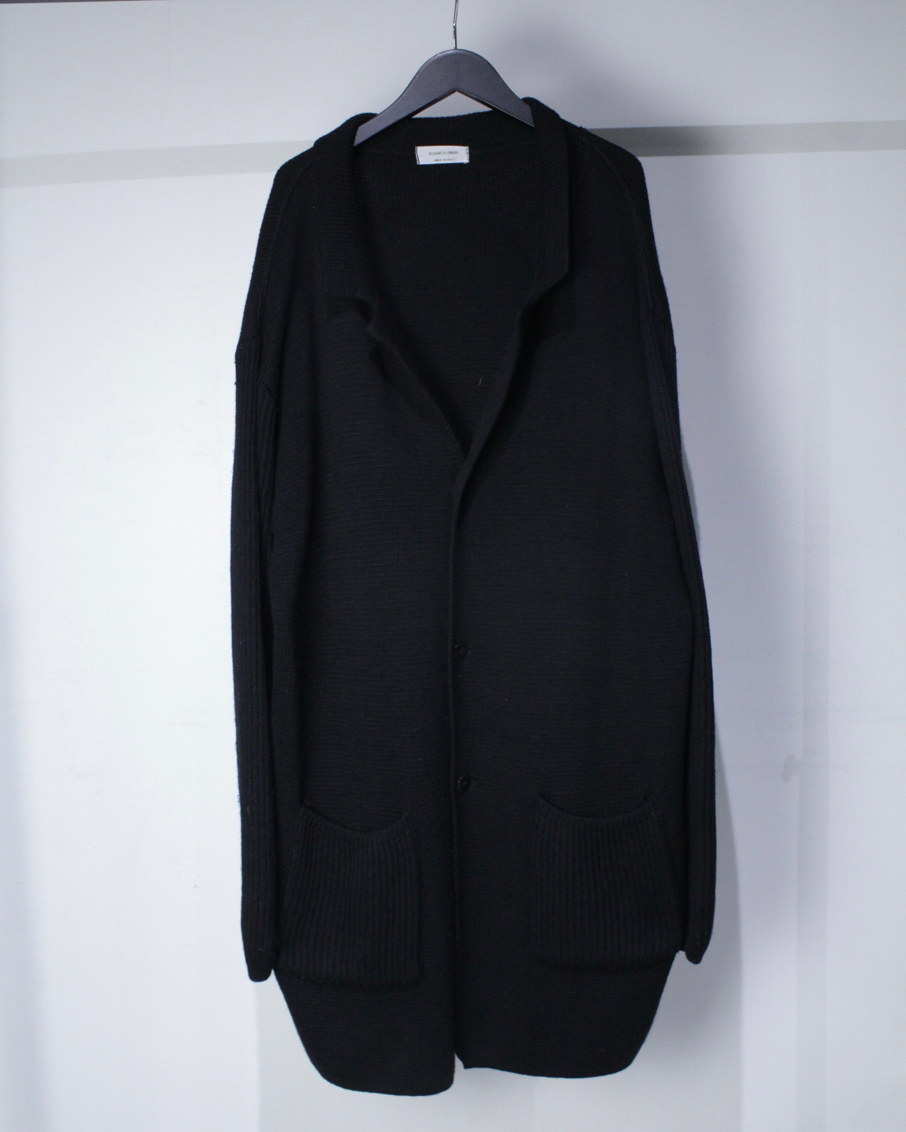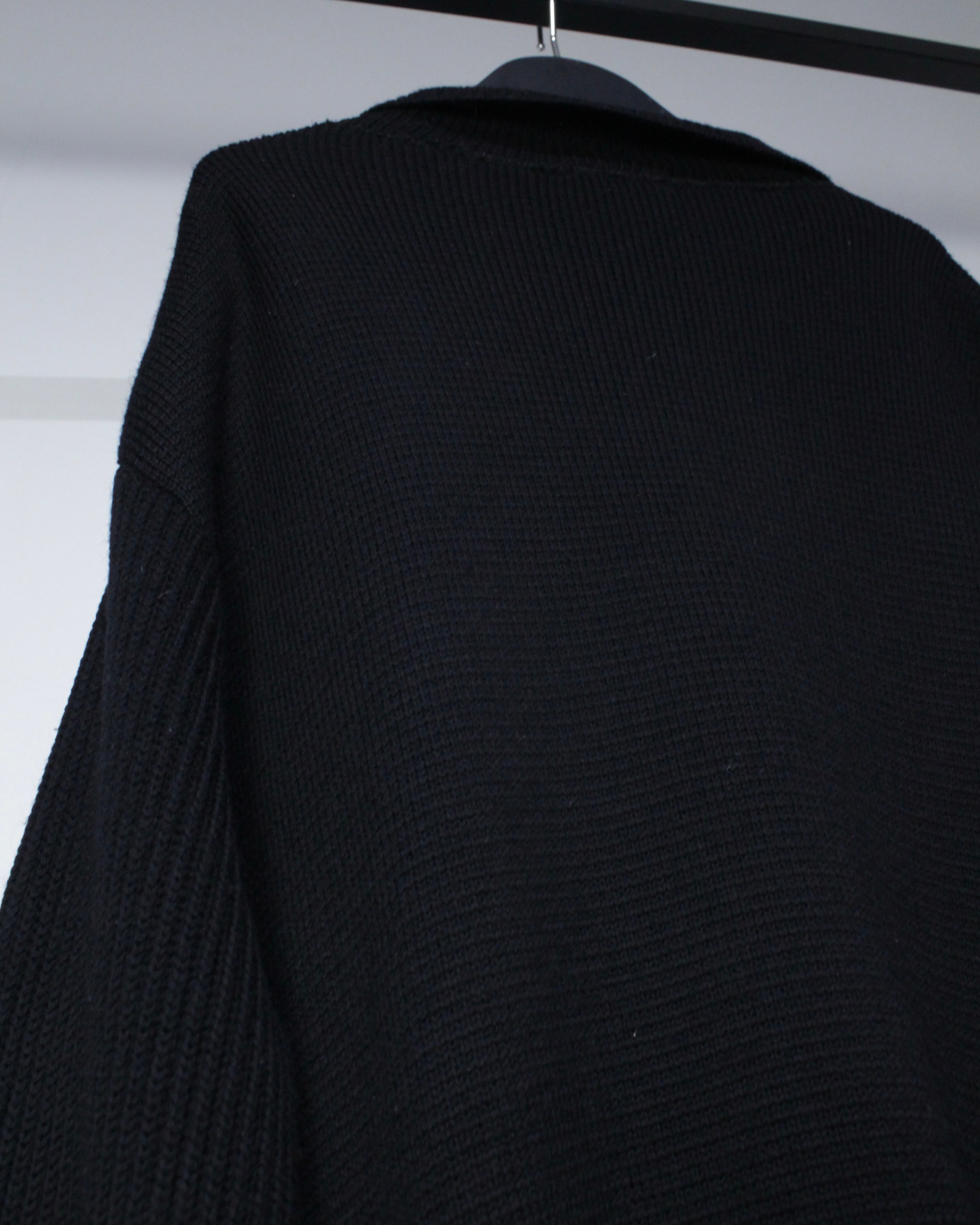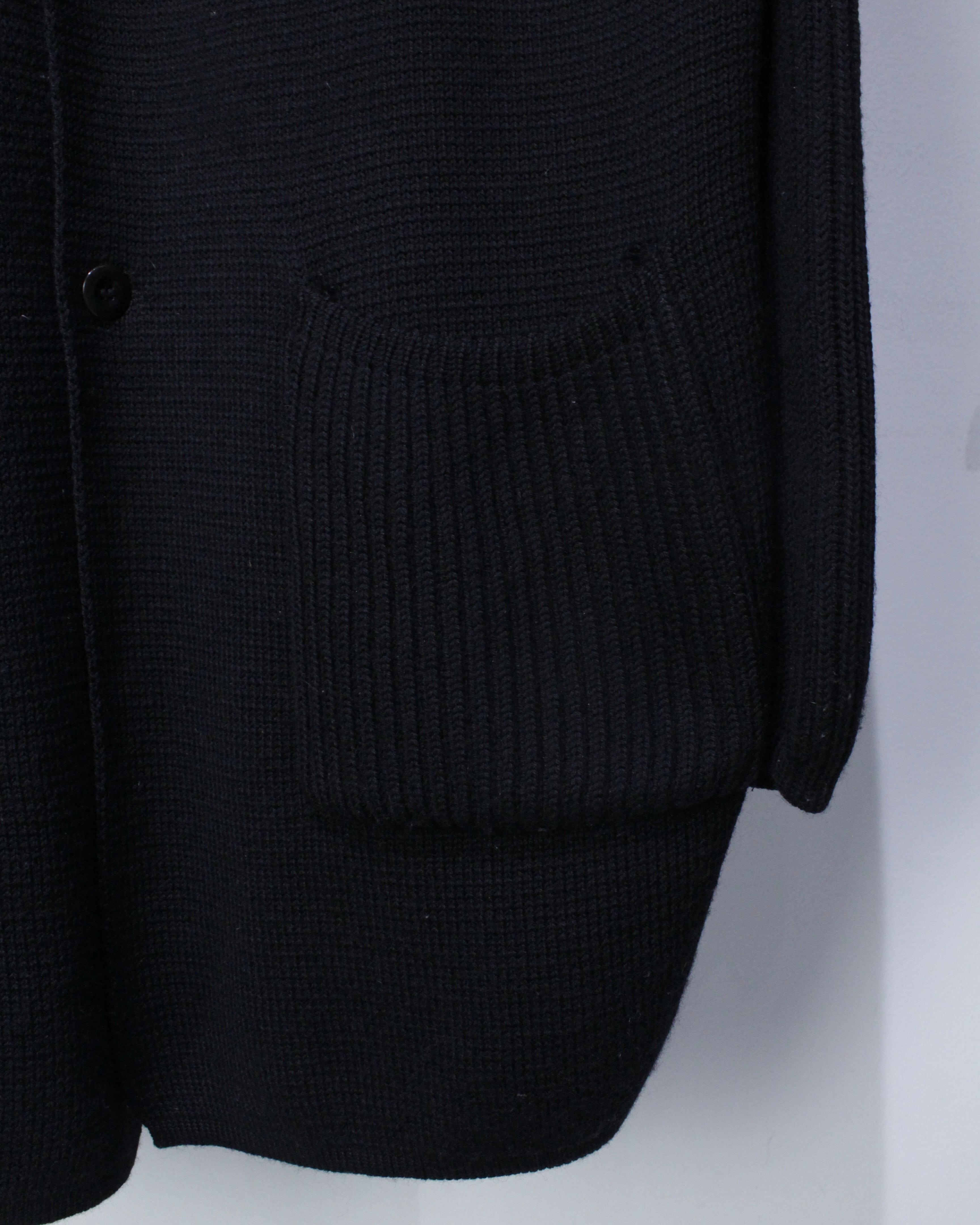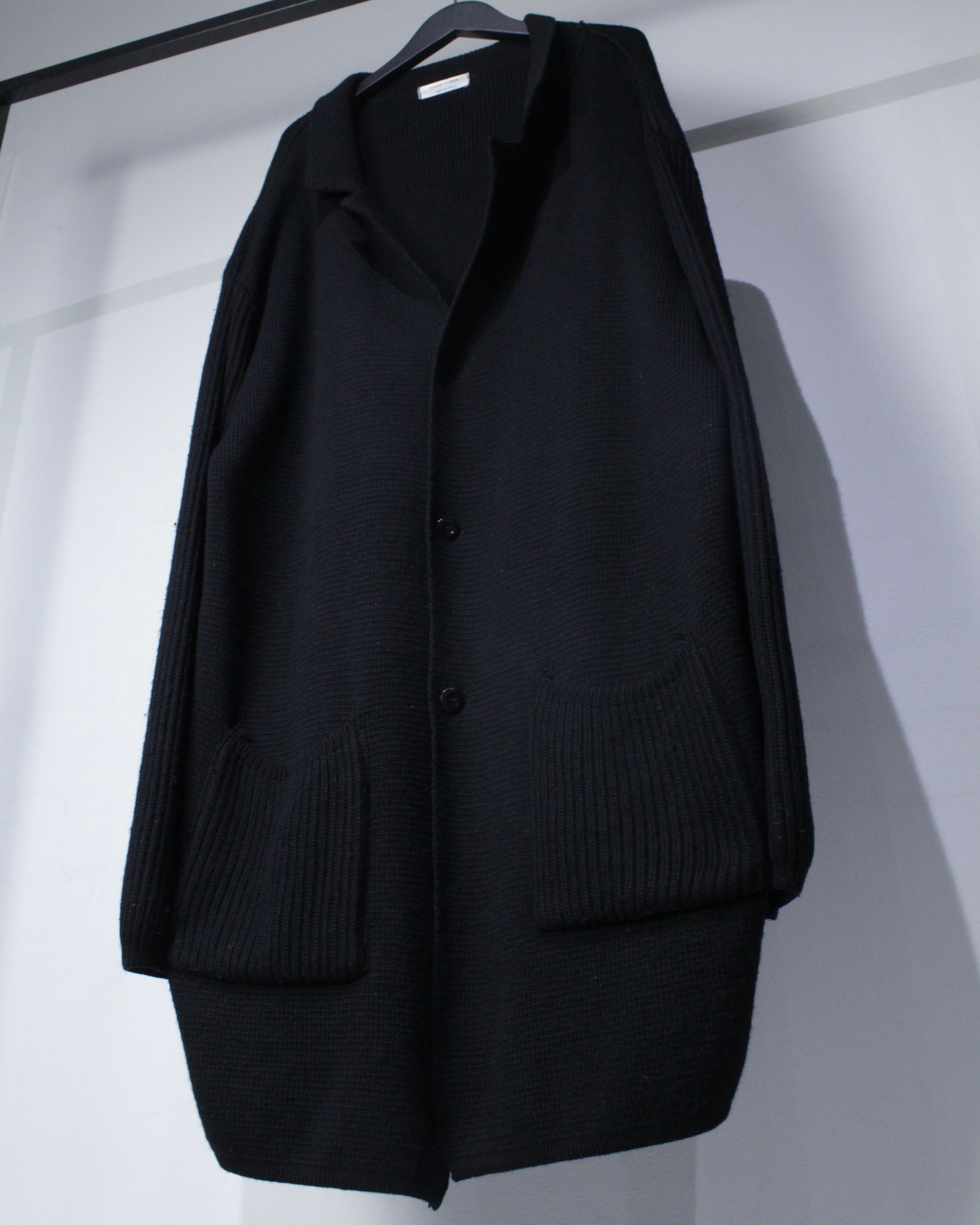 イタリアメイドならではの緻密な編み立てと、上質なウールのしなやかさが共鳴し、身体のラインに沿って自然に落ちるシルエットを形成。襟や袖、ポケットにはリブ編みの切り替えが入り、視覚的にもリズムを与えるとともに、全体に奥行きをもたらしています。