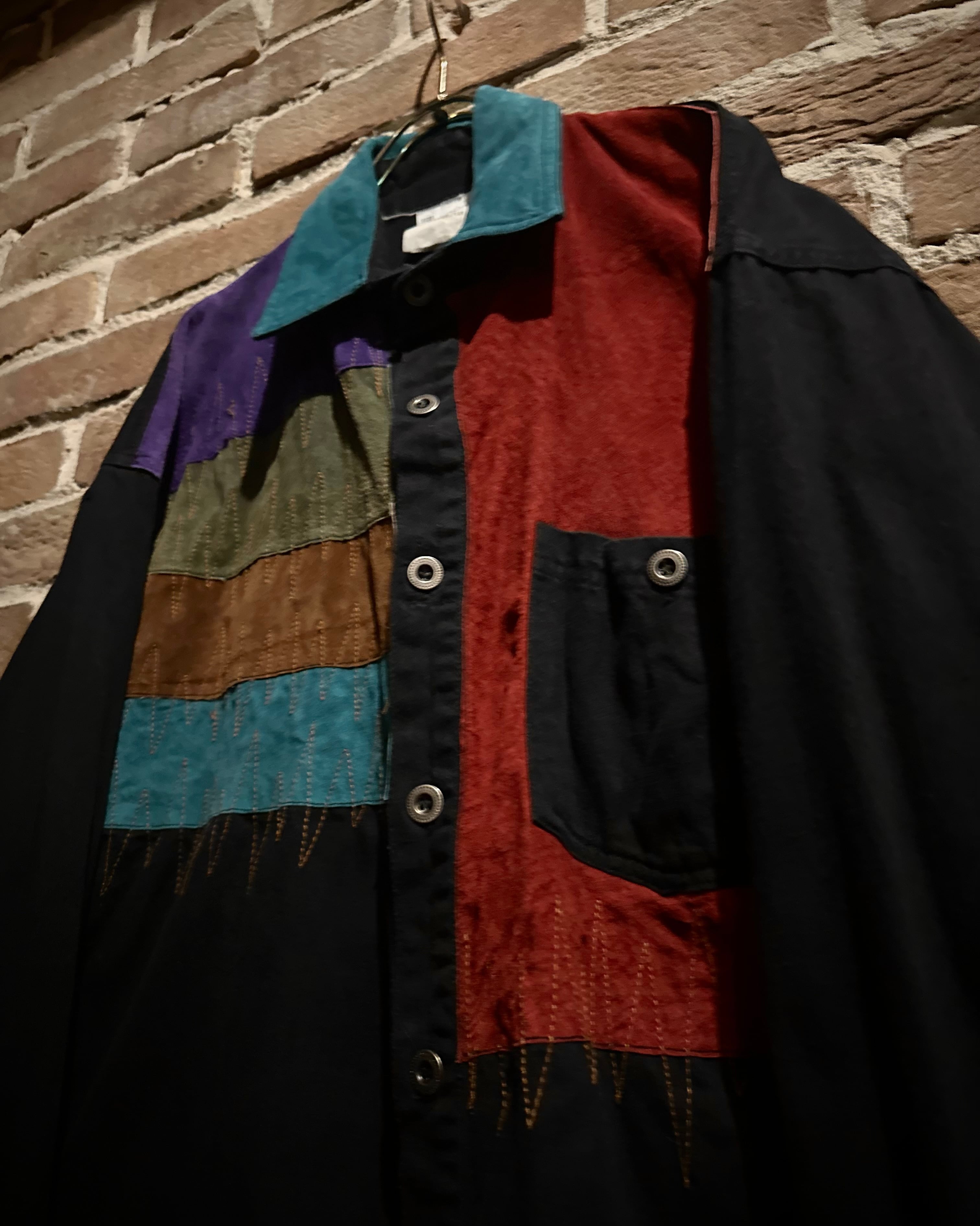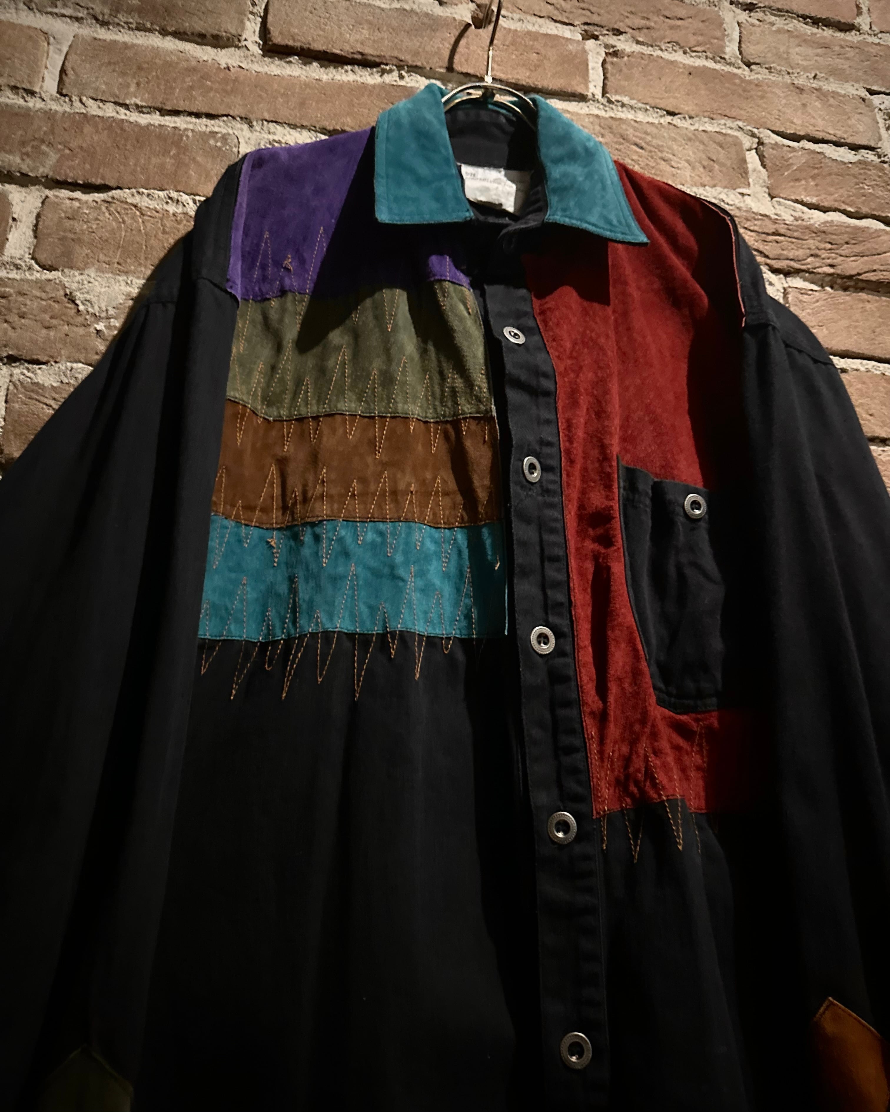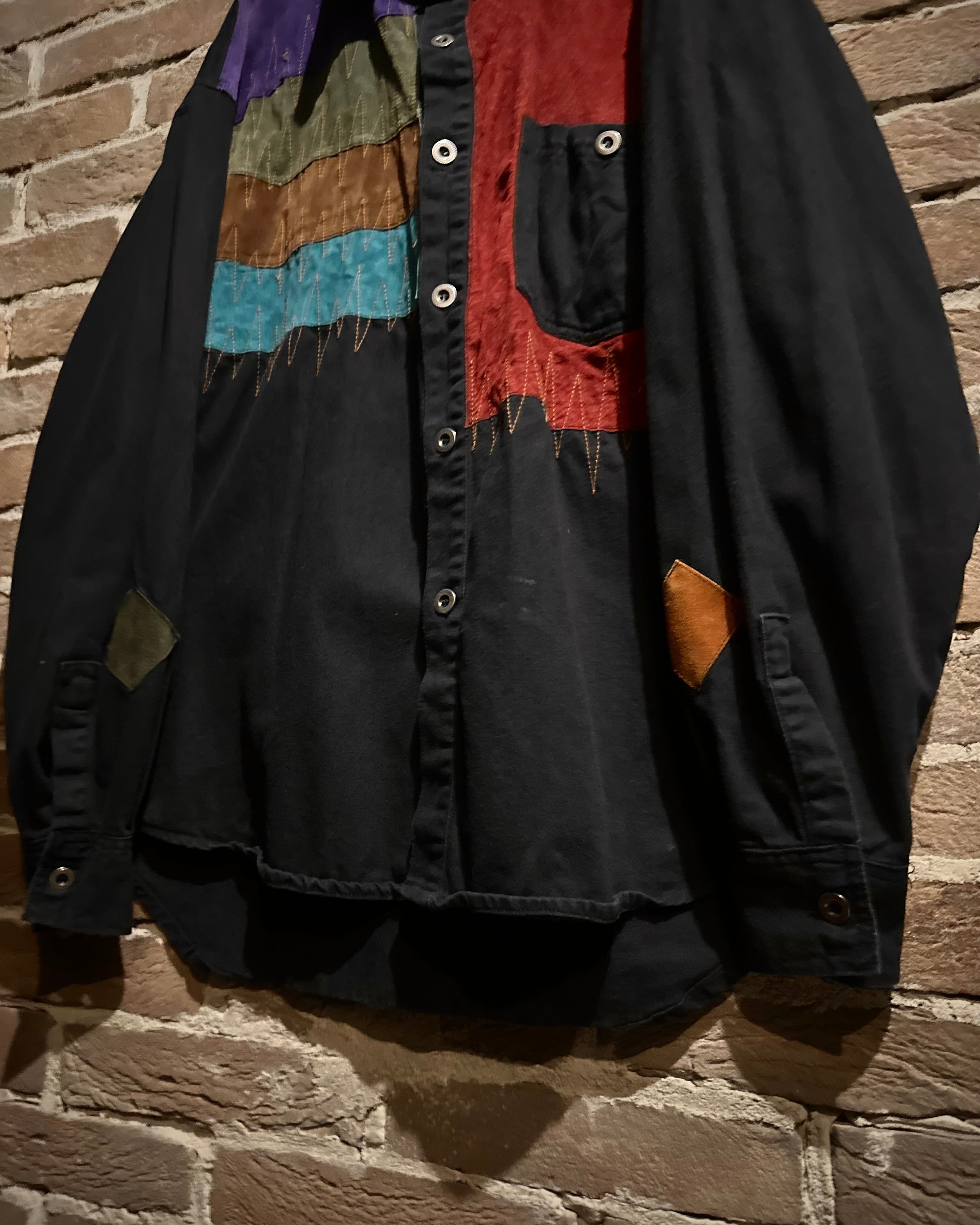 ブラックのコットンボディをベースに、ターコイズ、レッド、オリーブ、キャメル、パープルといったマルチカラーのスエードレザーを切り替えた長袖シャツ。