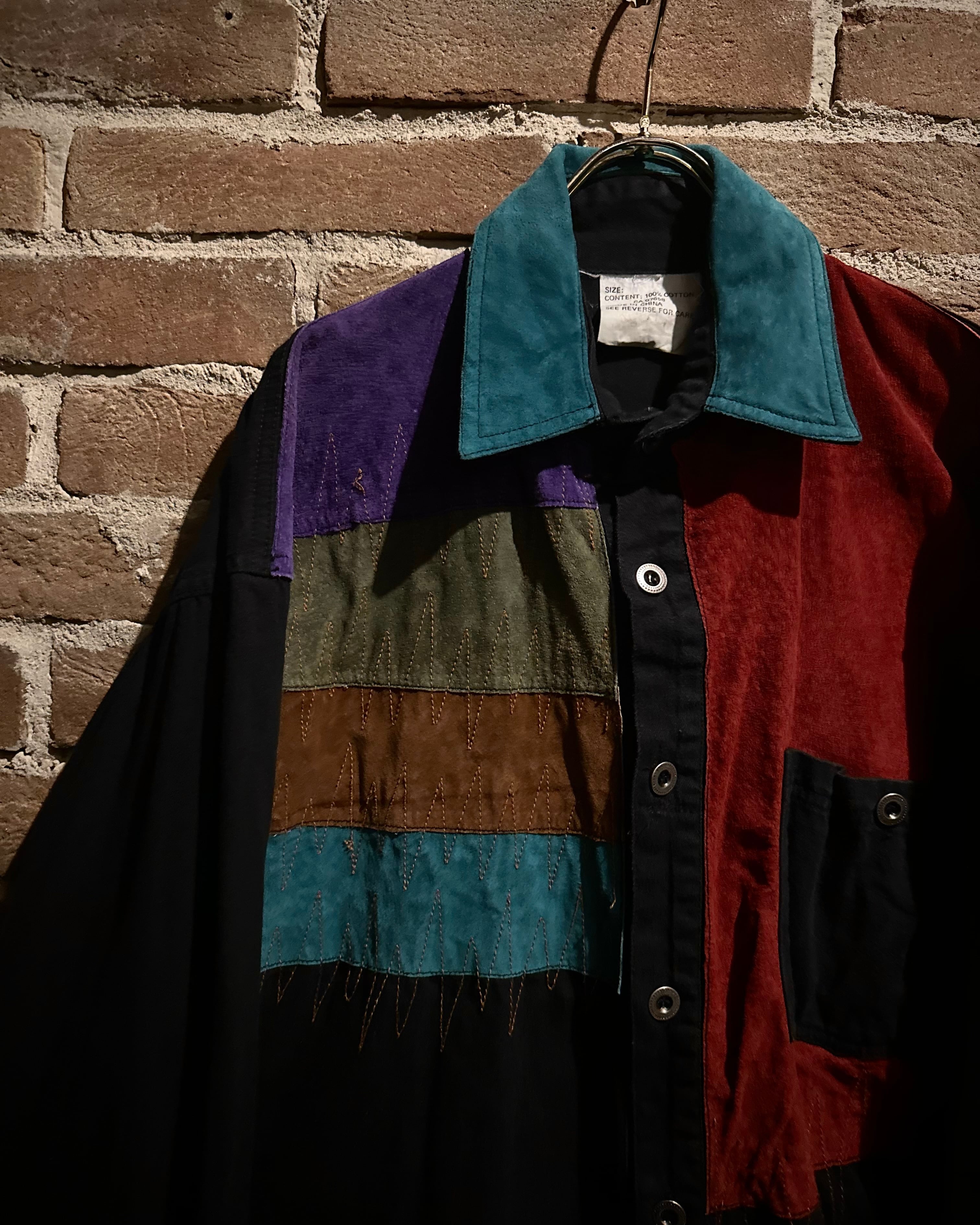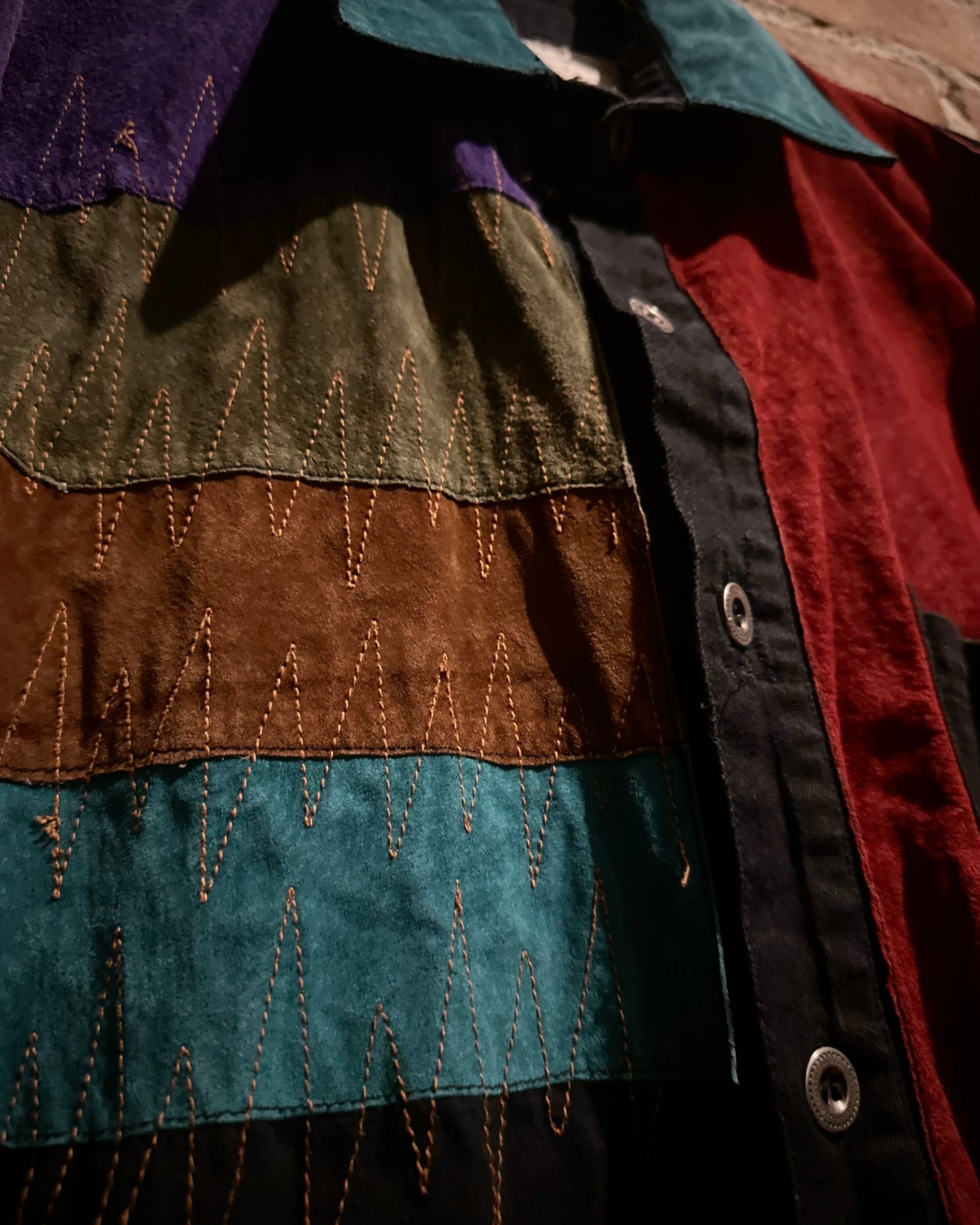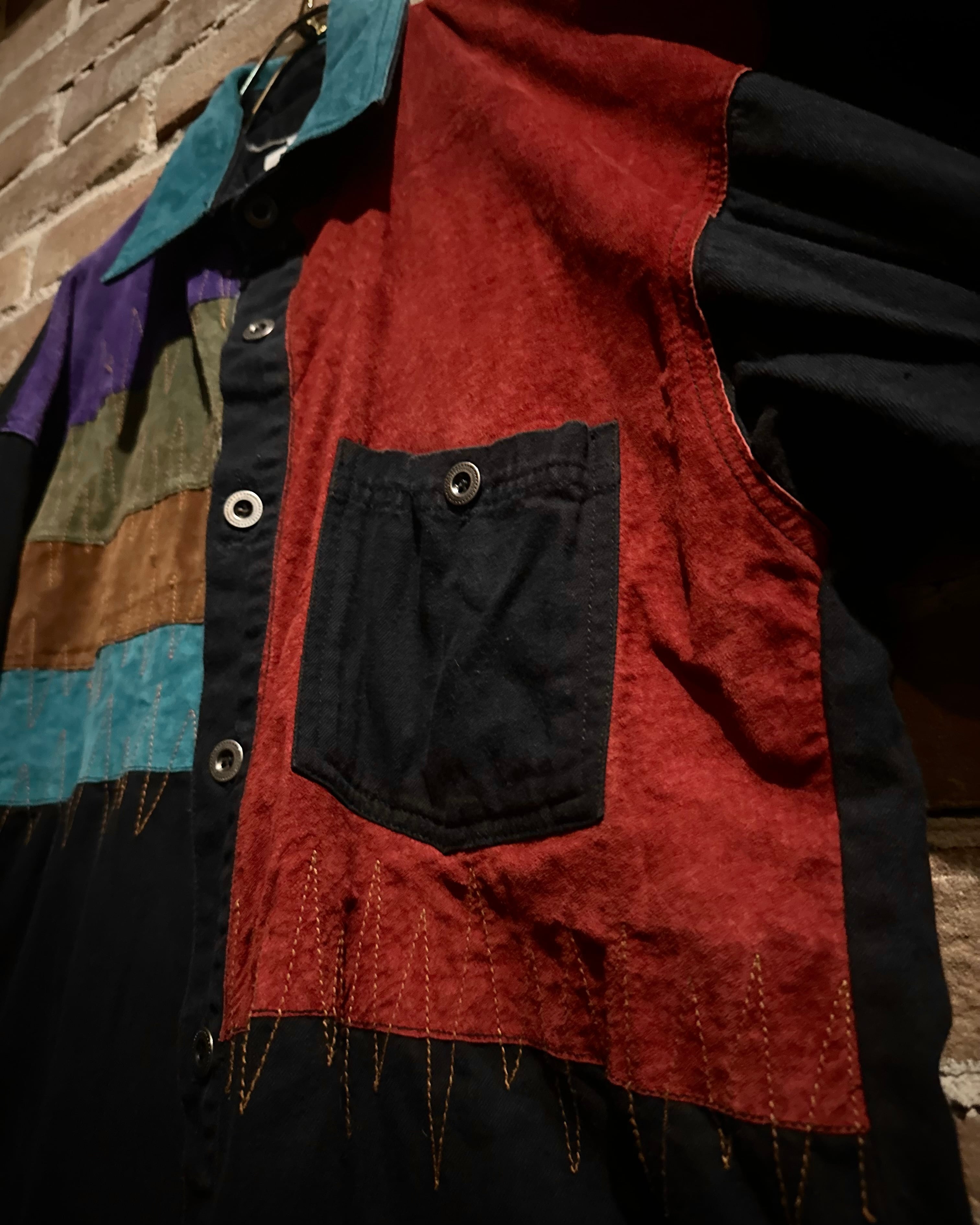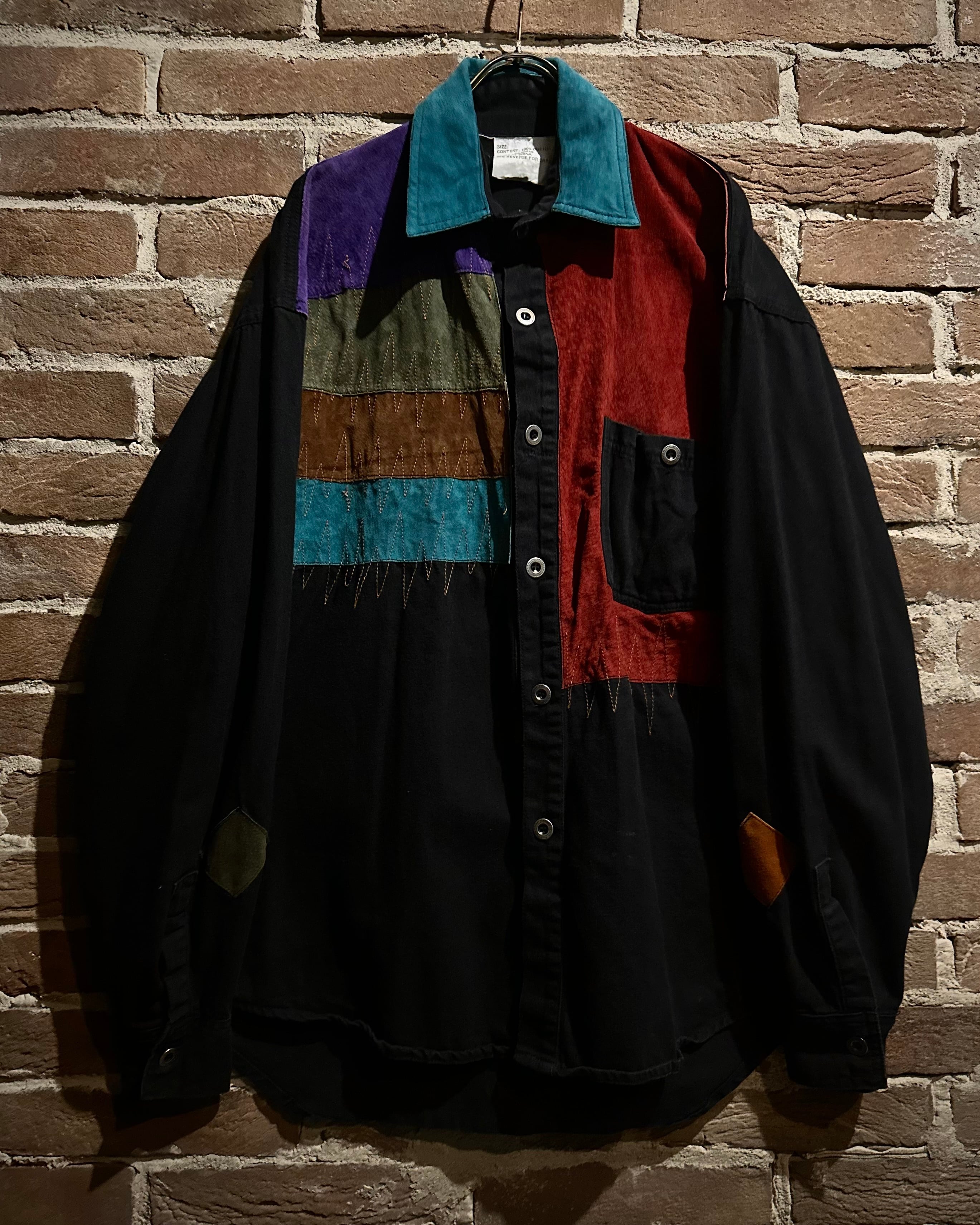 ブラックのコットンボディをベースに、ターコイズ、レッド、オリーブ、キャメル、パープルといったマルチカラーのスエードレザーを切り替えた長袖シャツ。