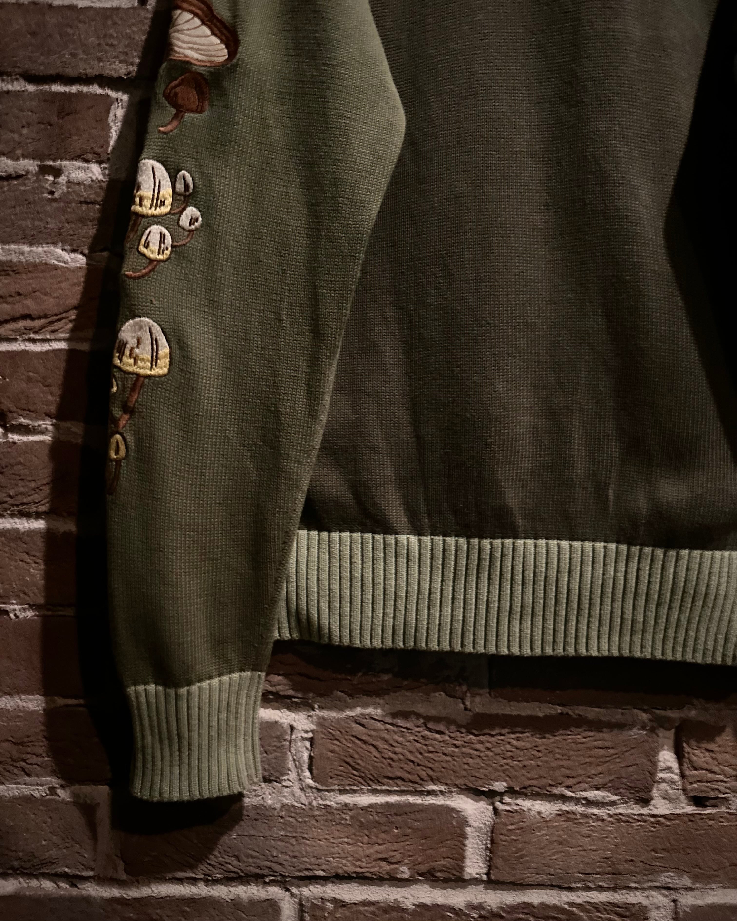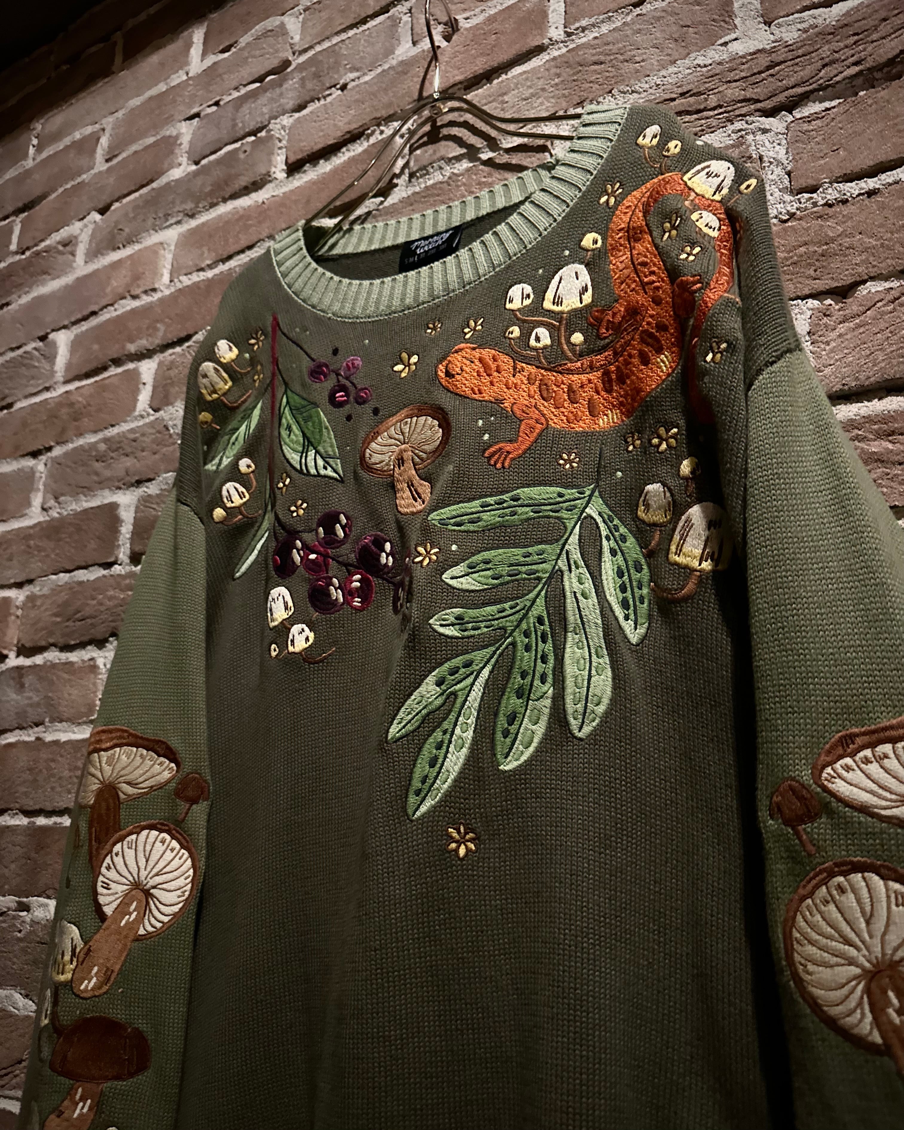胸元にはオレンジのサンショウウオを大胆に配置し、その周囲を囲むようにキノコやベリー、リーフを散りばめた構成。刺繍糸は光沢のある糸で織り上げられ、立体感と陰影が美しく浮かび上がります。グリーン、パープル、ブラウン、イエローなど自然の色彩をそのまま閉じ込めたようなカラーパレットも魅力的。