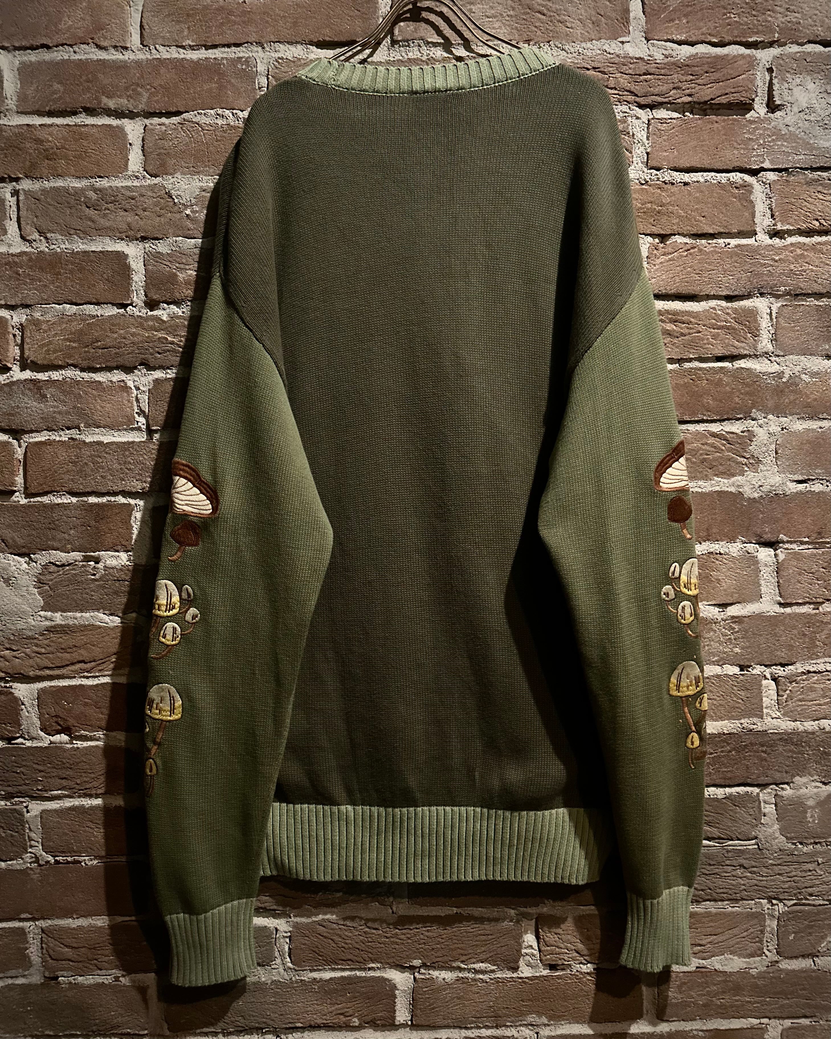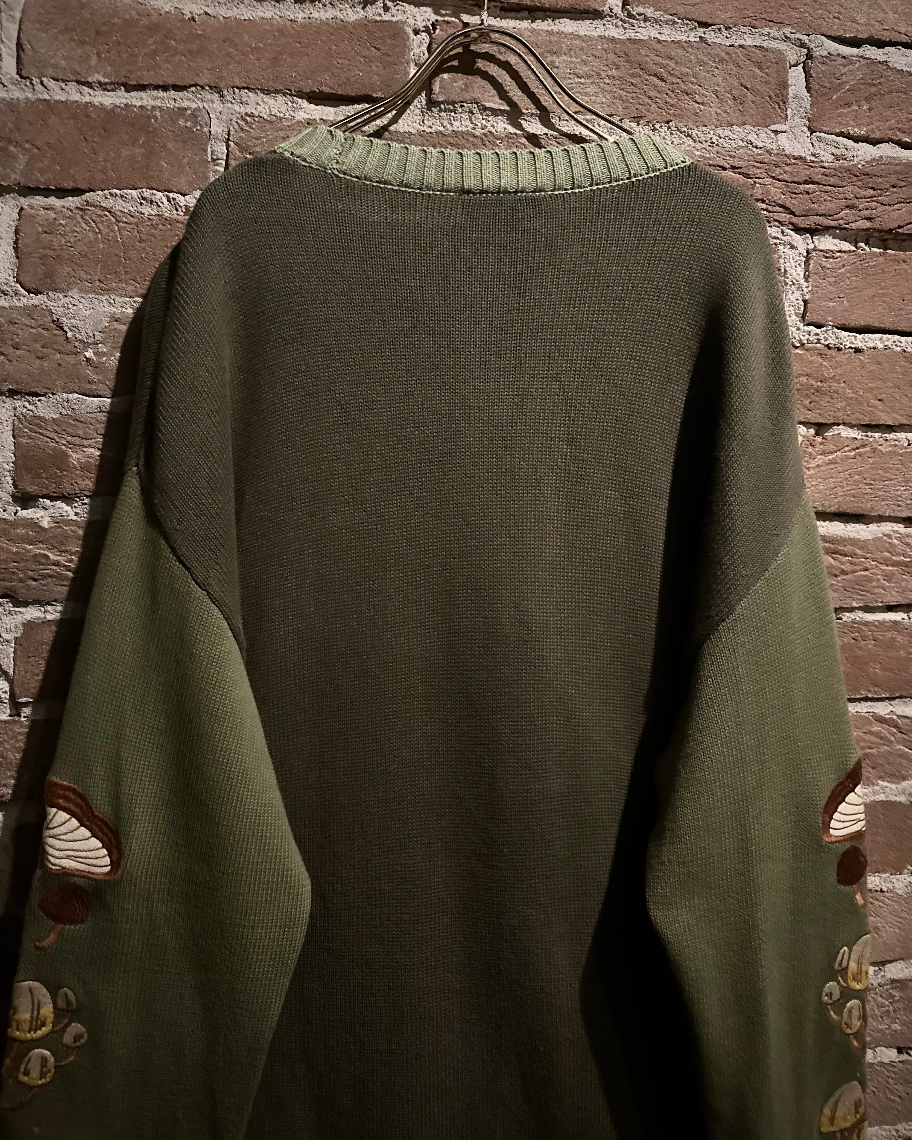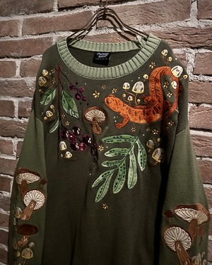 淡いオリーブグリーンのボディに、自然モチーフの刺繍が施されたニット。
