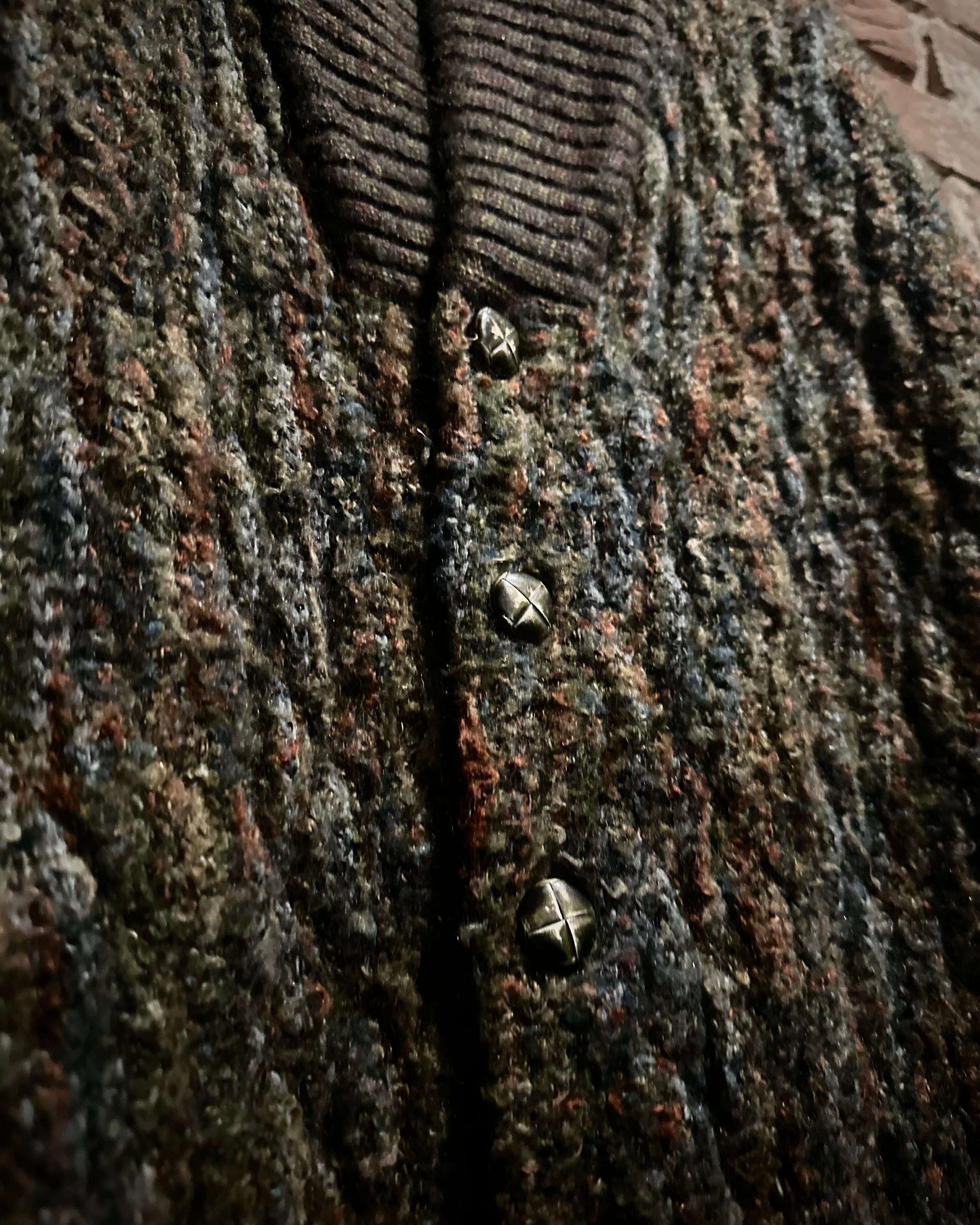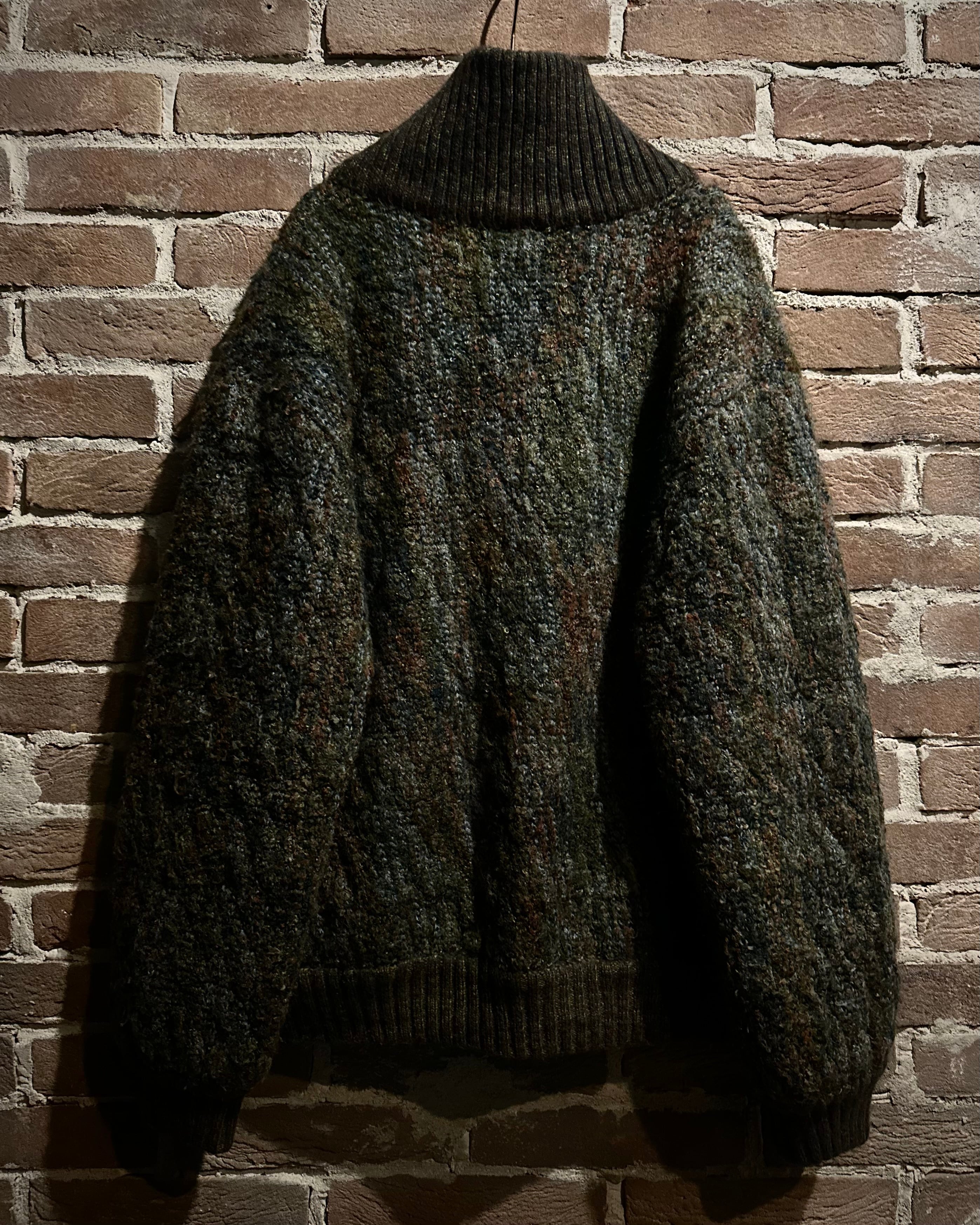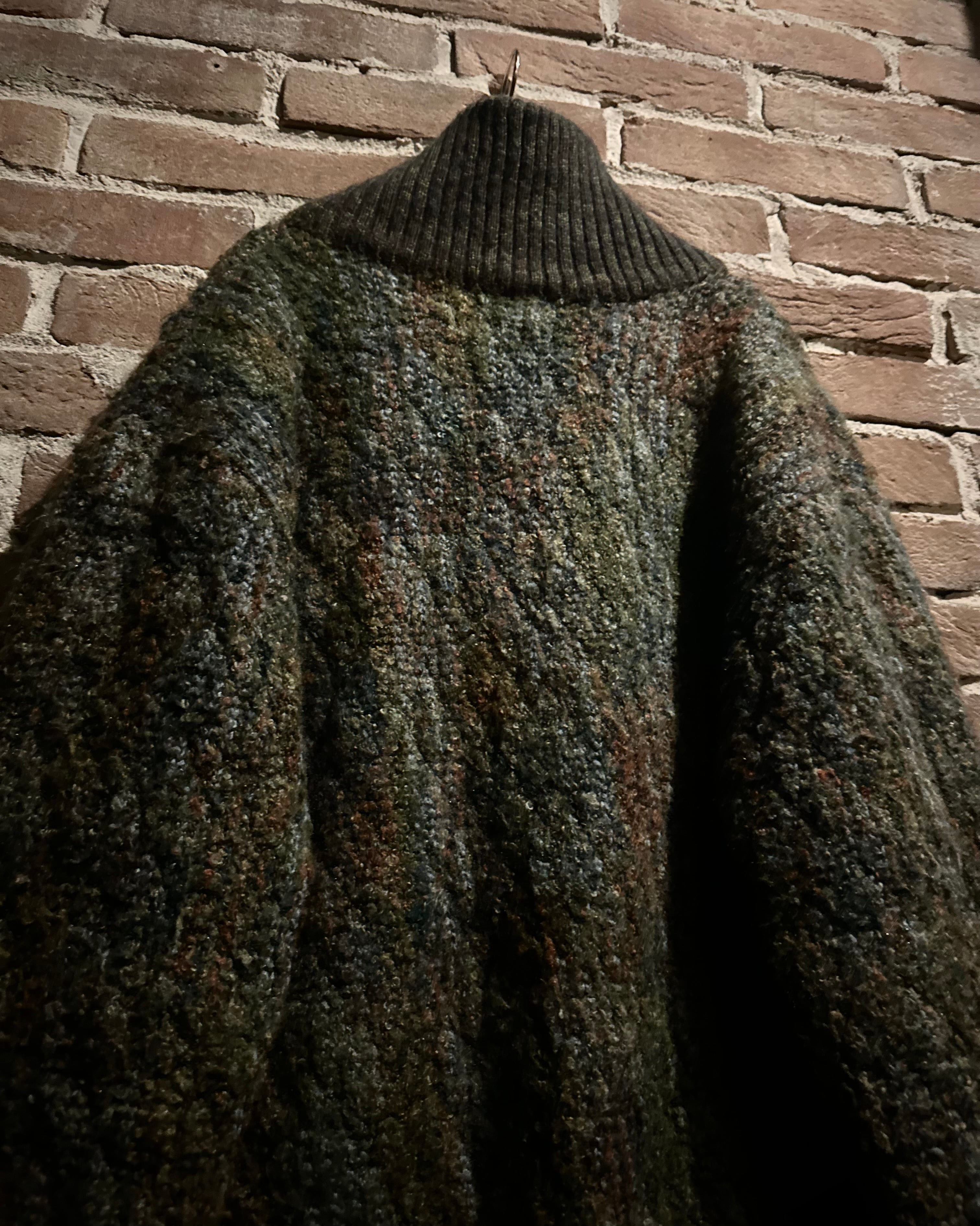 全体には深みのあるオリーブブラウンを基調に、グリーン、オレンジ、ブルーなどの糸を絶妙なバランスでミックス。単なる多色ニットではなく、角度や光の具合によって見え方が変化する立体的な色彩構成が見事。繊細なウールが織りなす陰影が、温かみと高級感を両立させています。