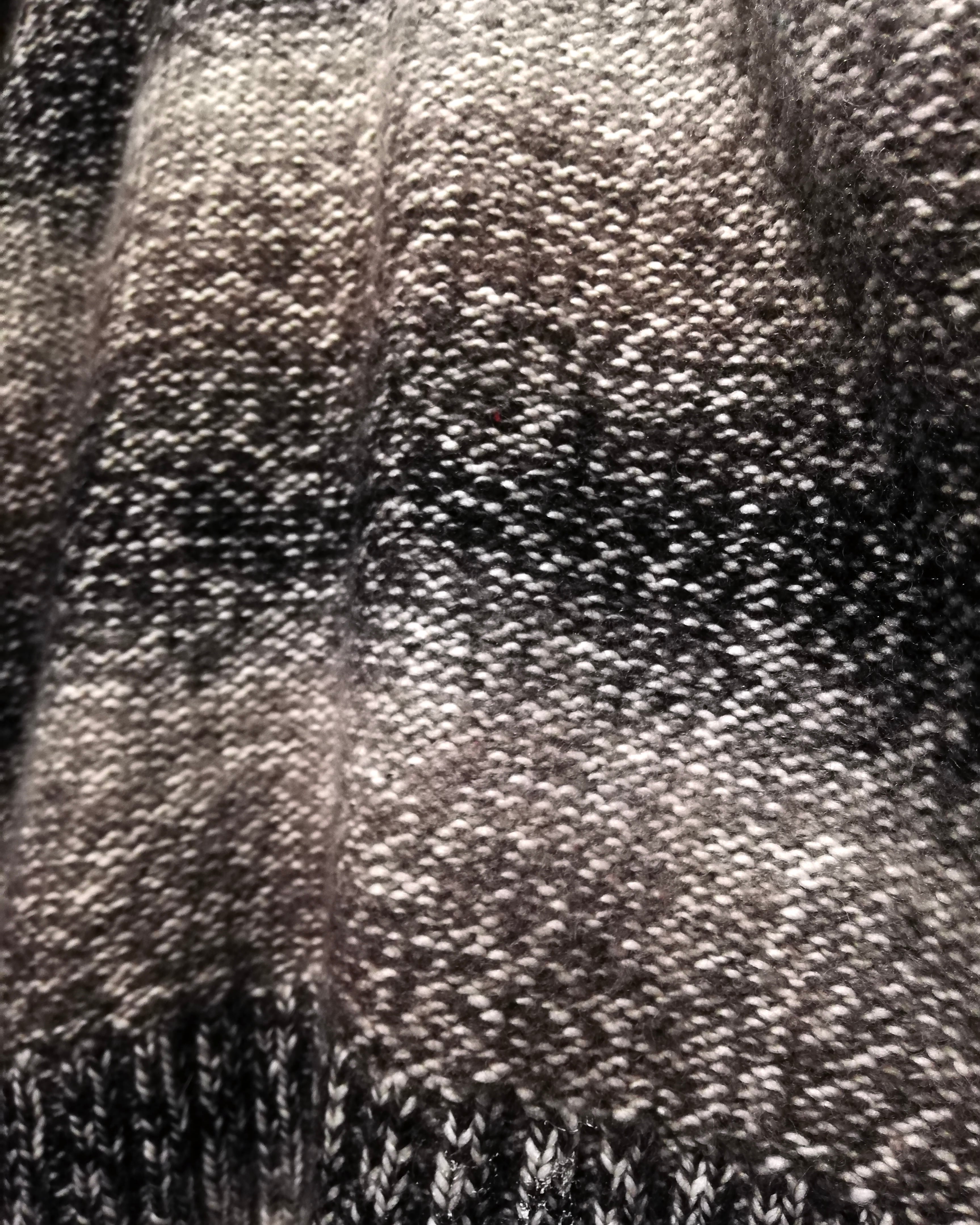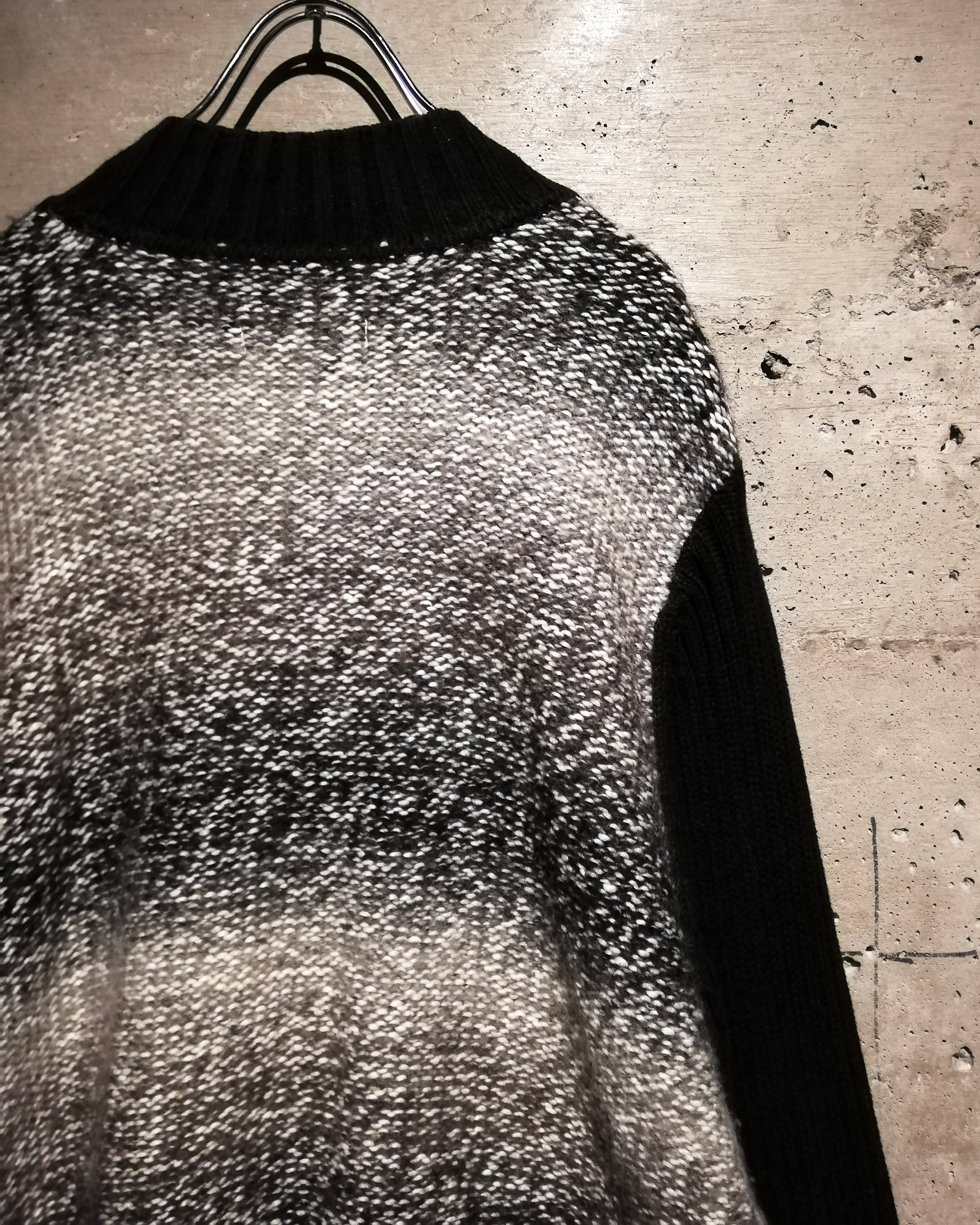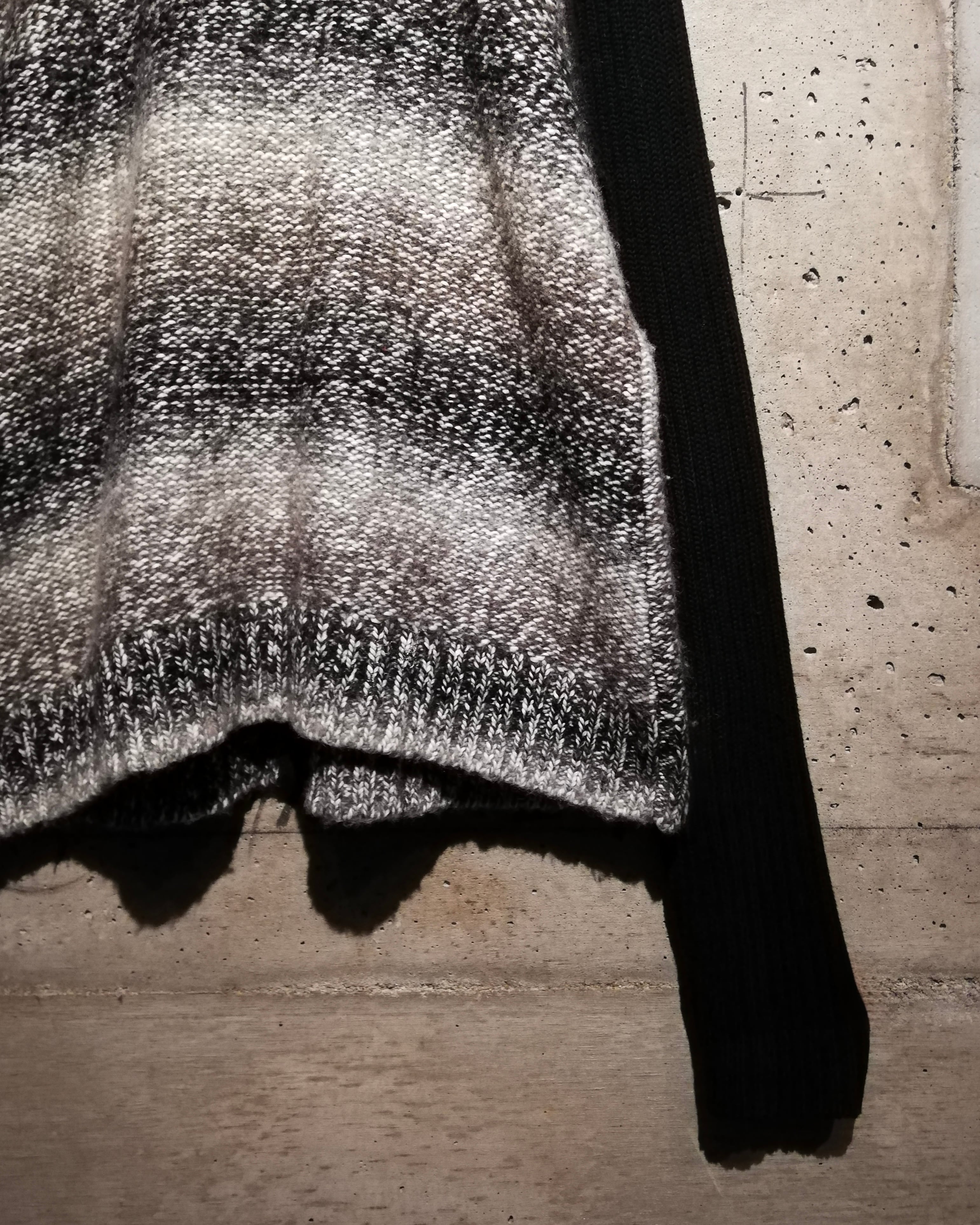 身頃はウール、ナイロン、アクリル混紡による柔らかく保温性の高い質感のボディを採用。袖や首周りなどは黒無地のコットン100%のニットで切り替えることで、デザインにアクセントをプラスしています。
