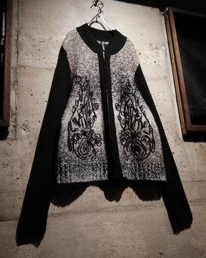 モノトーンのグラデーションが美しいボディに、アーティスティックなリボン刺繍を施したニットジャケット。