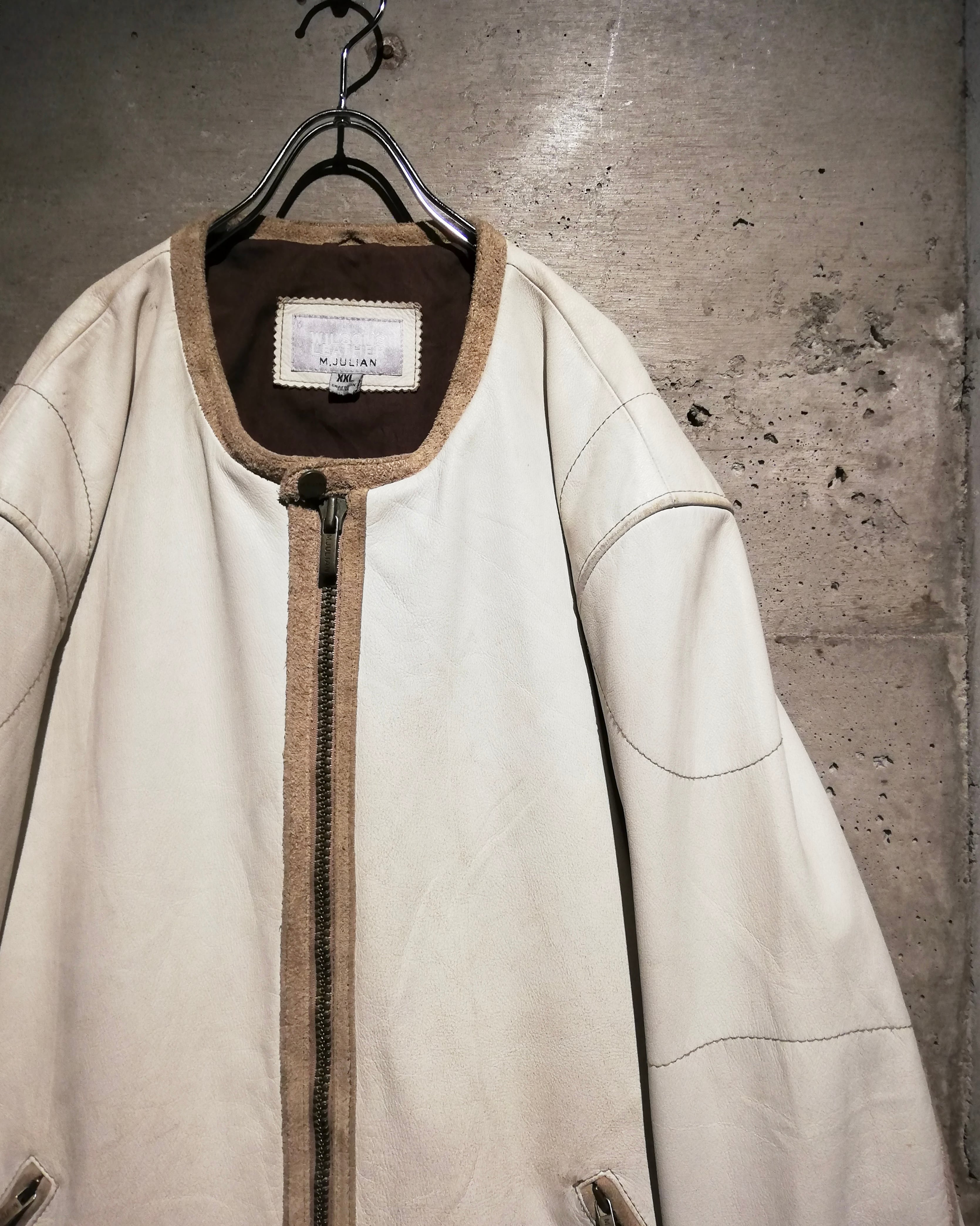 ノーカラー仕様によるクリーンな印象と、レザーの重厚感のあるシルエットが特徴。リラックスしたルーズフィットながら、シャープなカッティングがスタイル全体を引き締めます。