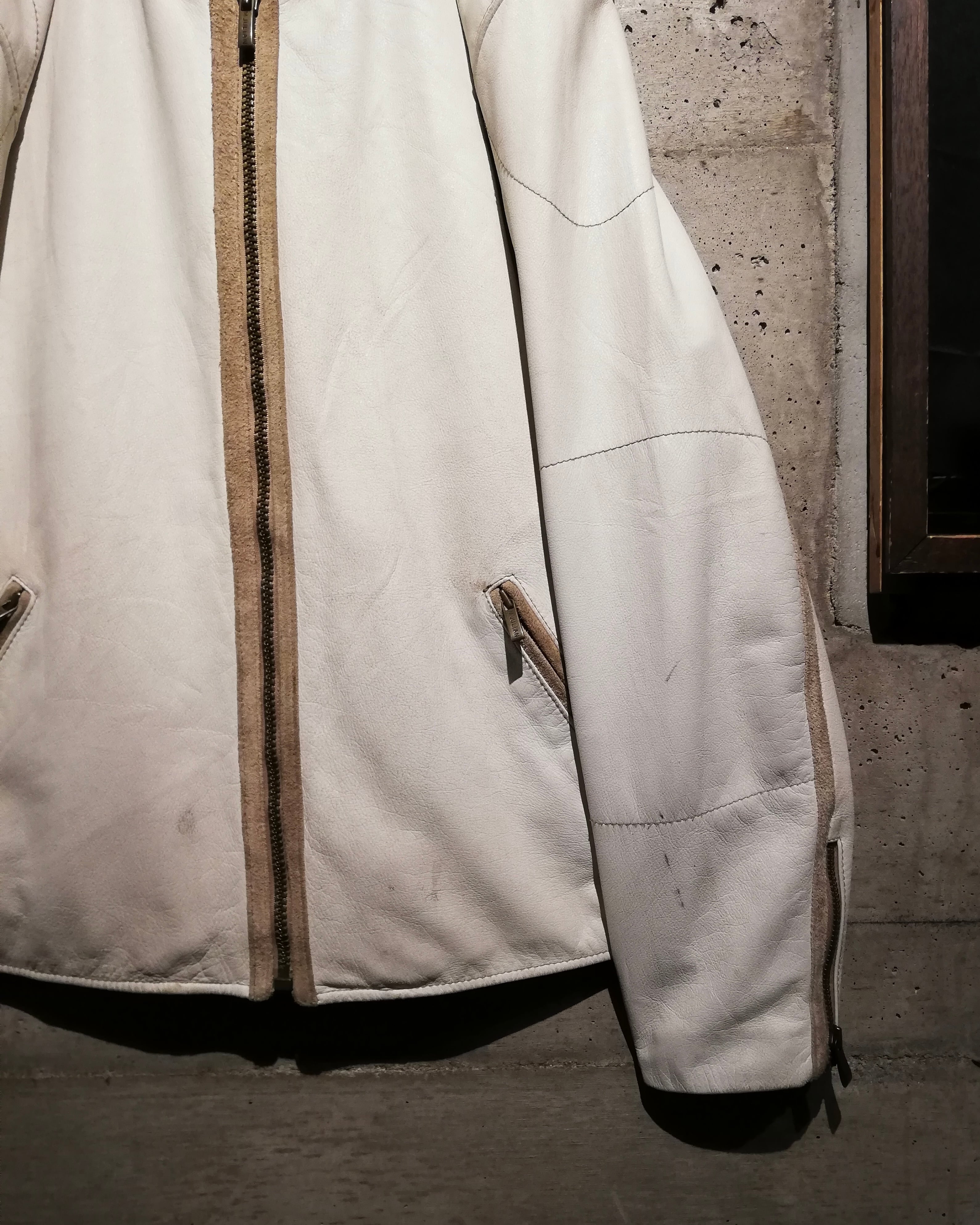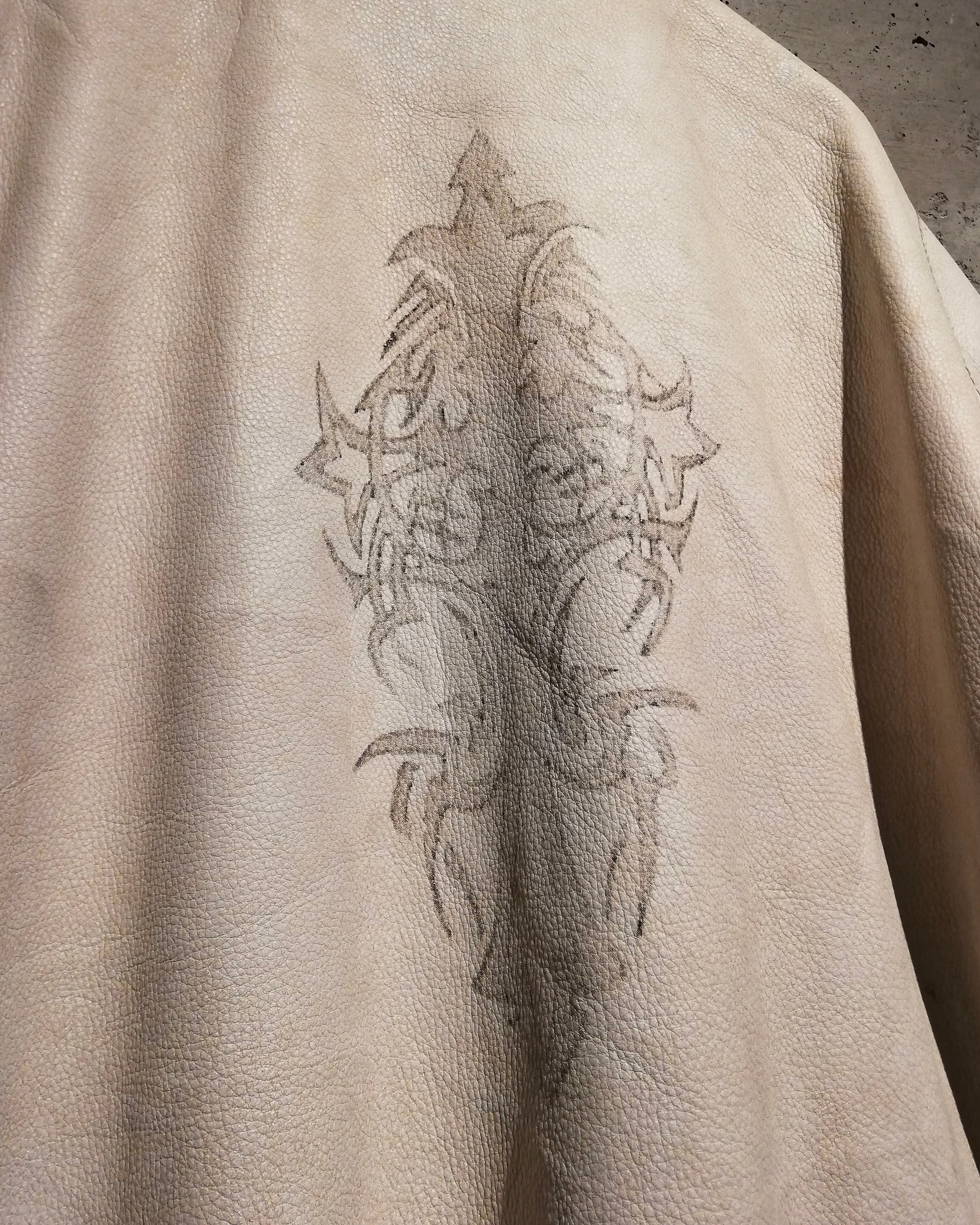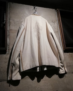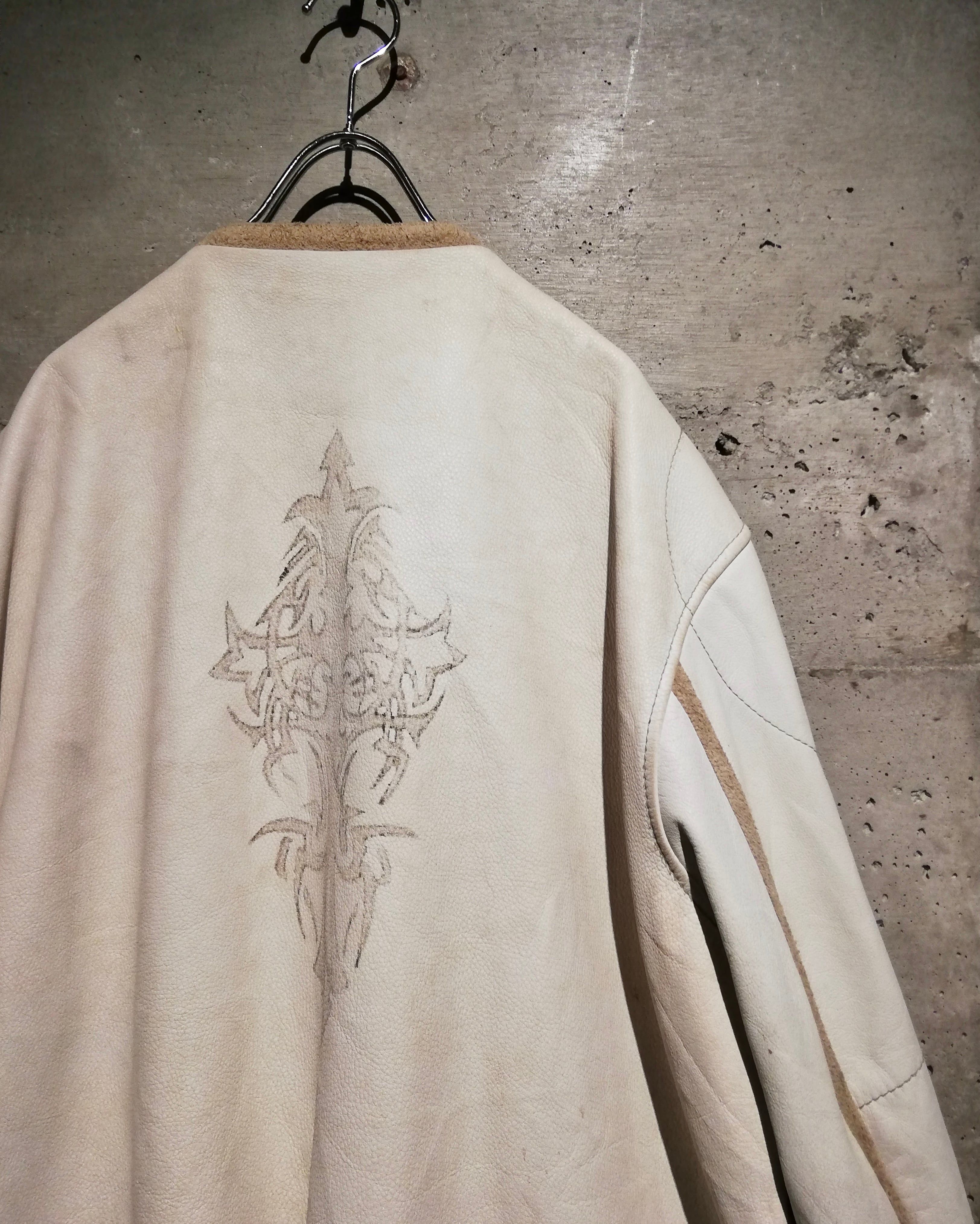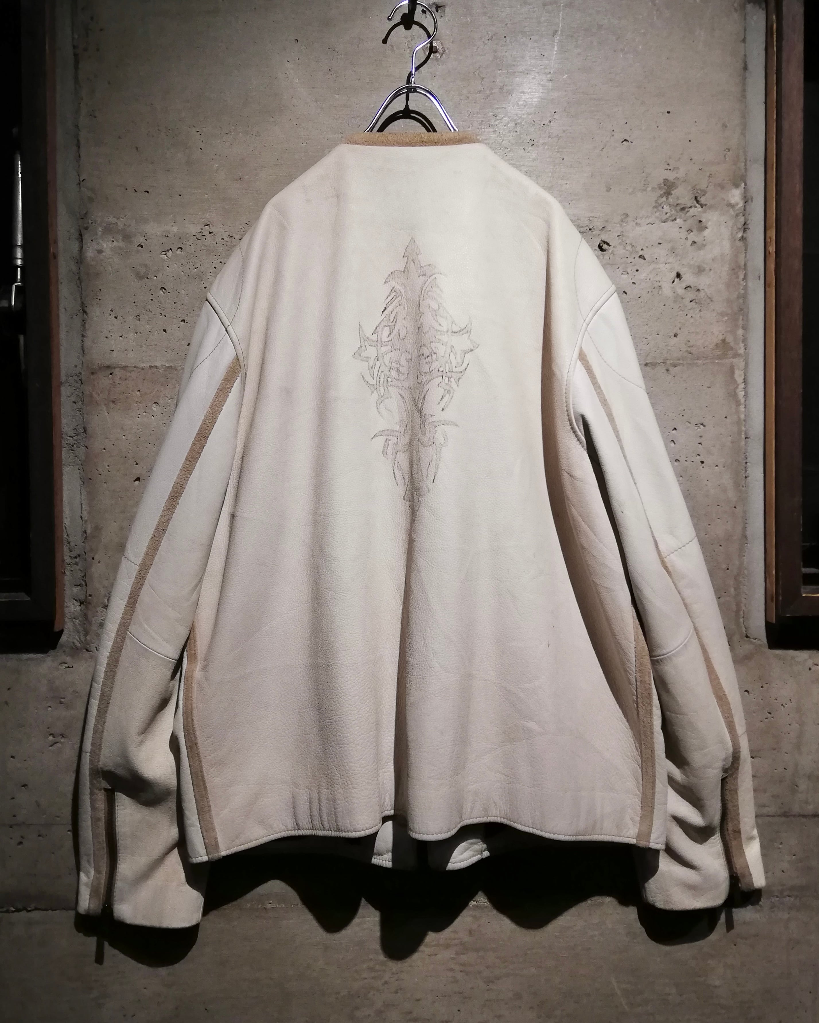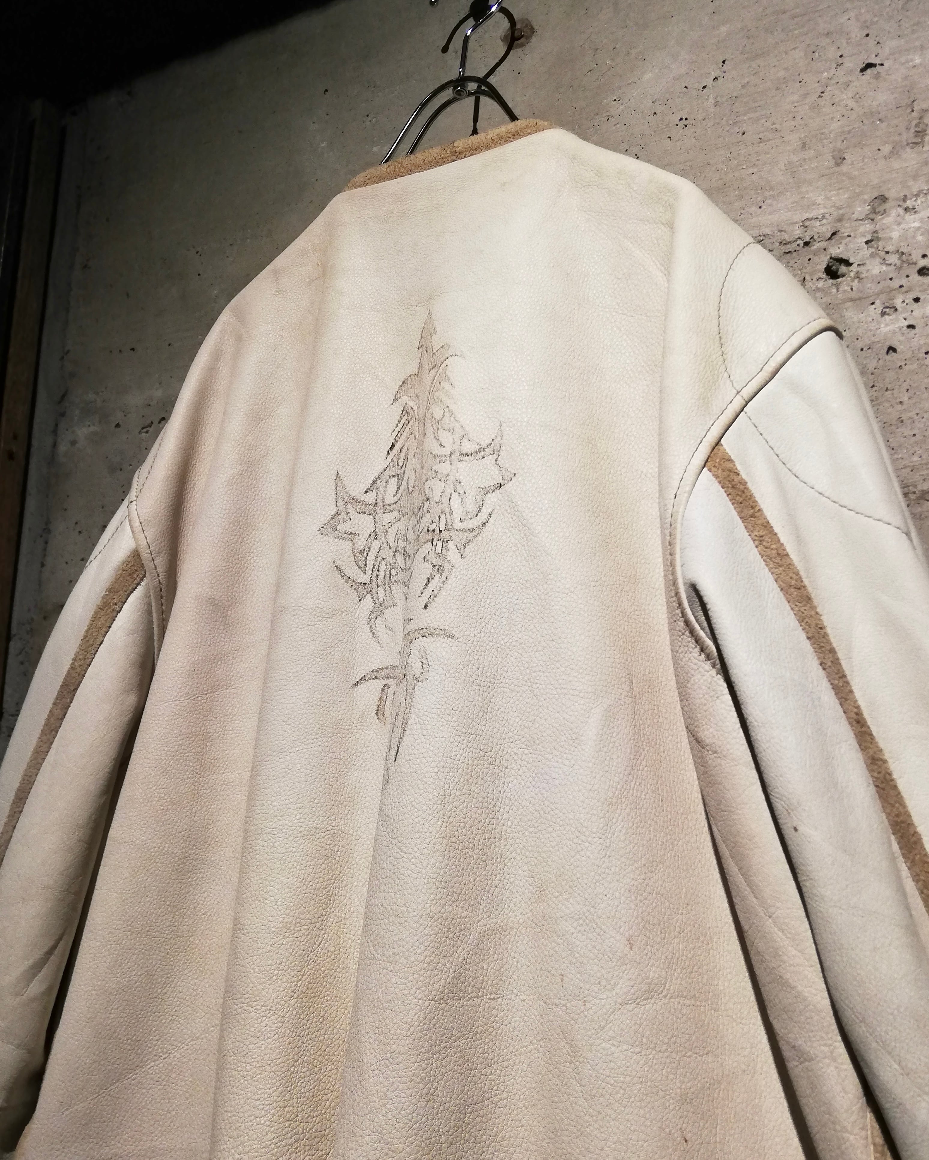 スムースで肉厚なホワイトレザーを採用したボディに、背面にはトライバル柄のペイント、フロントを開けると“PEACE”のプリントが施された、“WILSONS” のライダースジャケット。