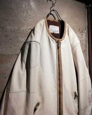 ネックや前立て、ポケット口にはスエードレザーによるパイピングを施し、トーンの異なるベージュカラーがアクセントとして機能しています。ジップタブには刻印入りのメタルパーツを使用し、細部までこだわり抜いたディテールも◎