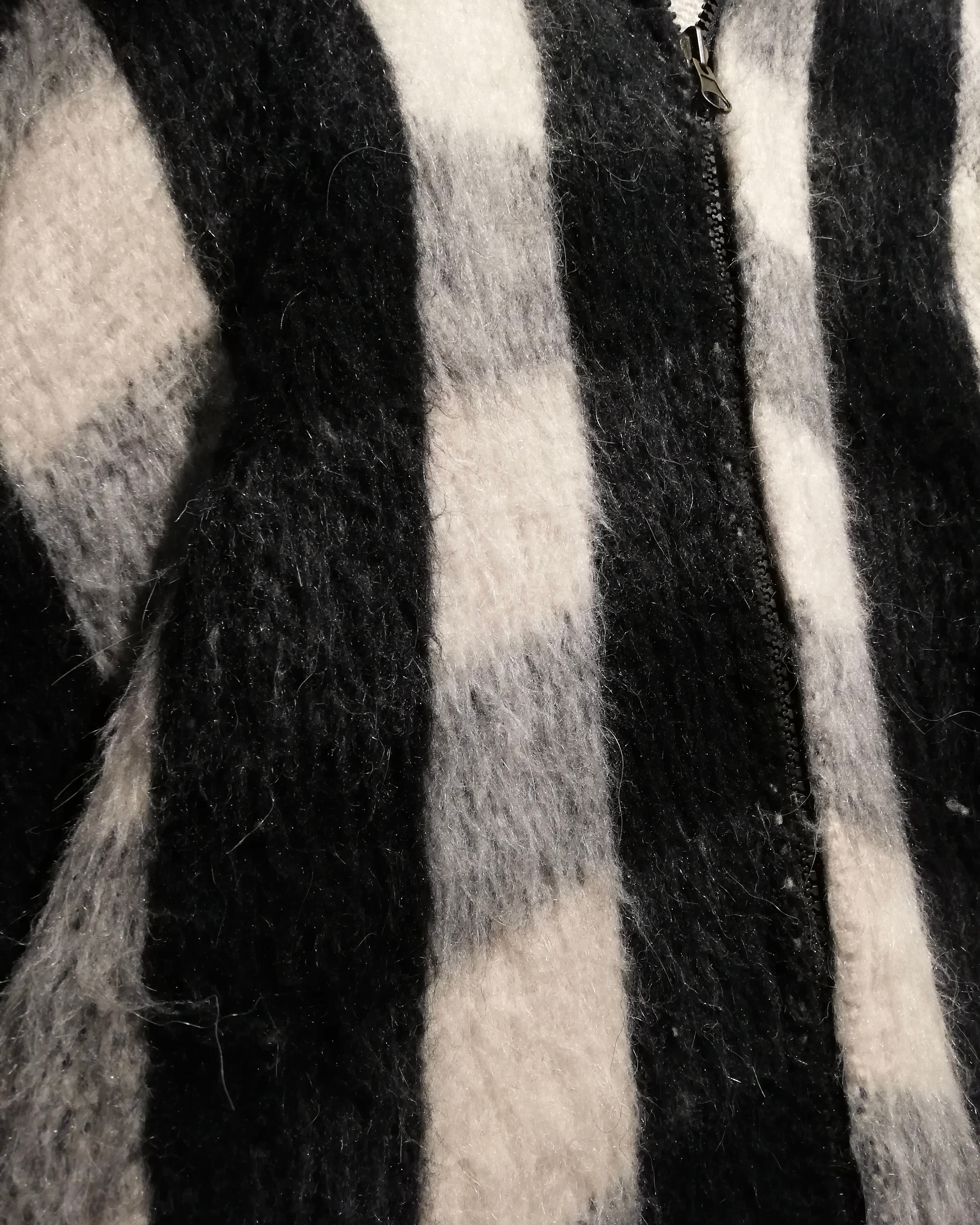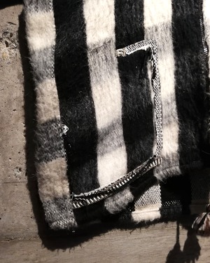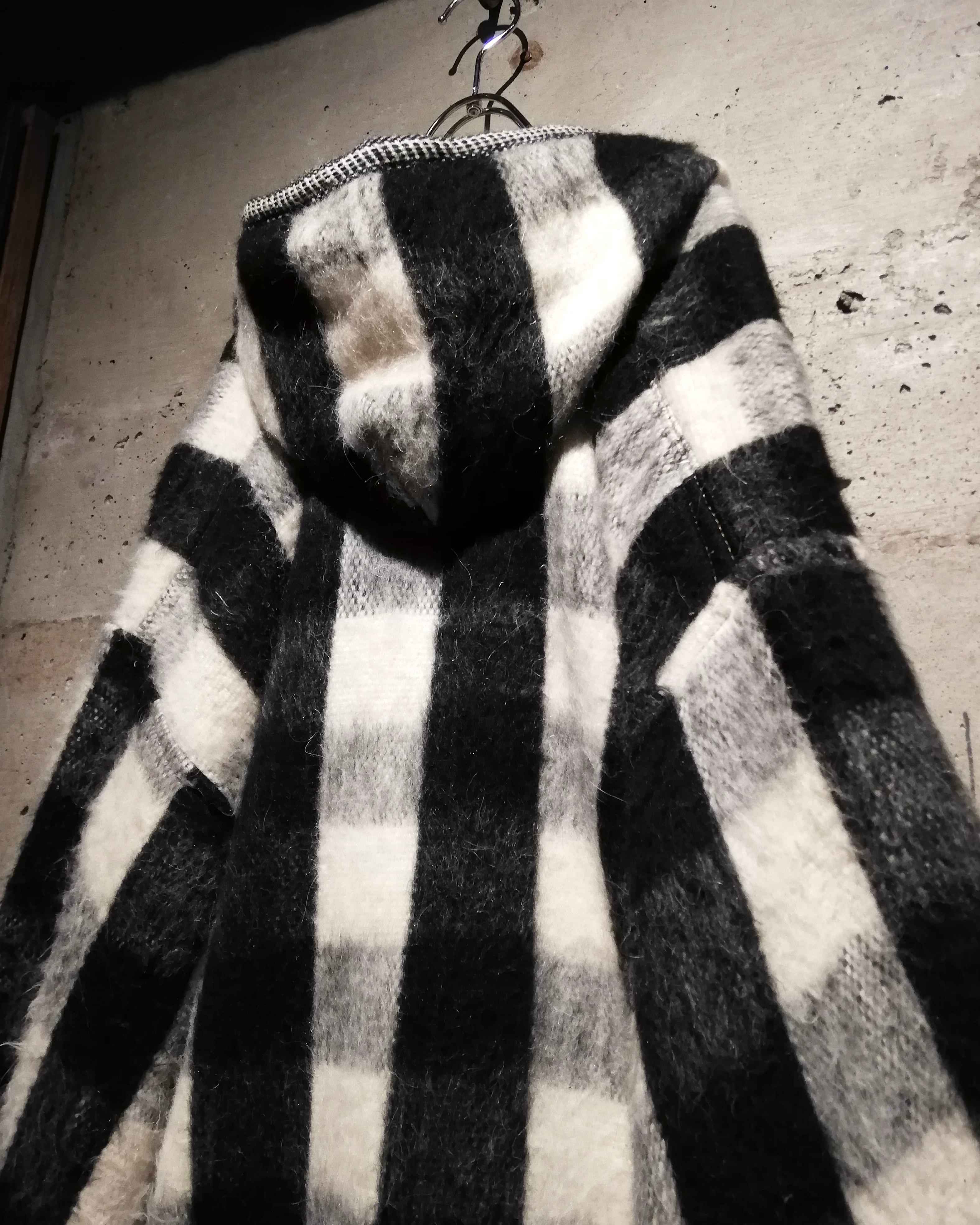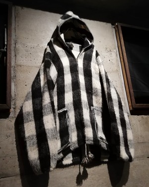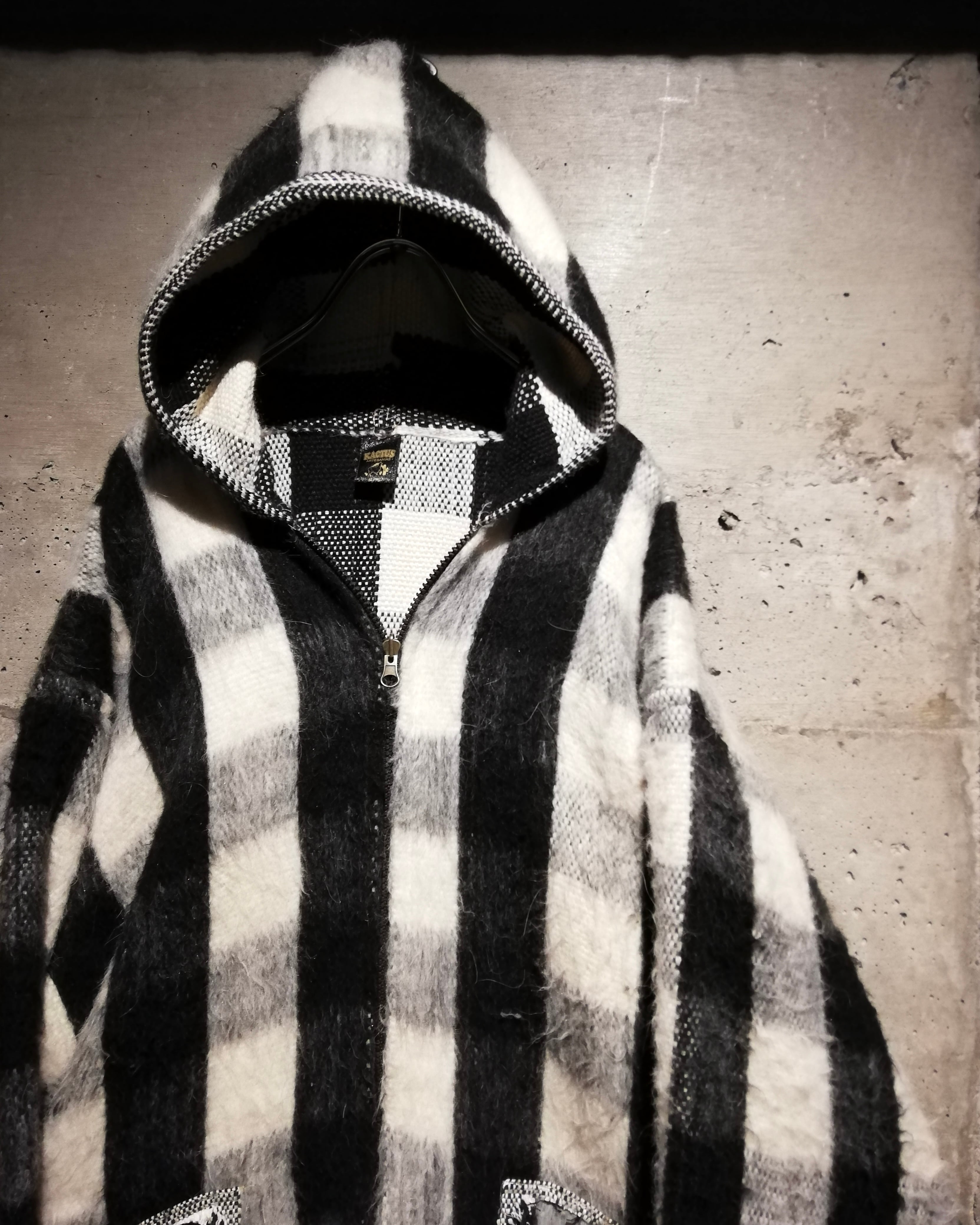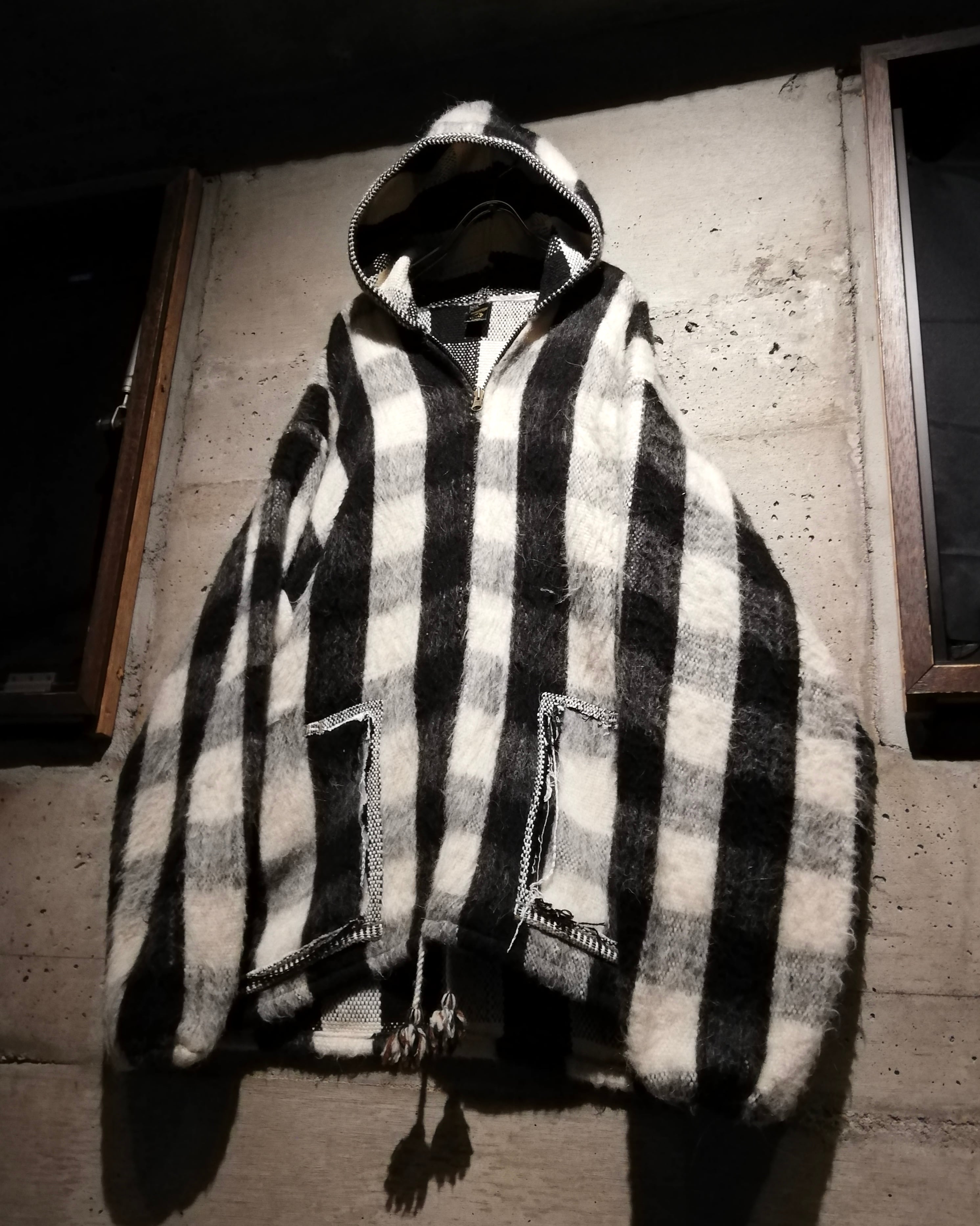 極上の柔らかさと軽さを持つアルパカウールを贅沢に使用し、モノトーンのブロックチェックを全体に載せた、伝統的な手織りの技巧を感じさせるペルー製のジップフーディ。