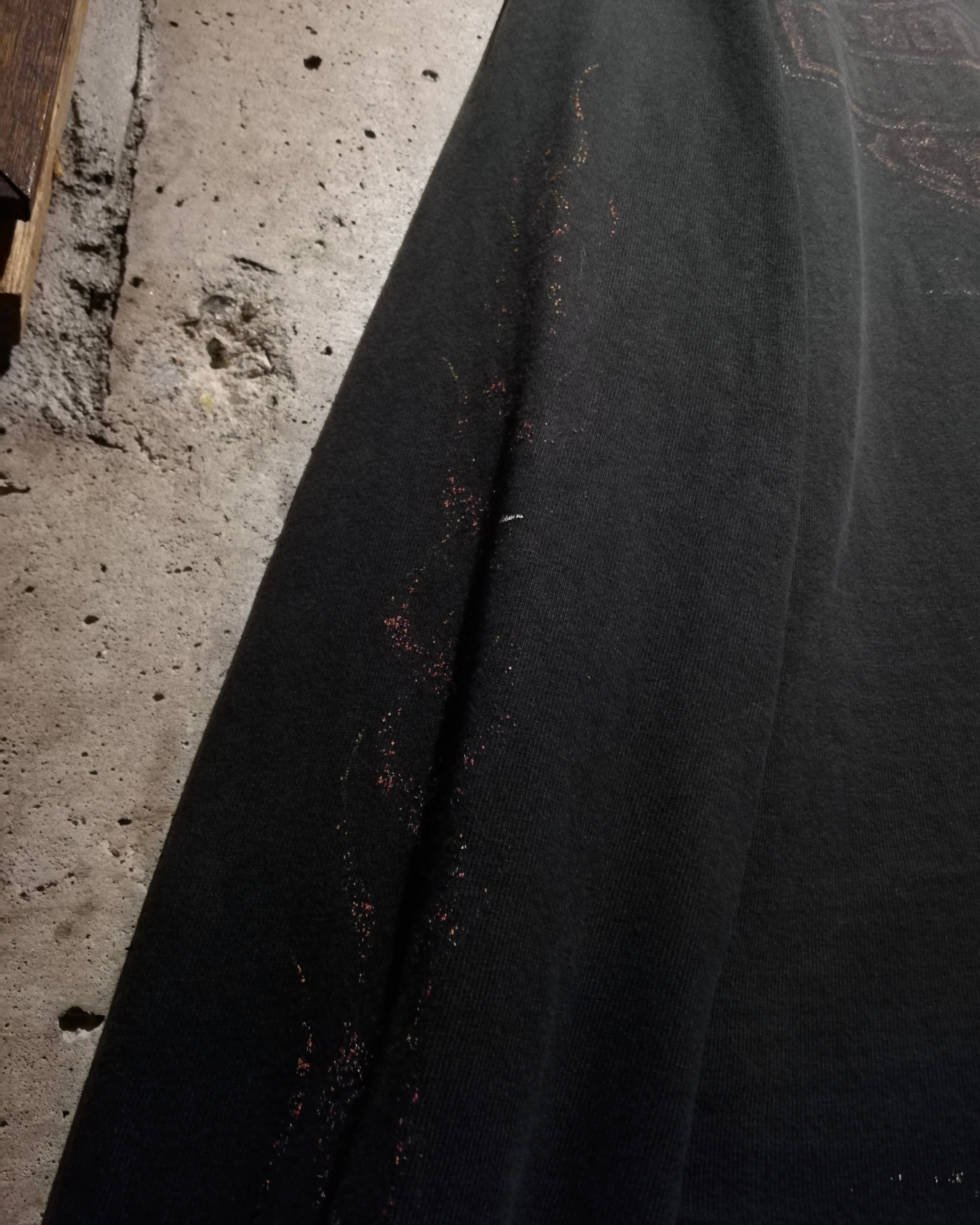 シルクスクリーンならではのざらついた質感と、経年によって自然に掠れたプリントの風合いやフェード、随所に効いたダメージといったエイジングが、唯一無二の存在感を放っています。