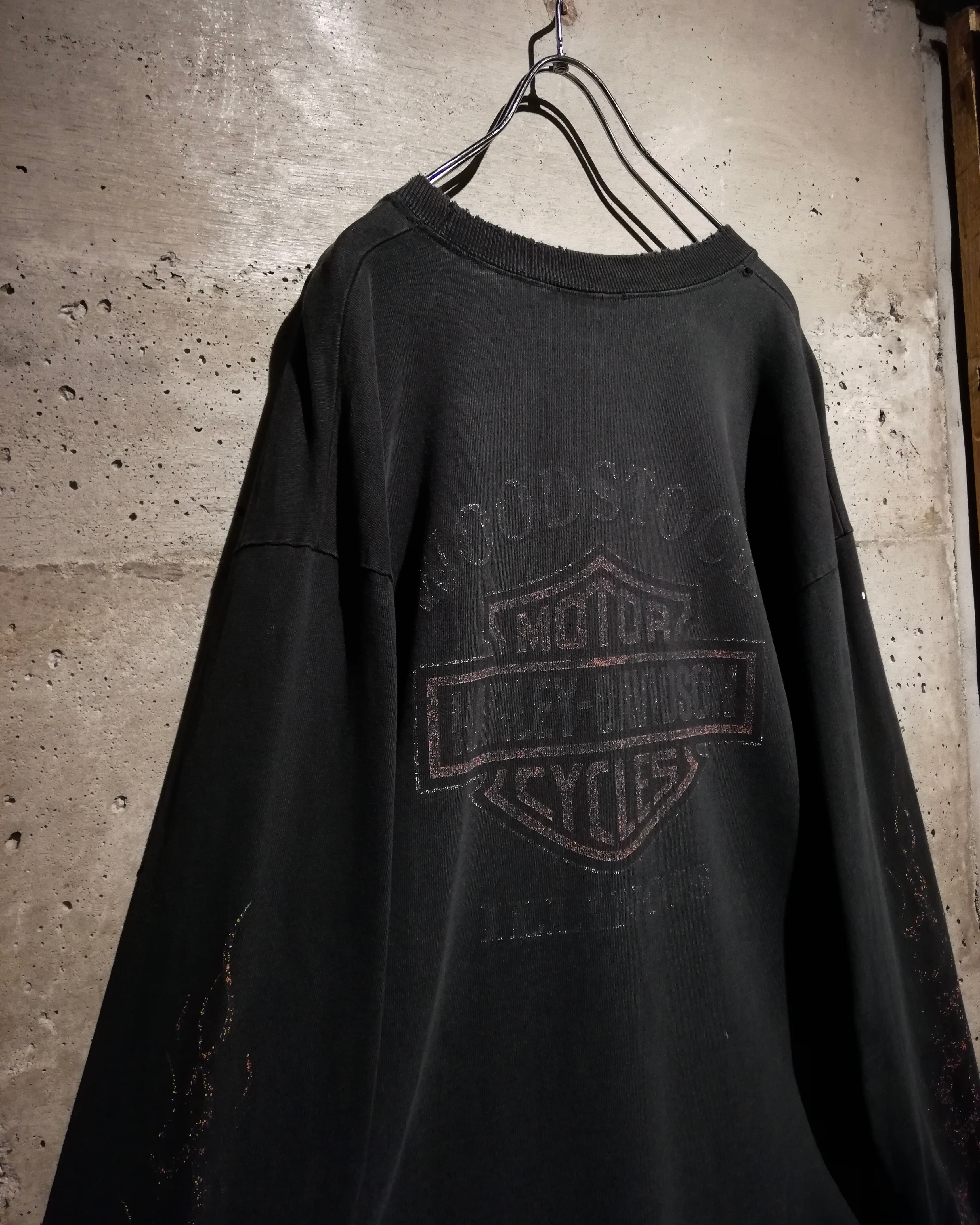 アメリカンカルチャーの象徴、“HARLEY DAVIDSON”より、フロントにブランドロゴ、袖には炎が燃え上がるように広がるフレイムパターンのグラフィックを載せた90'sの長袖Tシャツ。