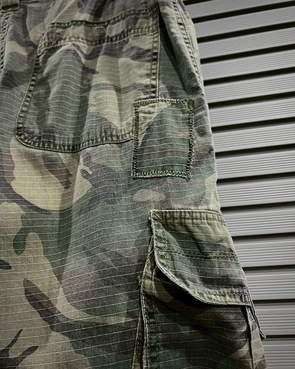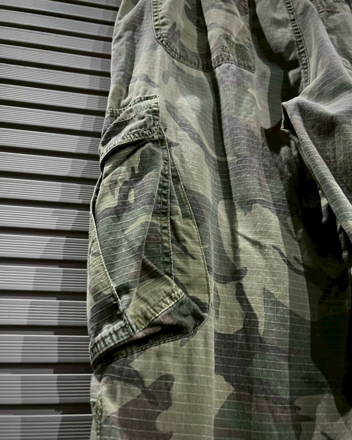 素材にはリップストップコットンを採用。格子状に織り込まれた糸が耐久性を高め、穿き込むほどに柔らかく馴染んでいきます。さらに迷彩の濃淡が織りなすグラデーションはより一層奥行きを演出。