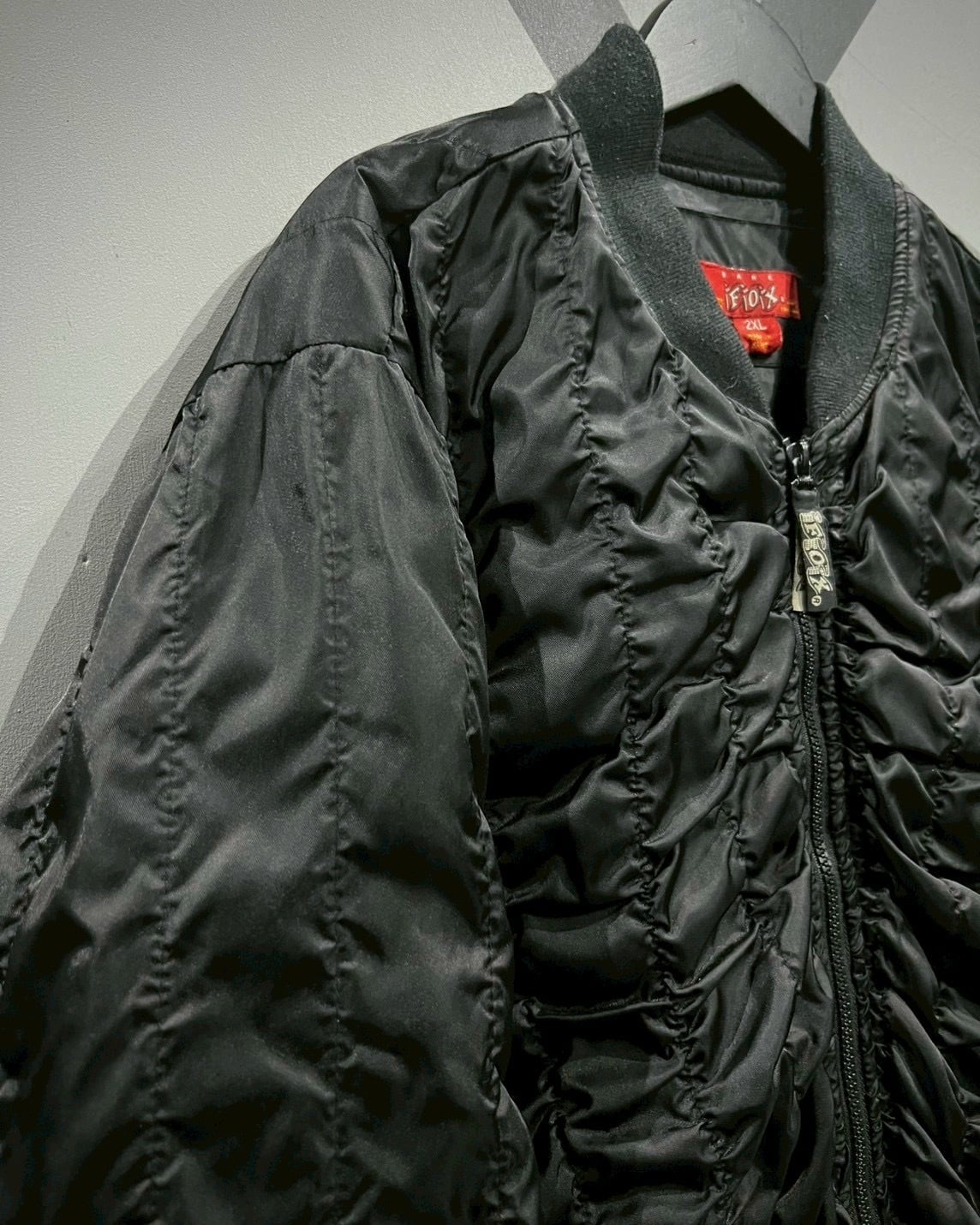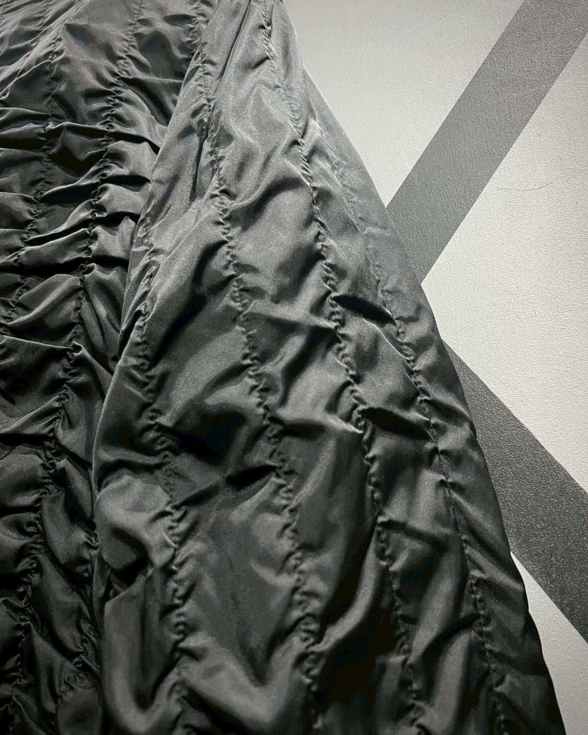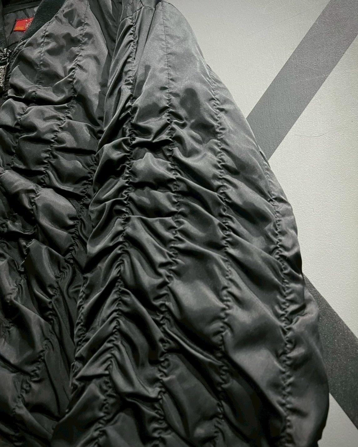 高密度ナイロンが放つ艶やかな質感と、全方位に走るランダムステッチによるドレープ感が絶妙に調和。袖からボディにかけて流れるようなギャザーラインが、光を受けるたびに奥行きを生み、ブラック単色ながらも豊かな表情を見せてくれます。