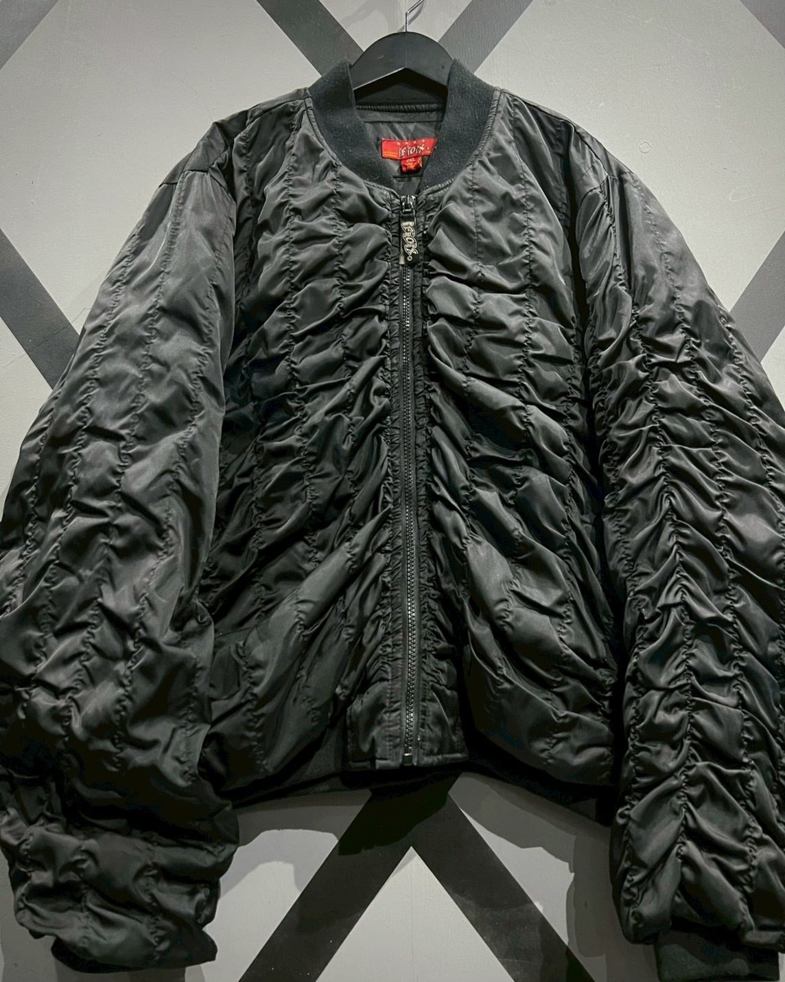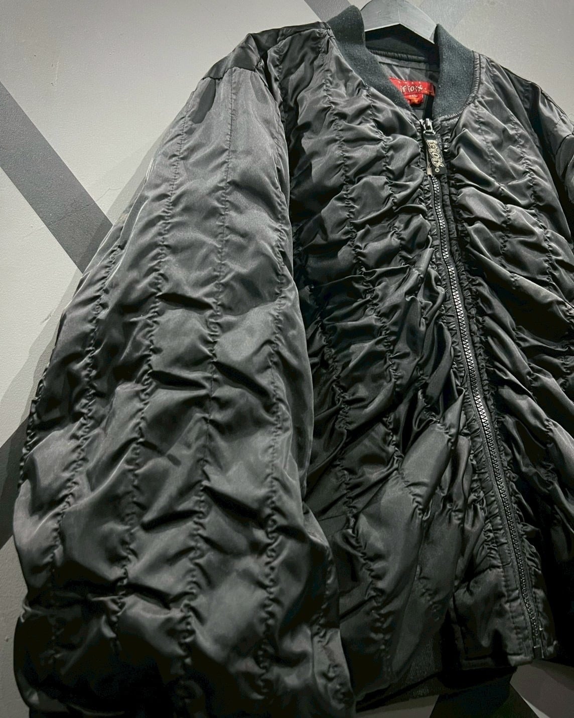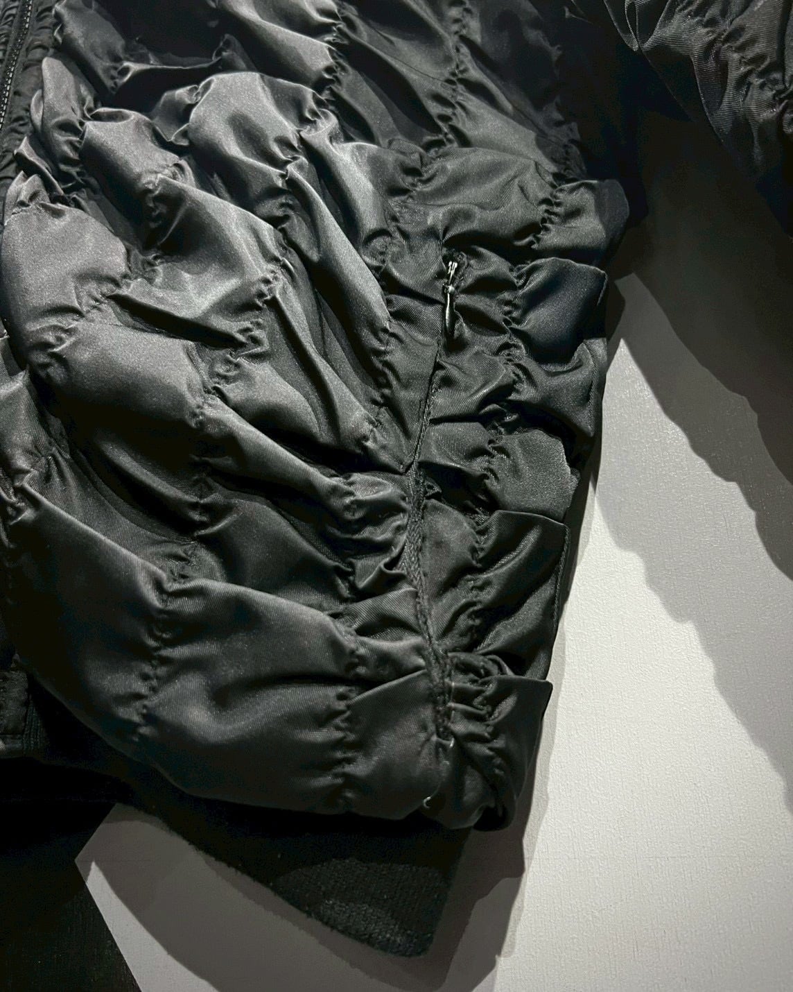 光沢感のあるブラックナイロンをベースに、全体へ施されたギャザーが立体的な陰影を描き出すボンバージャケット。