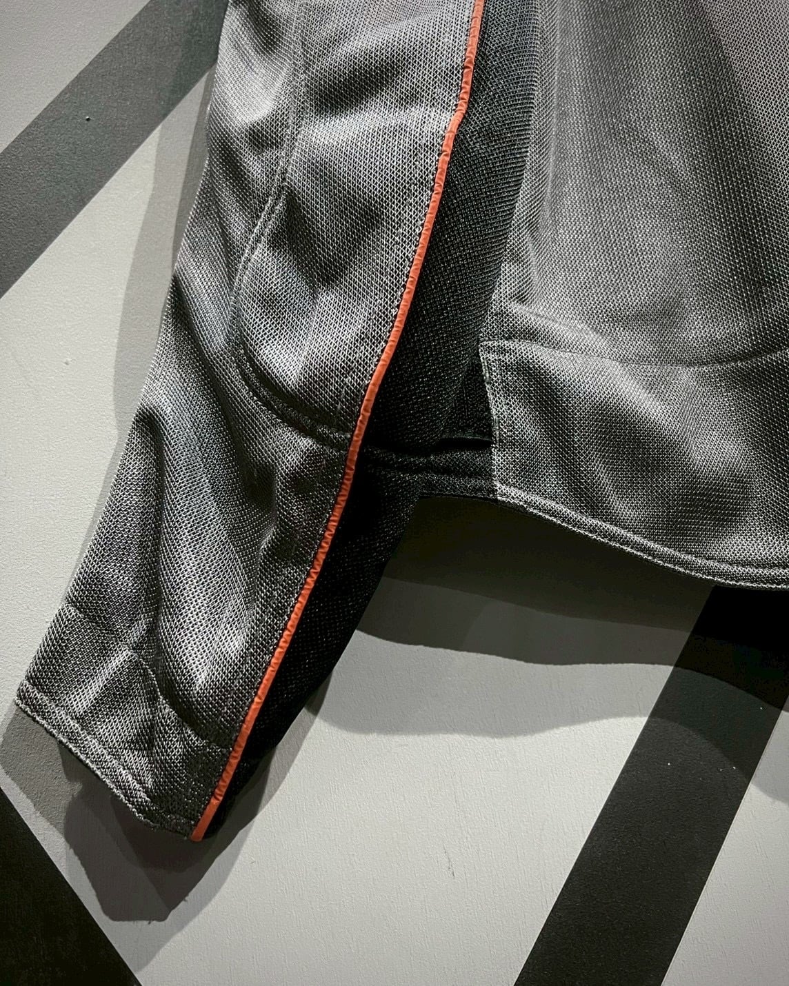 独特な光沢を放つシルバーのナイロンを用いた1着。密度の高い織りによる光沢感とタフな質感が魅力ぇ、随所にレイアウトされたオレンジのパイピングラインが全体を引き締め、ブランドを象徴するレーシングエッセンスを色濃く漂わせています。