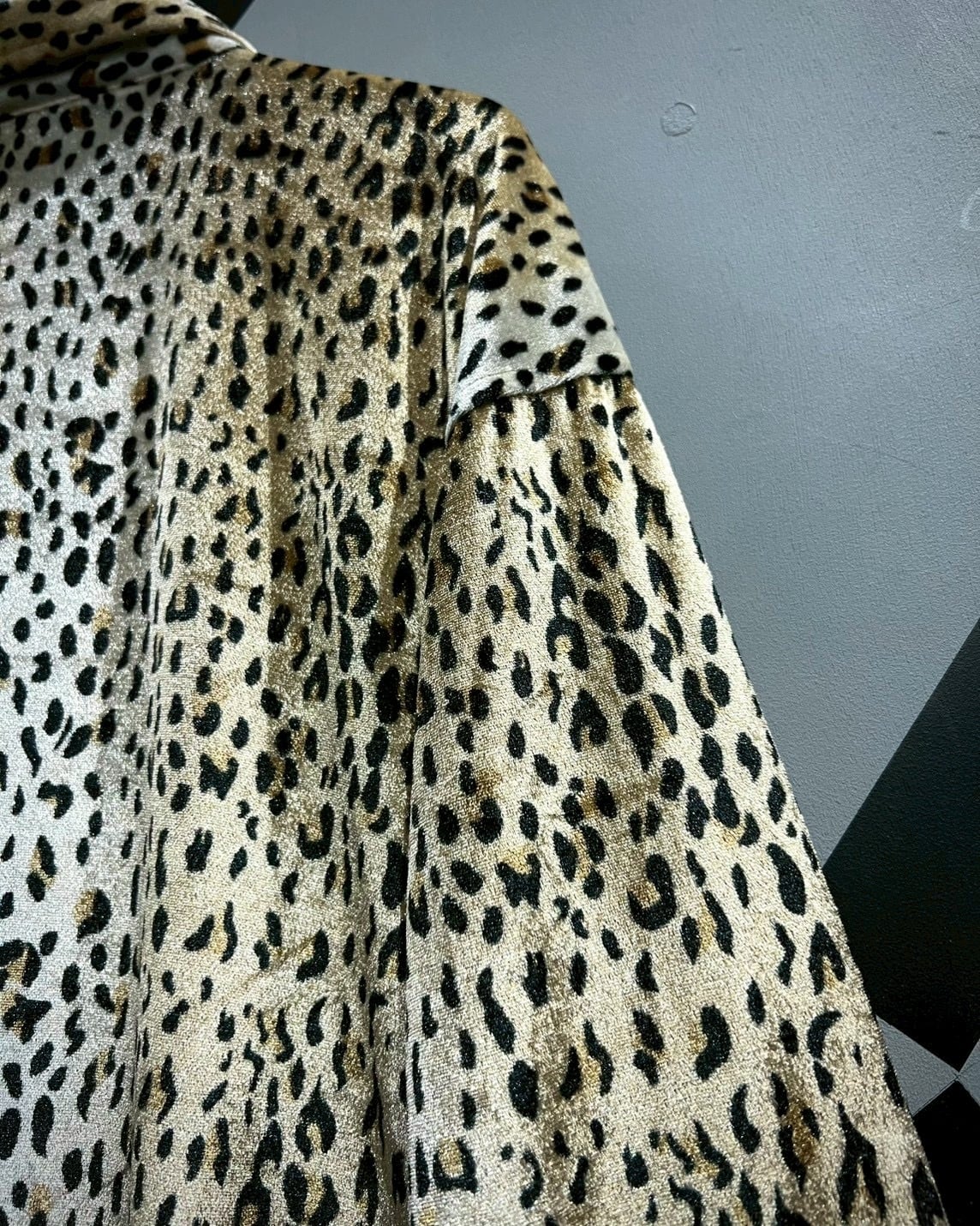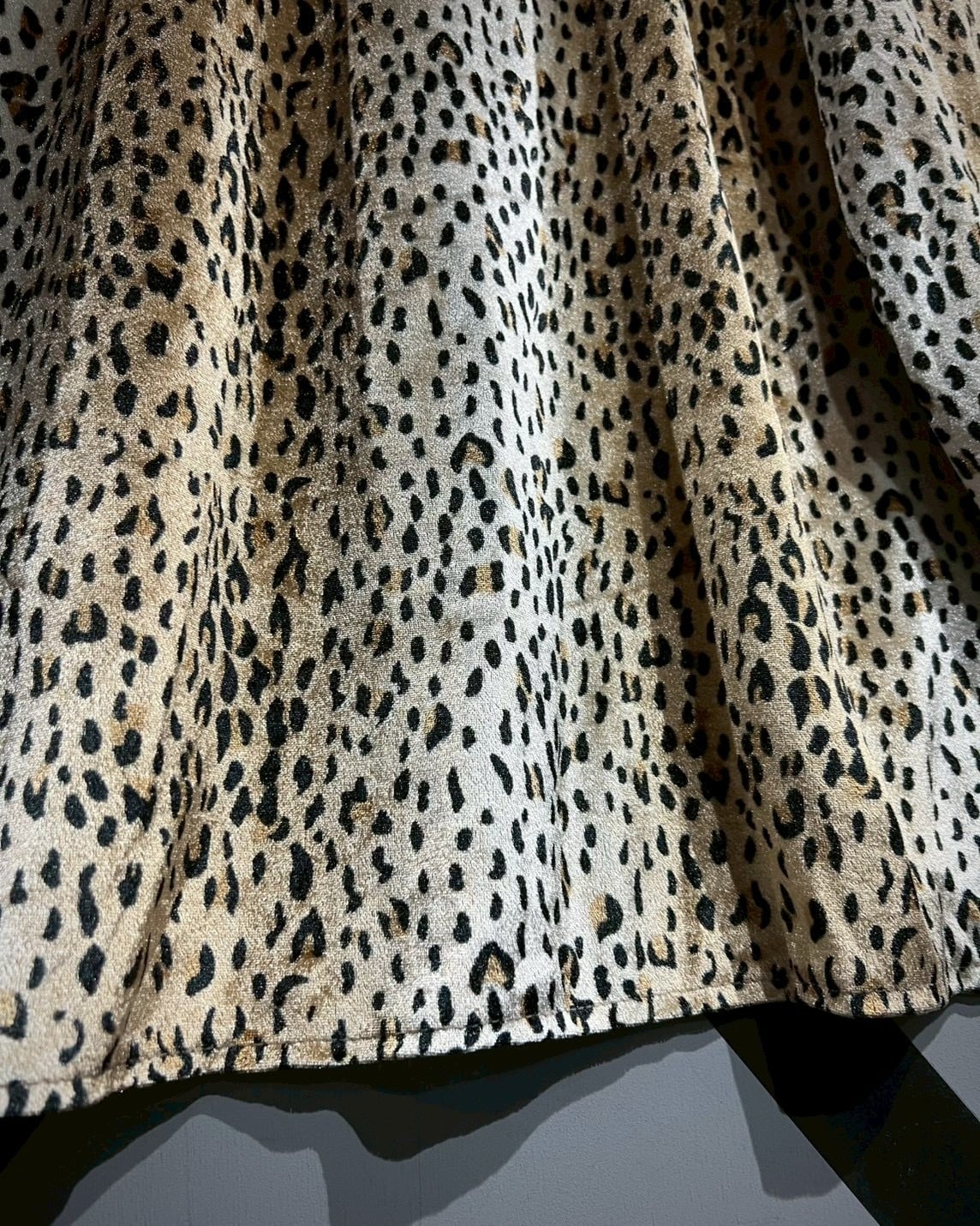動くたびに光を受けて表情を変える素材感が魅力で、レオパード柄と生地使いが見事にマッチしています。