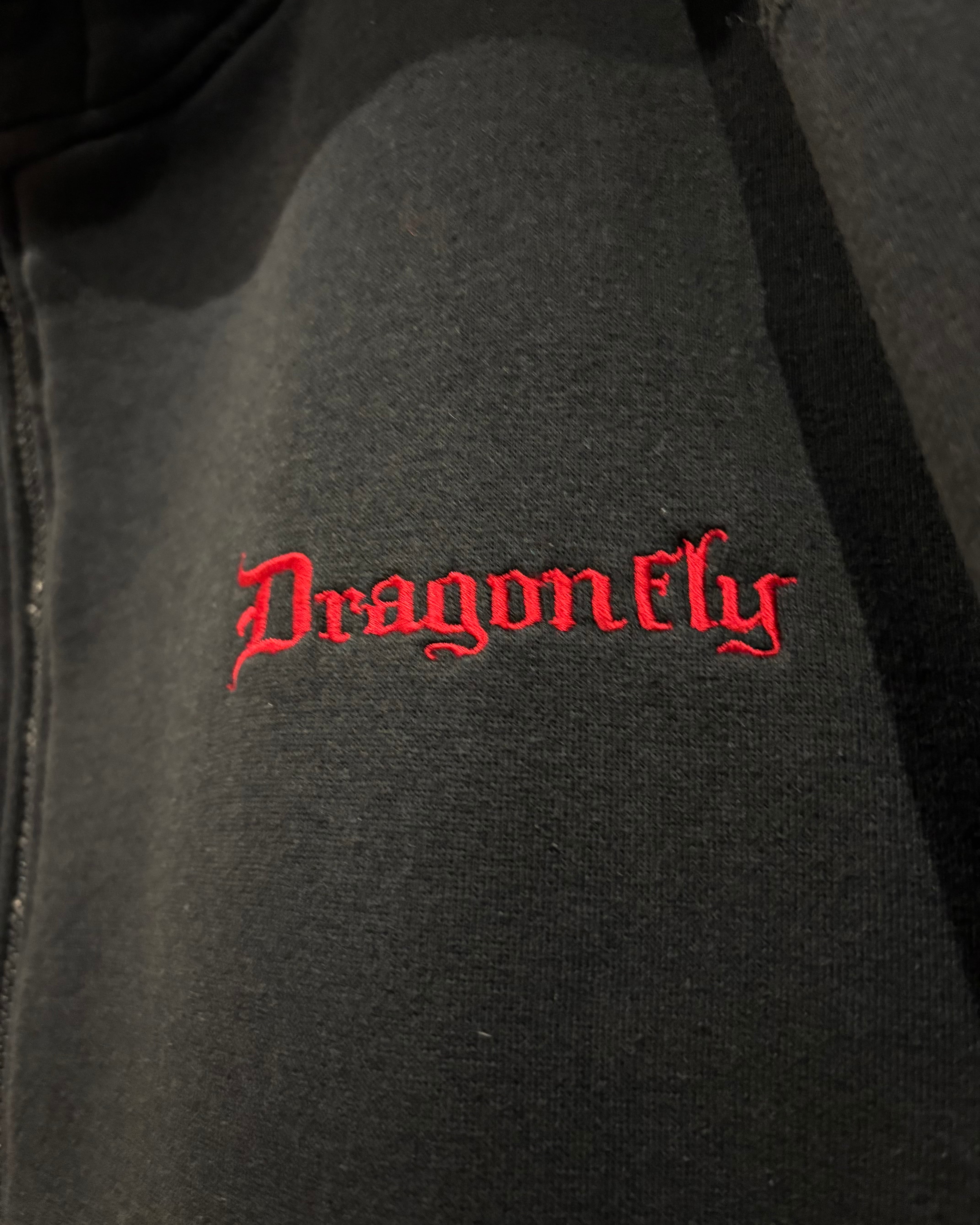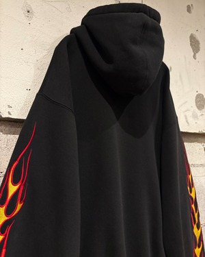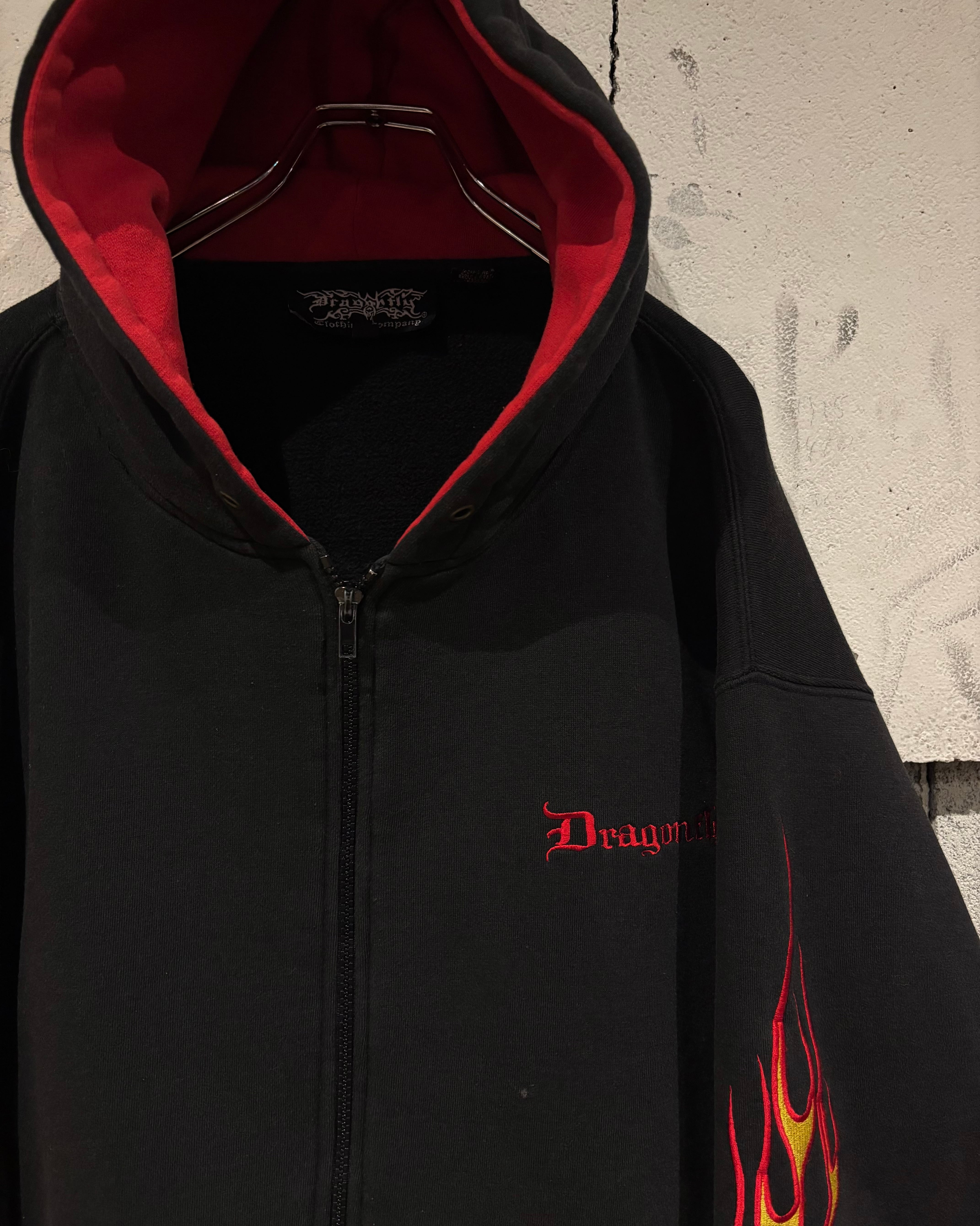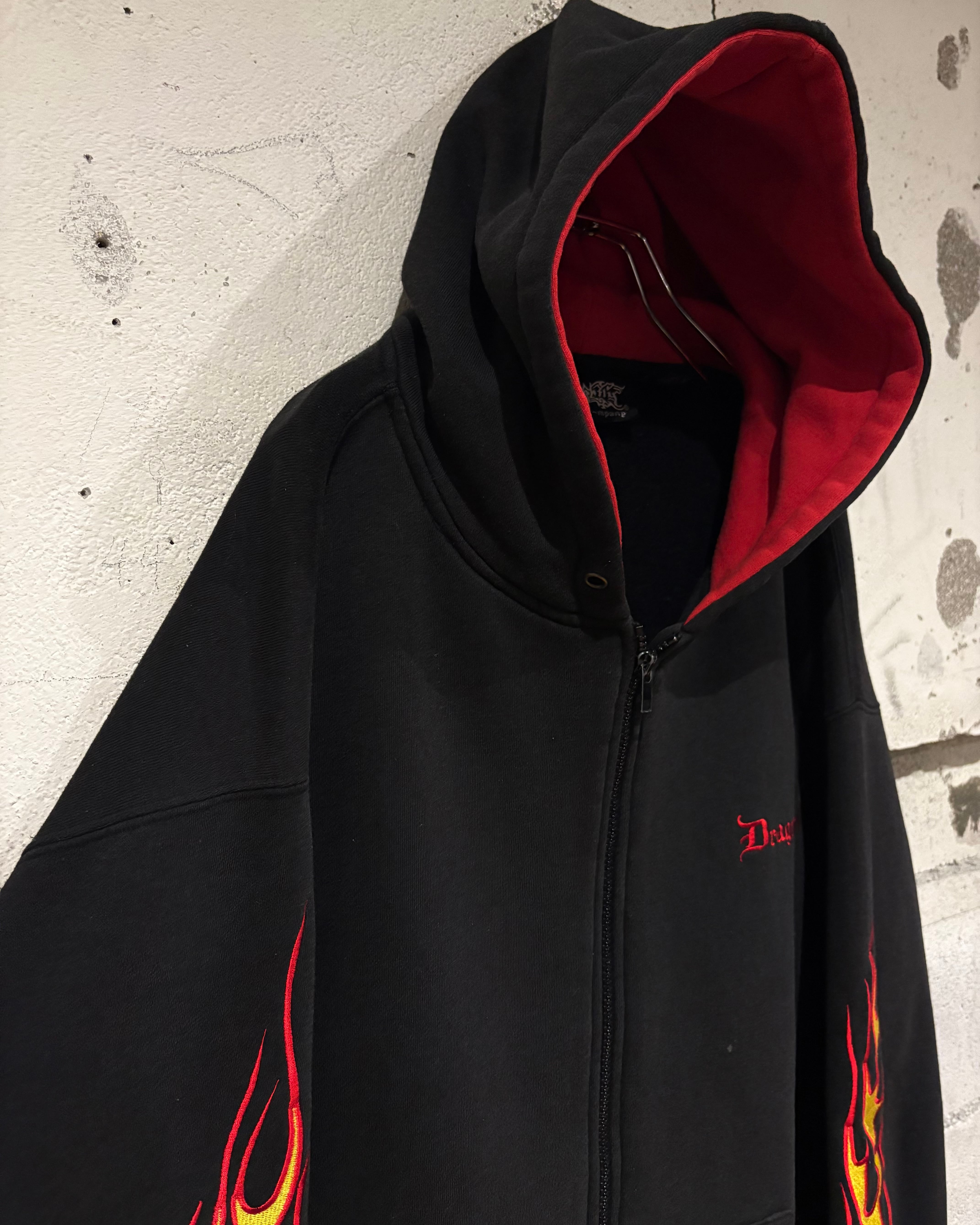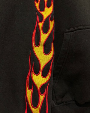 Y2Kカルチャー全盛期を象徴するフレイム刺繍を刻んだジップアップフーディ。