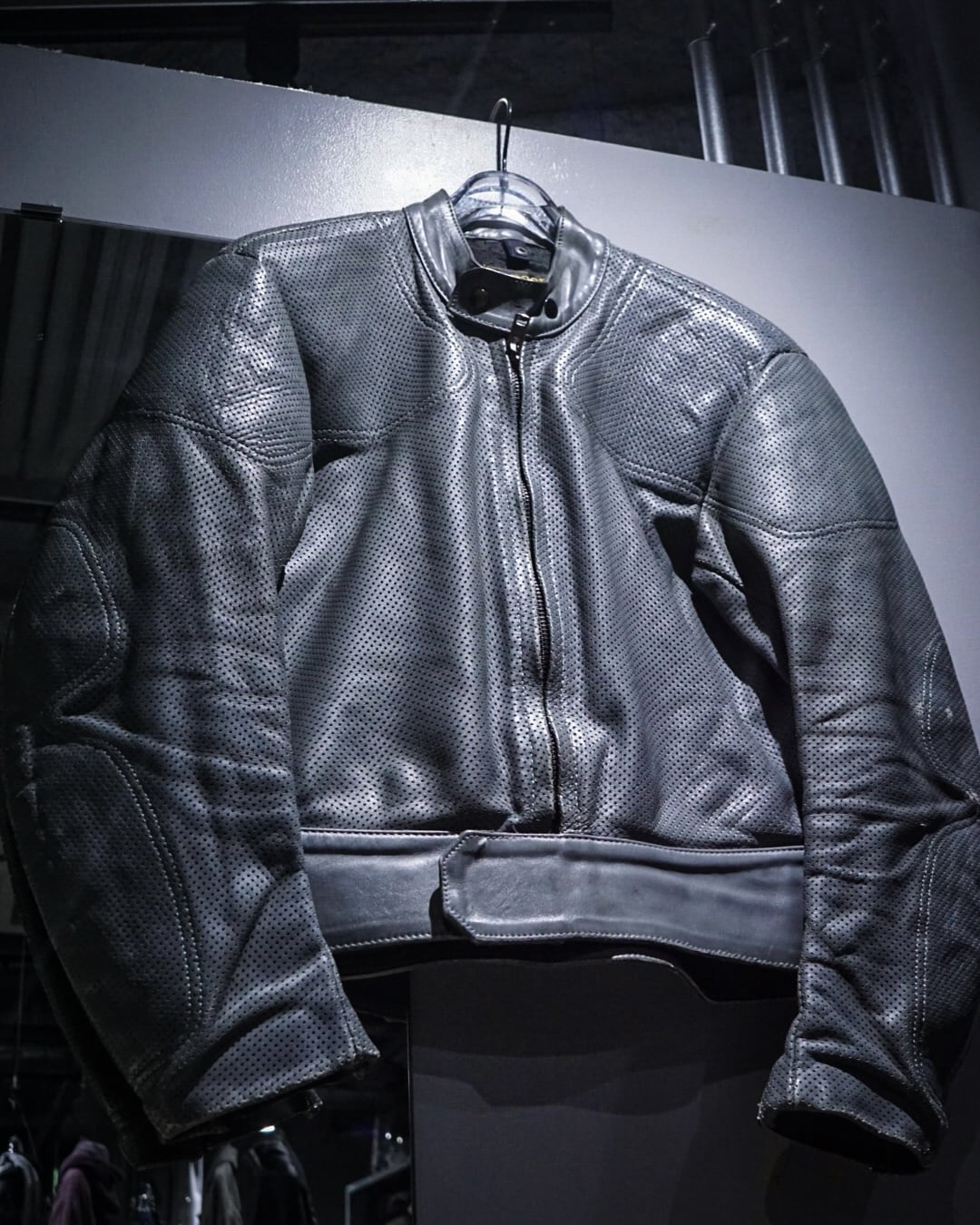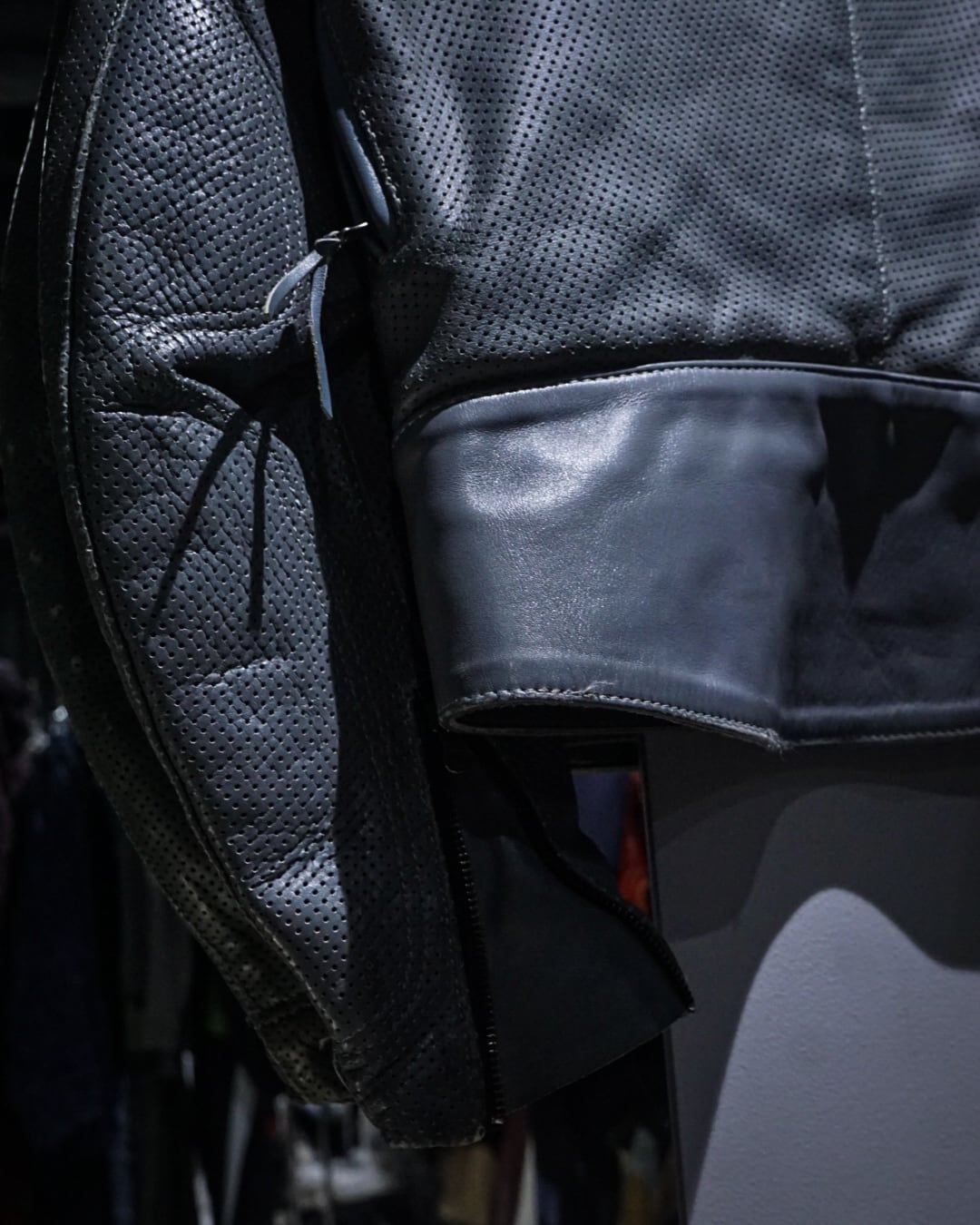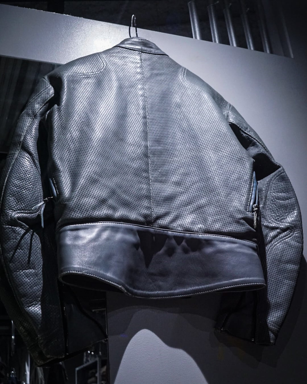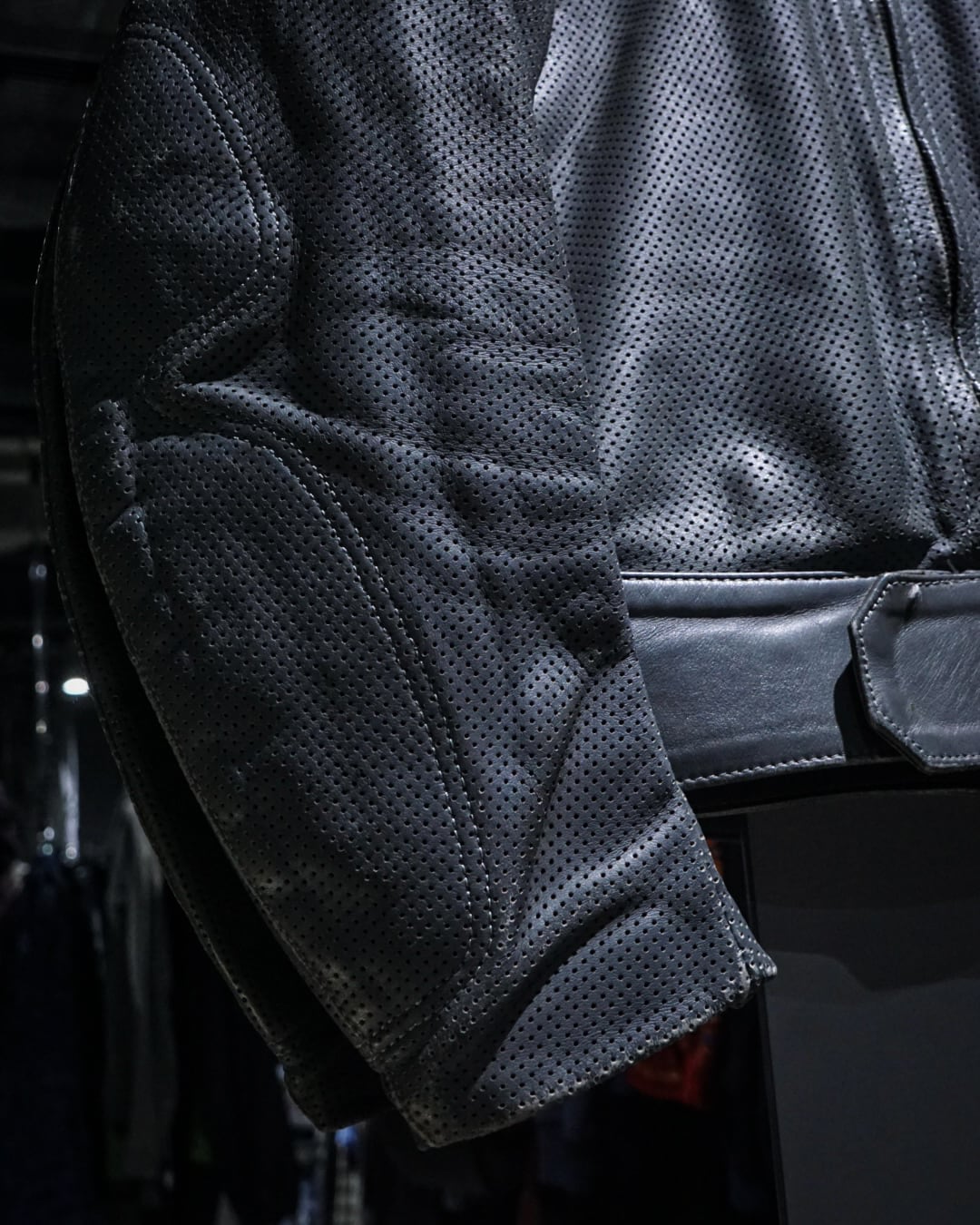 肉厚ながらもしなやかなカウレザーをベースに、全面に施されたパンチング加工が圧倒的な存在感を放つ1着。