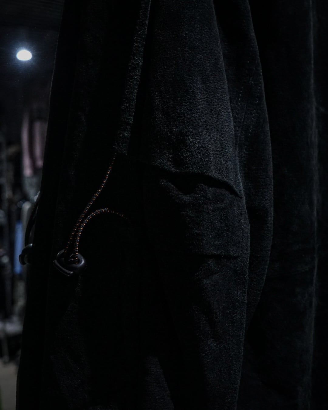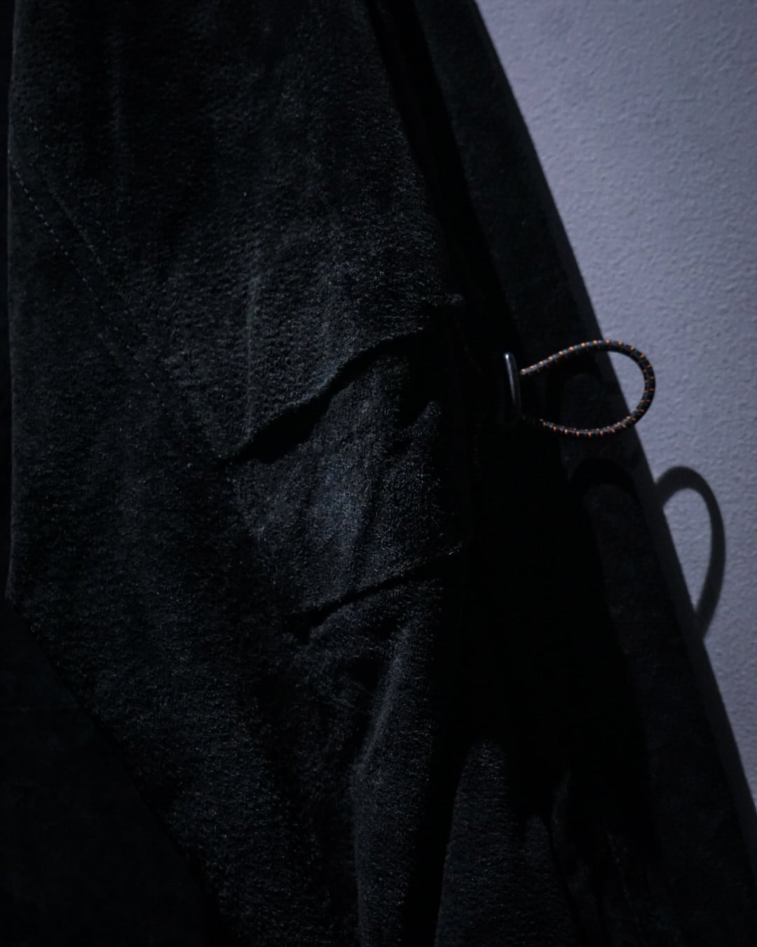 光の当たり方で微妙に表情を変える深みあるブラックスエードのボディで、しっとりとした手触りとマットな艶感が、無骨ながら色気を漂わせます。