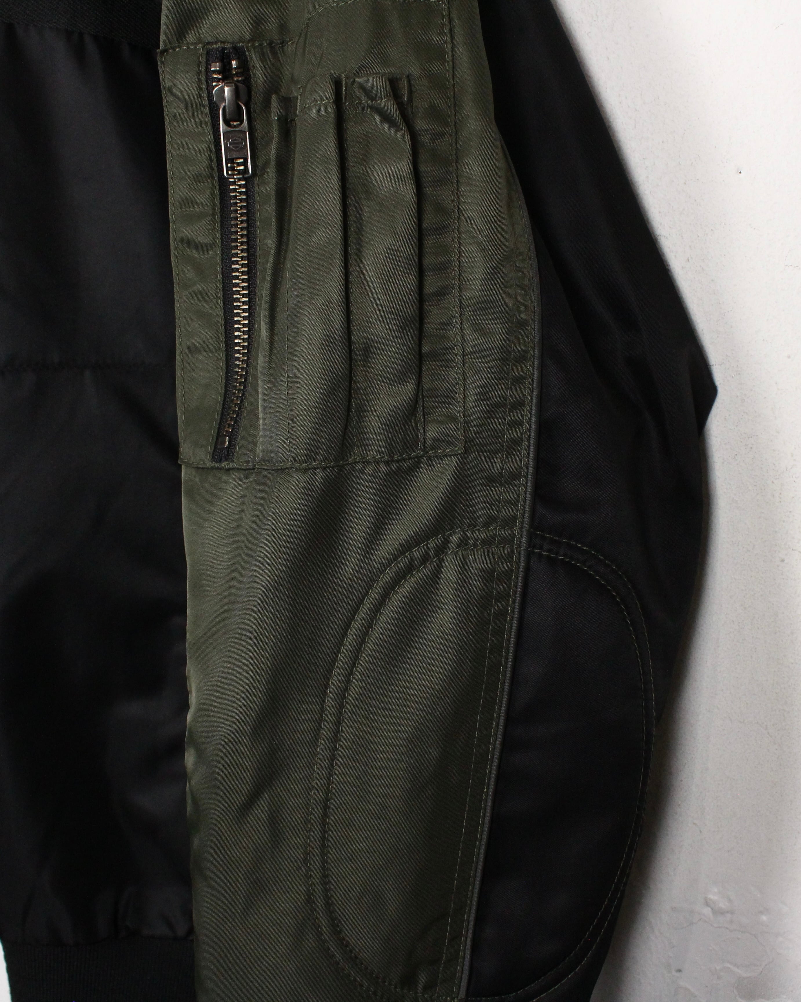 肩のキルティングやアームポケット、袖ジップといったMA-1のミリタリーディテールを取り入れながらも、バイカージャケットらしいプロテクションラインを意識たディテールが施されています。