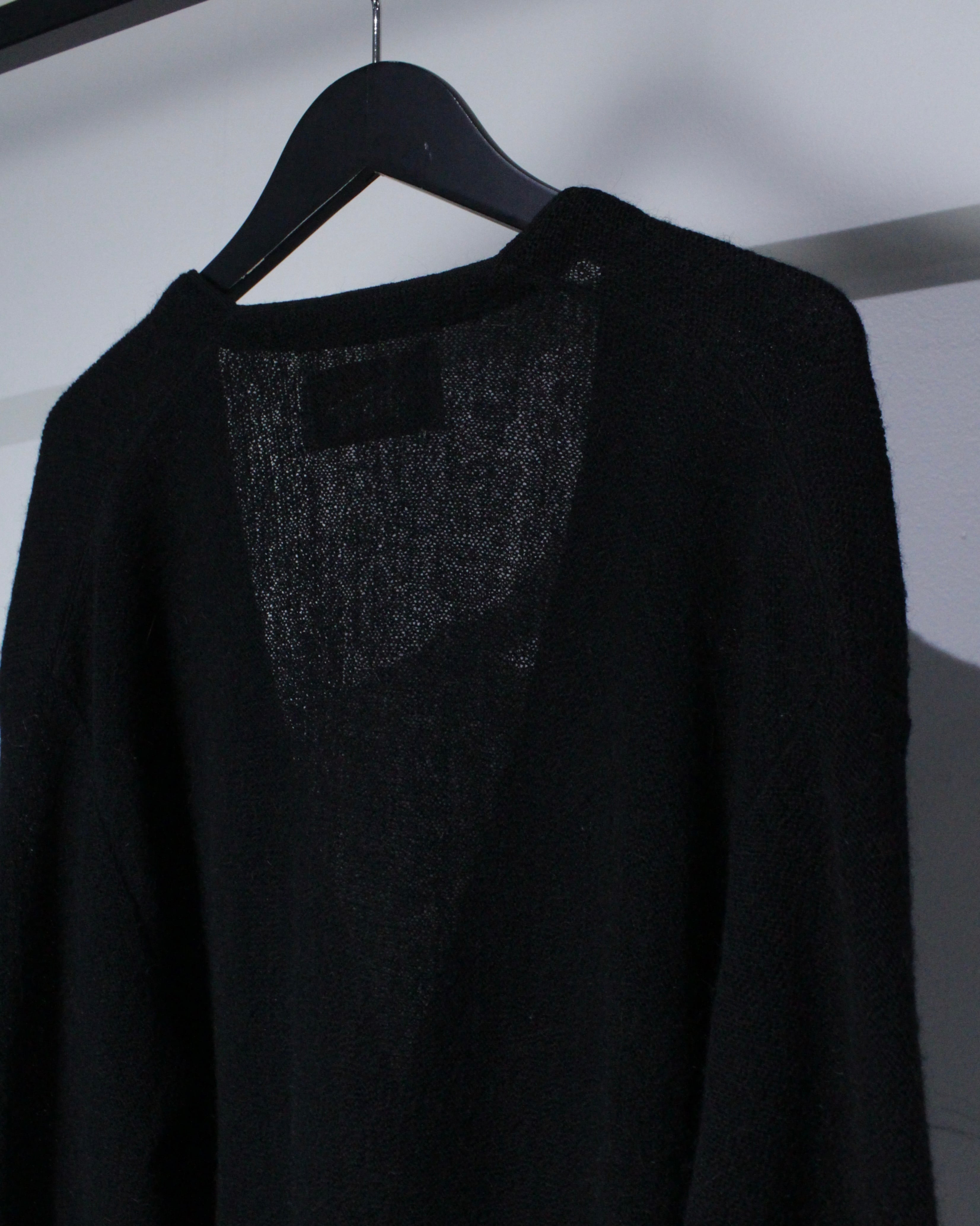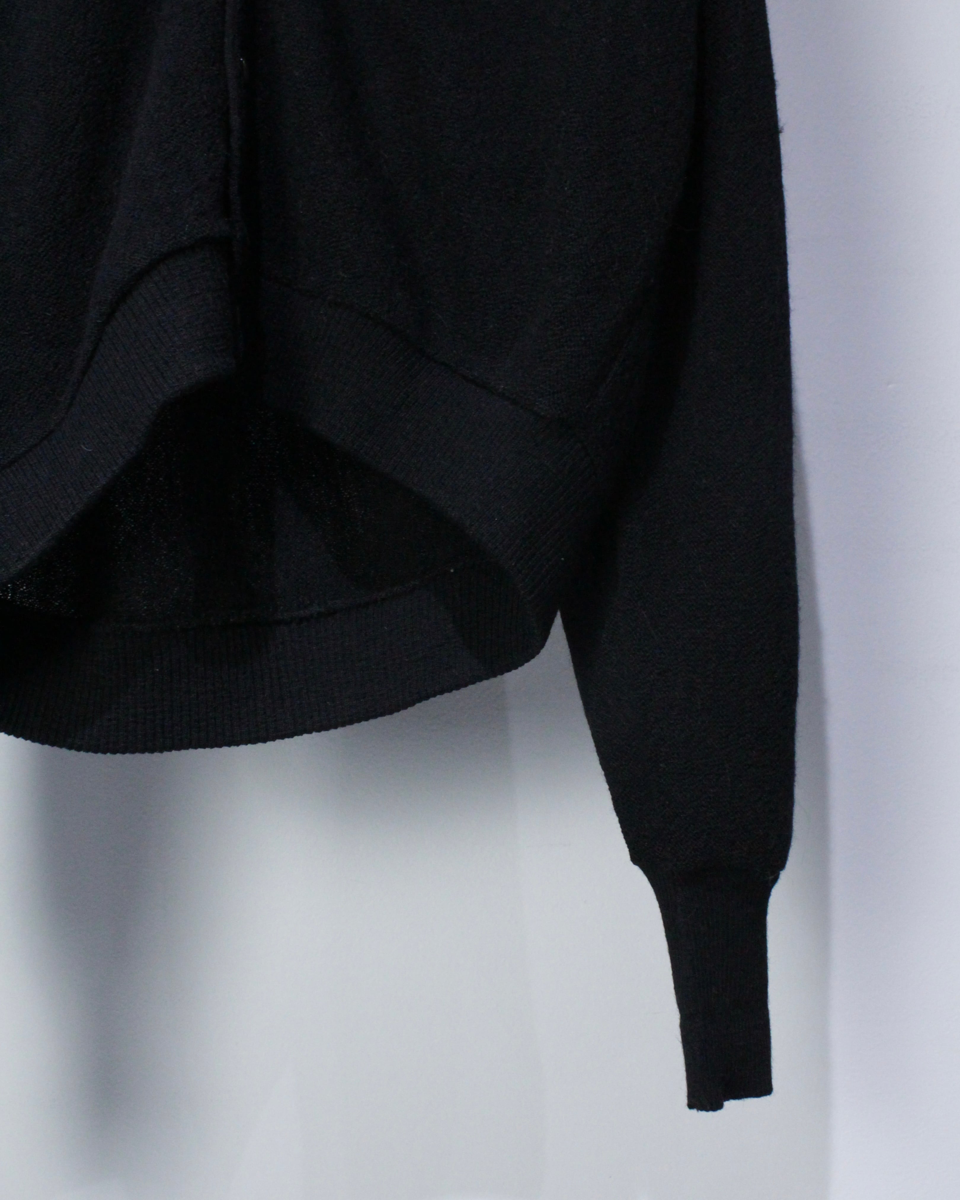 深めのVネック、裾、袖のリブ仕立てが美しいシルエットを形成。シンプルながらも上品なブラックトーンが、モードにもヴィンテージにもハマってくれます。