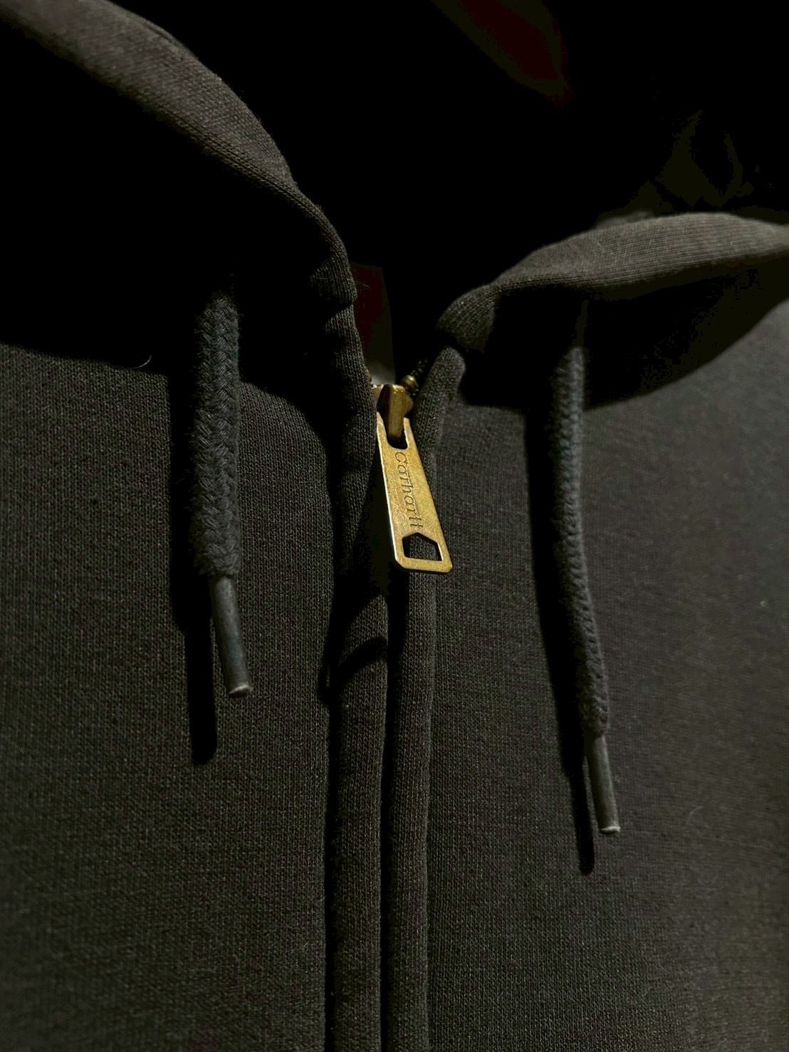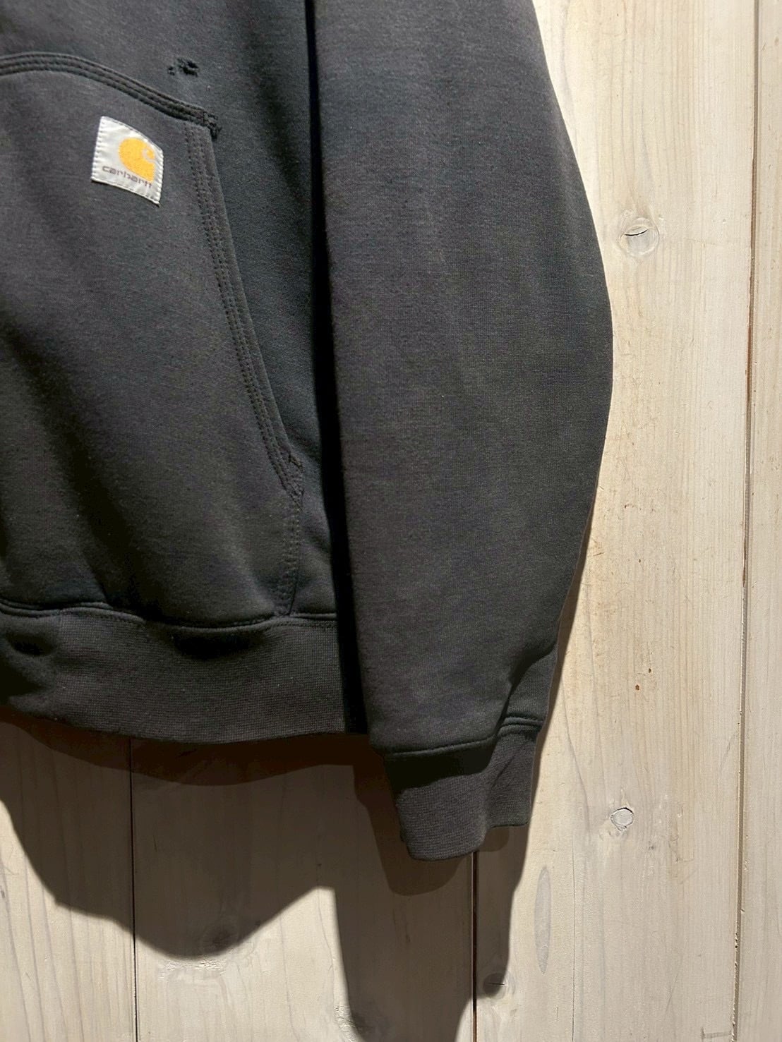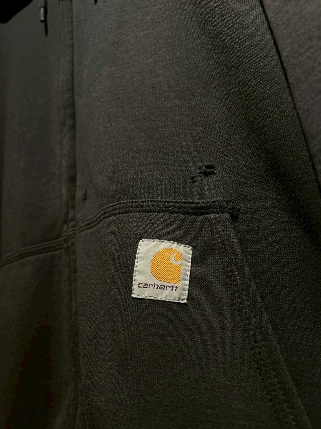 全体にうっすらと入ったフェード感が、着込まれたリアルな風合いを演出。ポケットのCarharttロゴタグと、ブラス製のゴールドジップが無骨なアクセントとなり、USEDならではの雰囲気をより際立たせています。