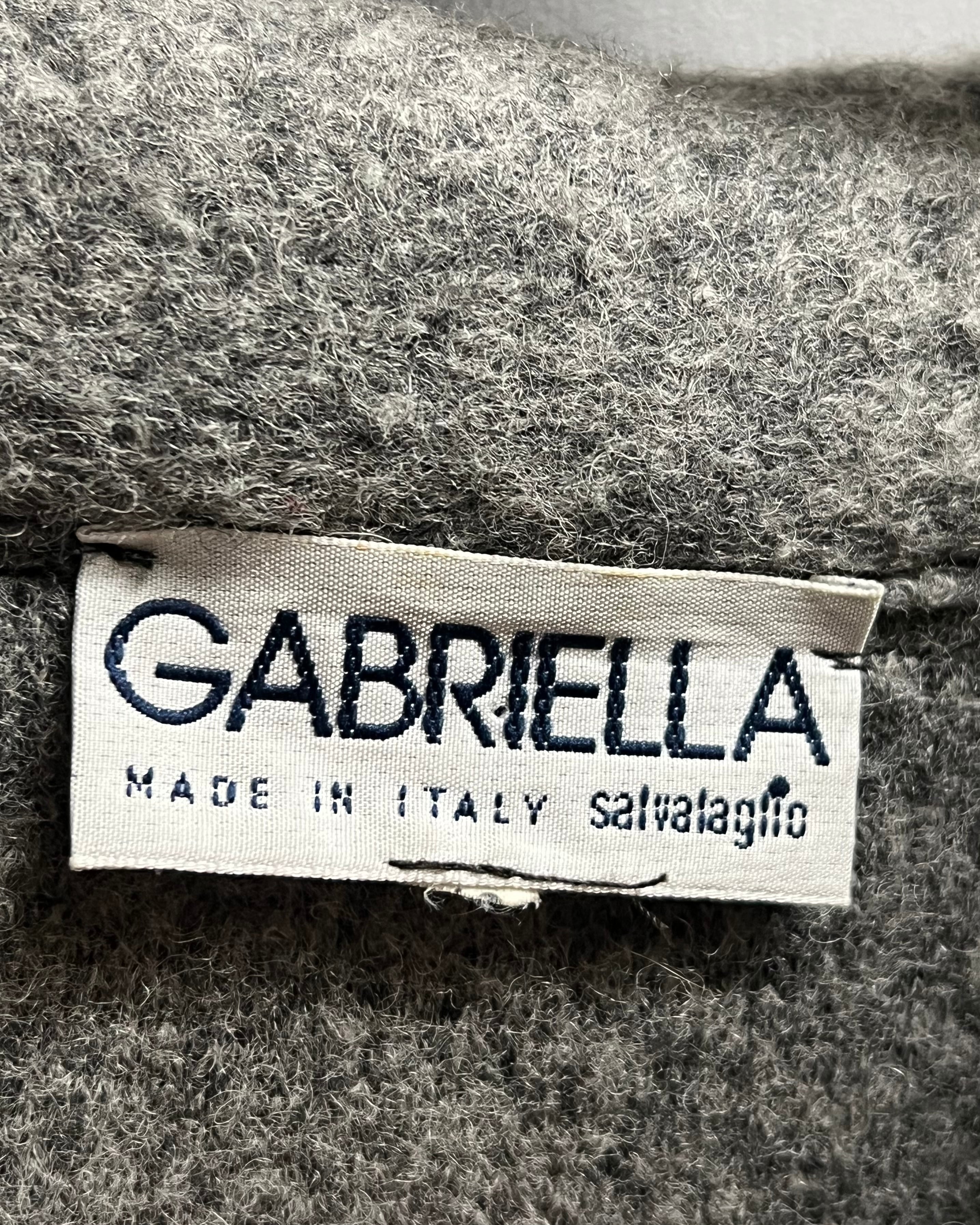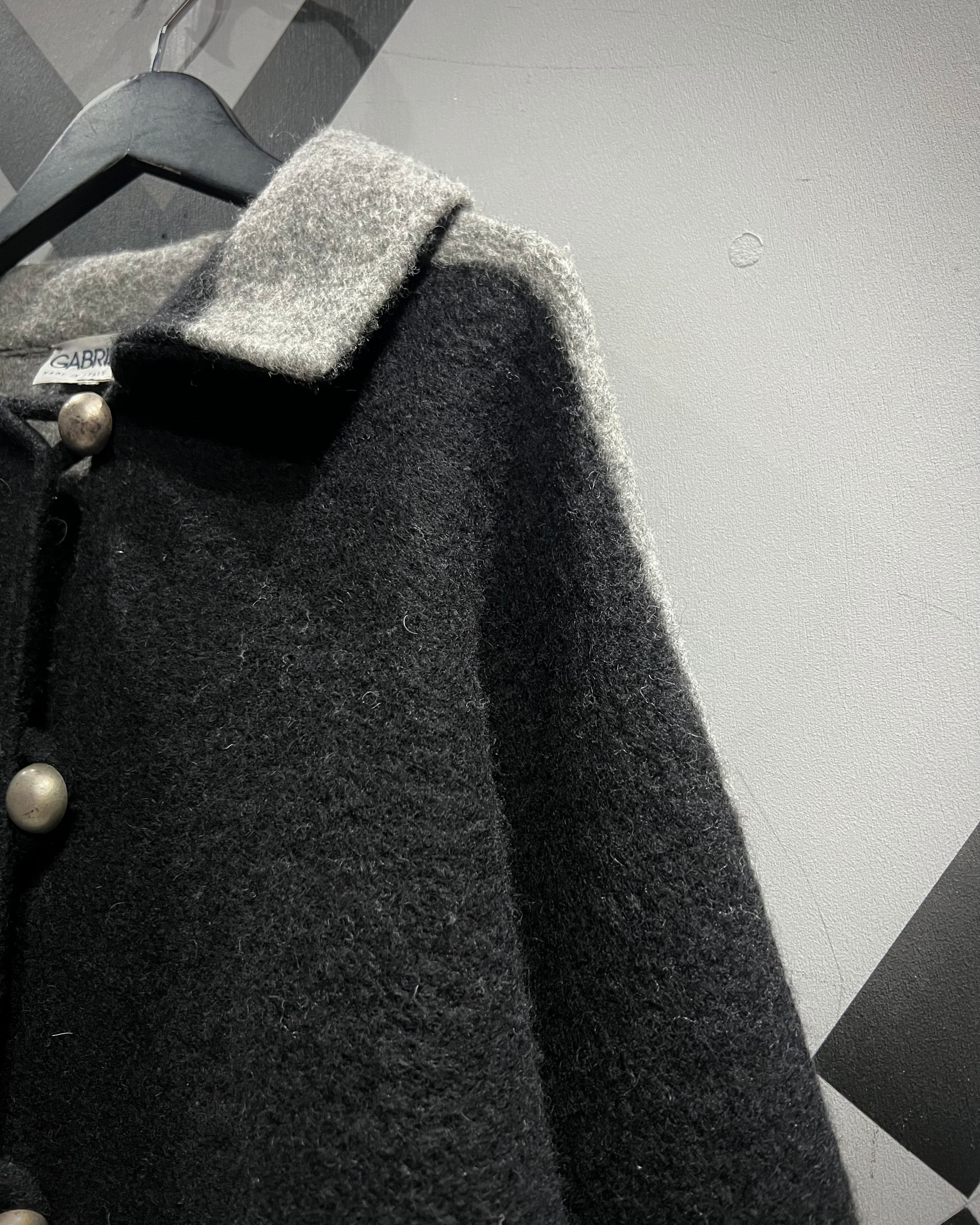 襟元と袖口にはトーンを切り替えたライトグレーの配色を施し、シルバーのメタルボタンが上品なアクセントに。シンプルでありながら美しいデザインバランスは、イタリアンブランドらしいエレガンスとモードが融合しています。