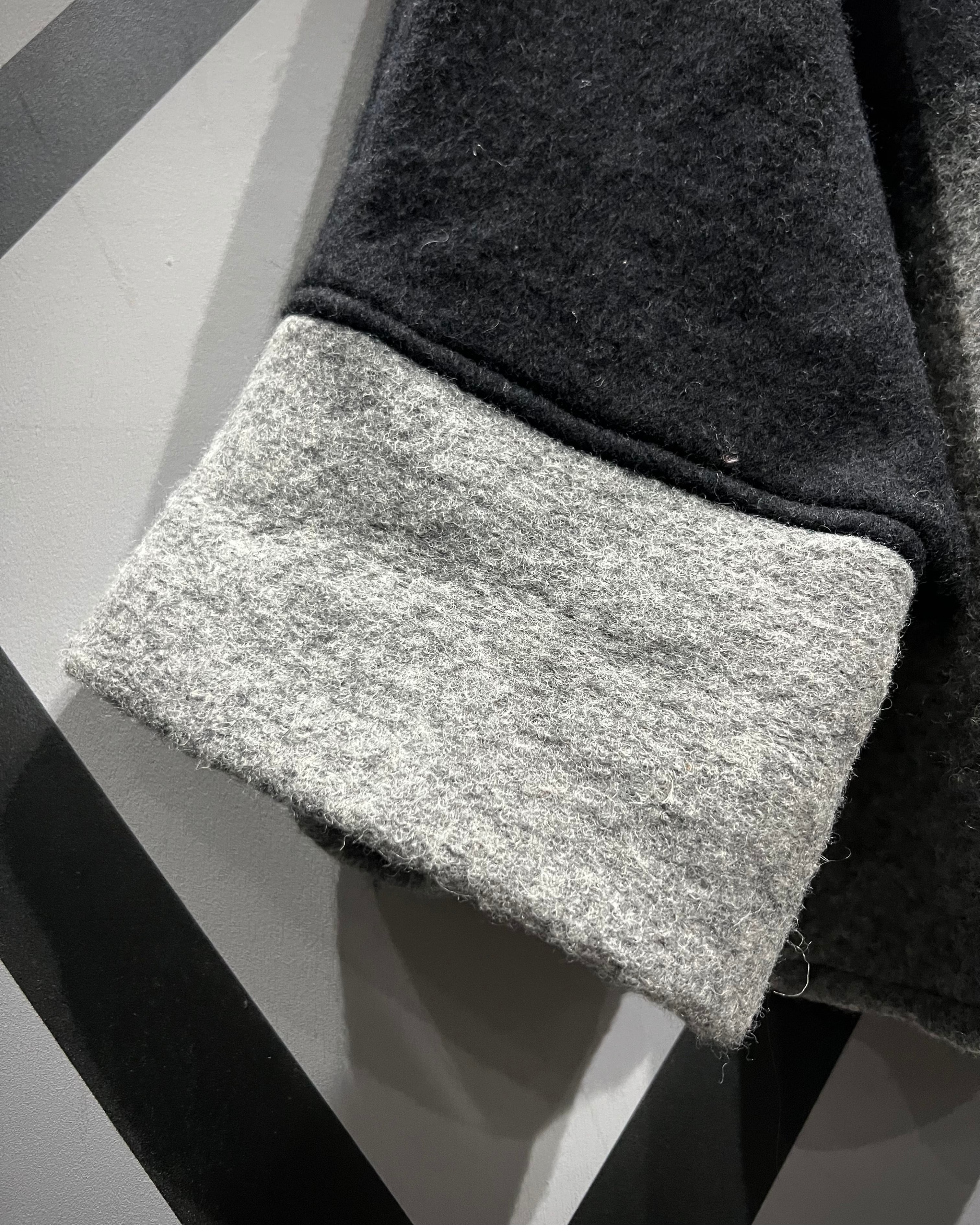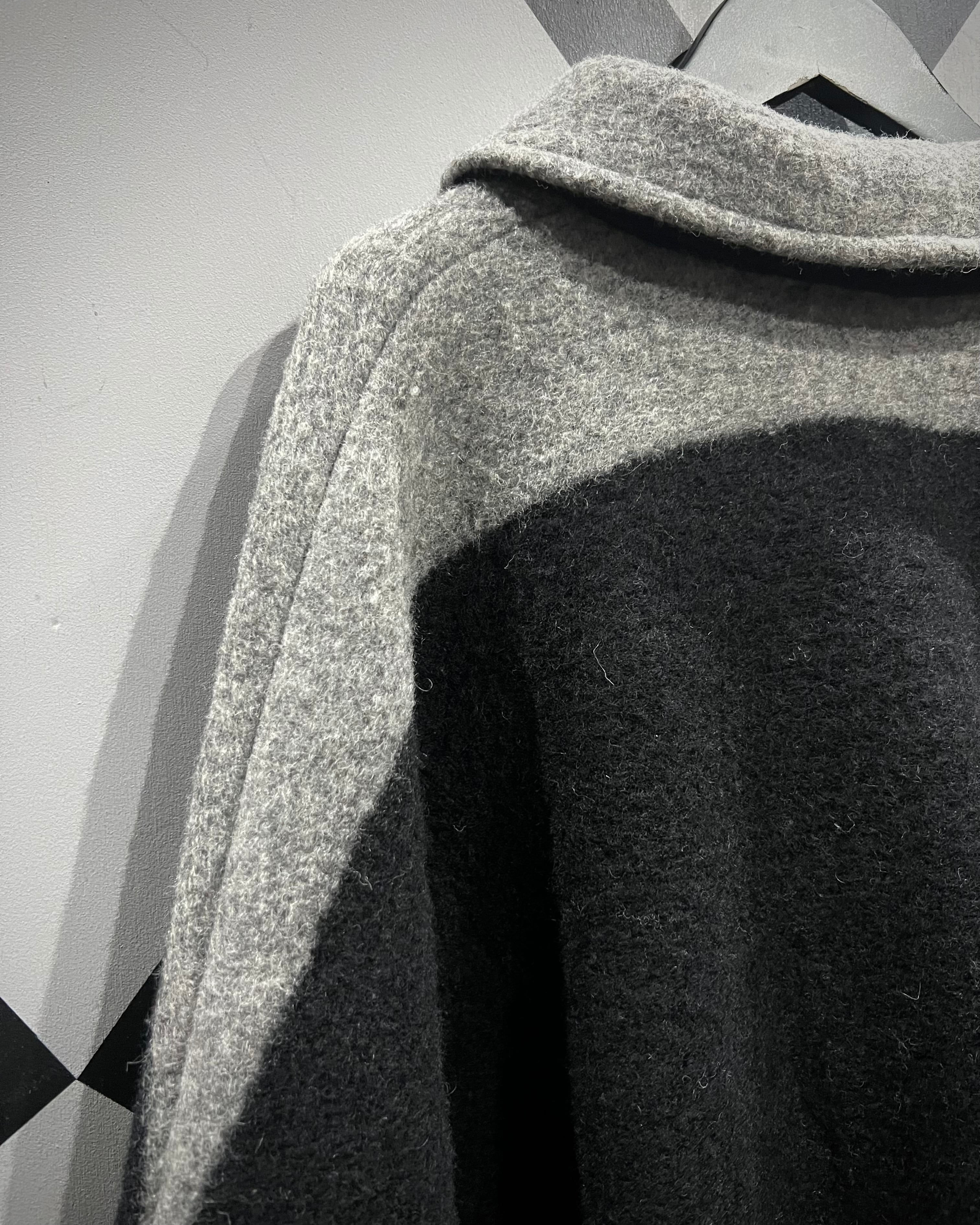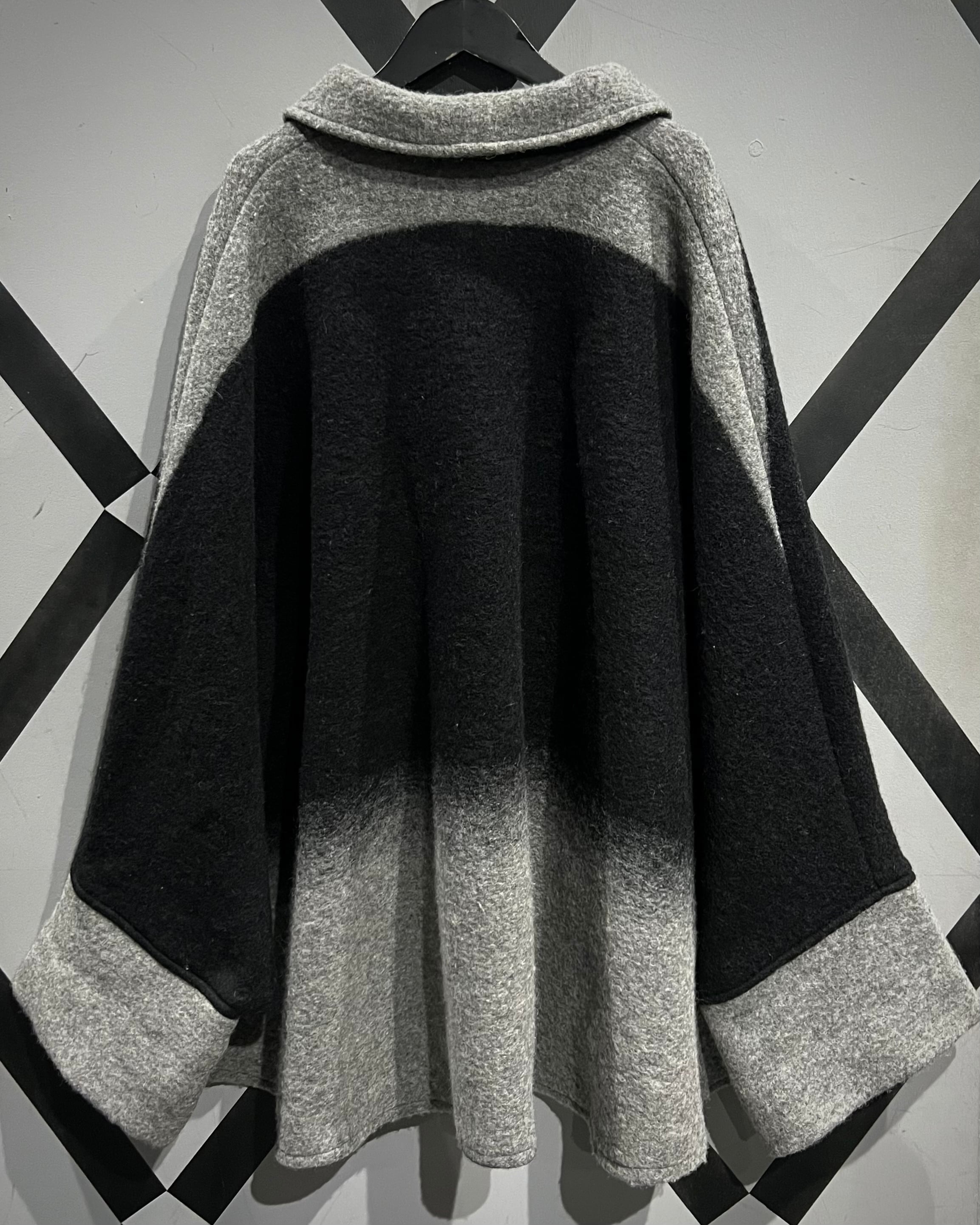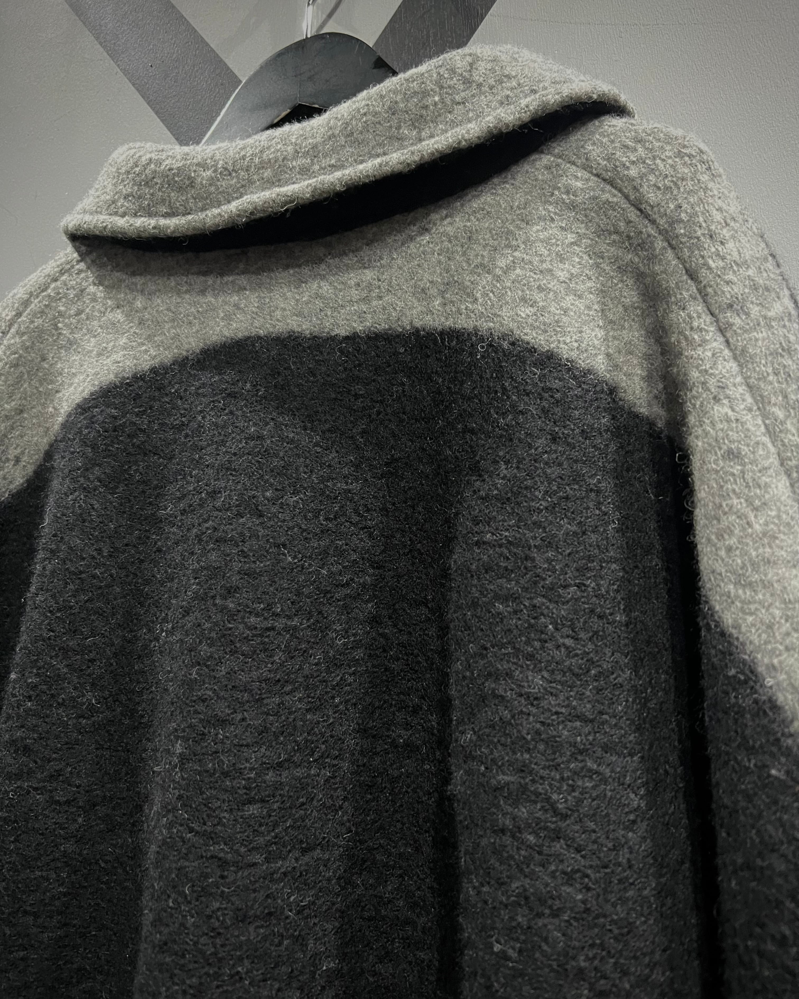 ボディには起毛感のあるふっくらとしたウール混の生地を使用し、保温性と軽やかさを両立。たっぷりとしたポンチョシルエットが生み出すドレープは、動くたびに流れるような美しさを描きます。