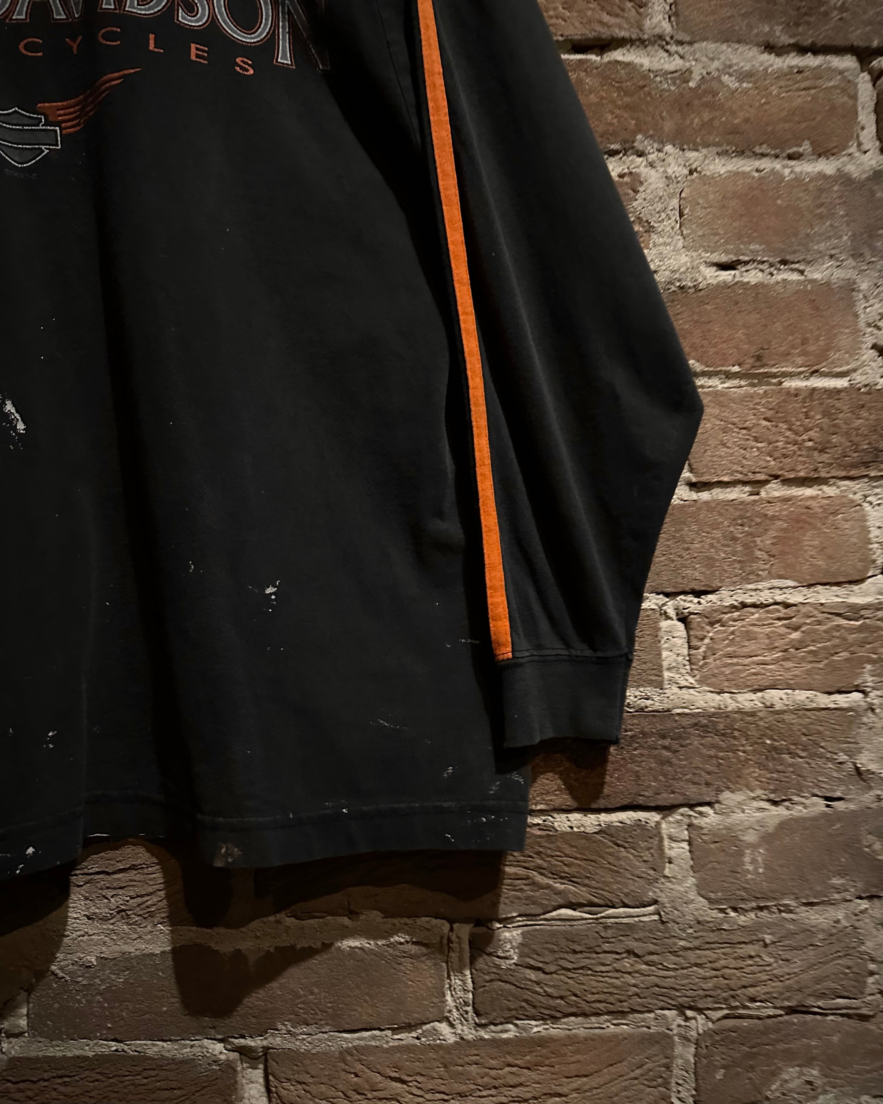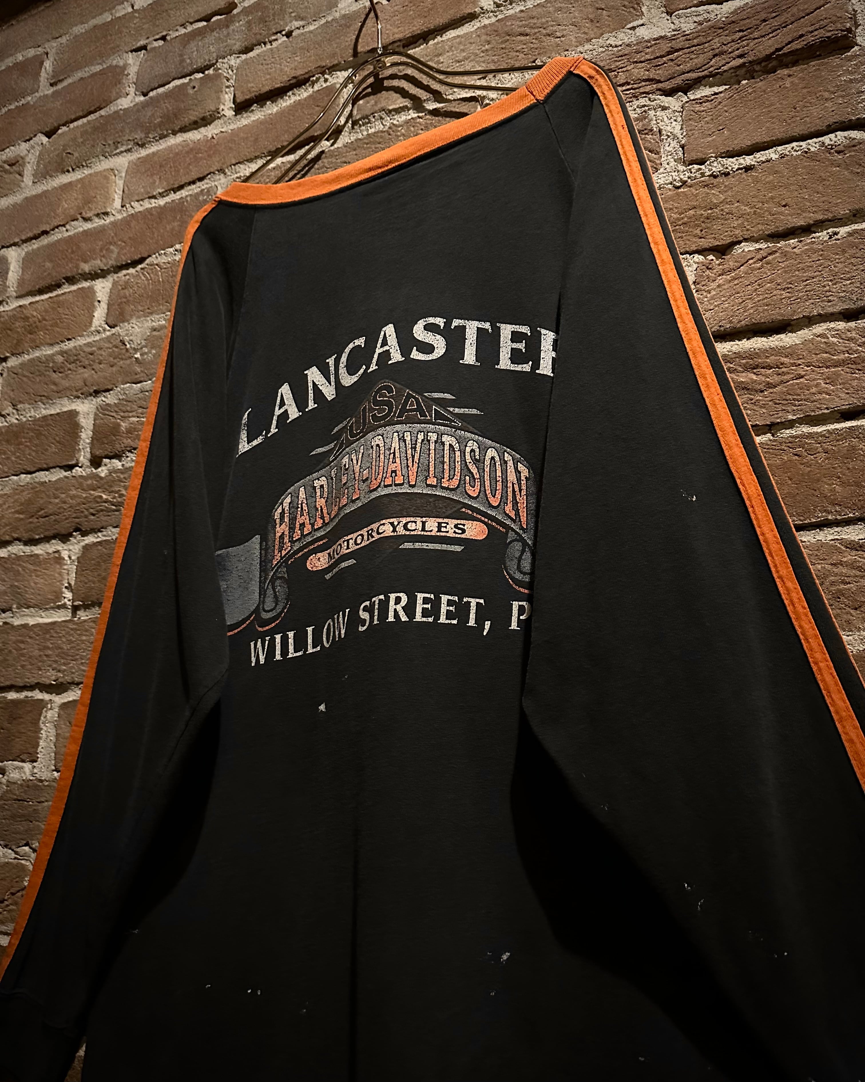 ネックとラインリブには鮮やかなオレンジを採用し、袖にかけて走るラインがスポーティかつストリートなアクセントに。フロントにはロゴ、背面には“LANCASTER HARLEY-DAVIDSON / PENNSYLVANIA”のショッププリントを施した、当時のローカルディーラー物ならではのデザインが光ります。