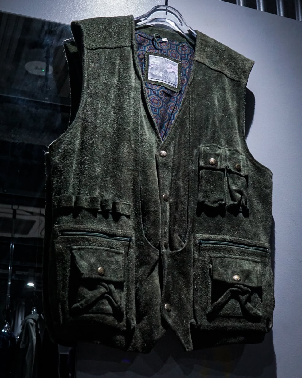 重厚なスエードの質感と、圧倒的なギミックディテールが魅力のハンティングベスト。