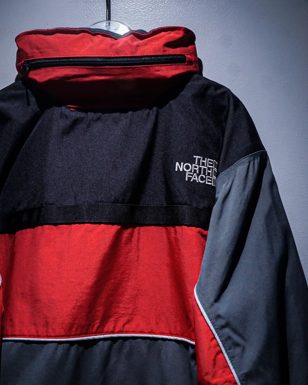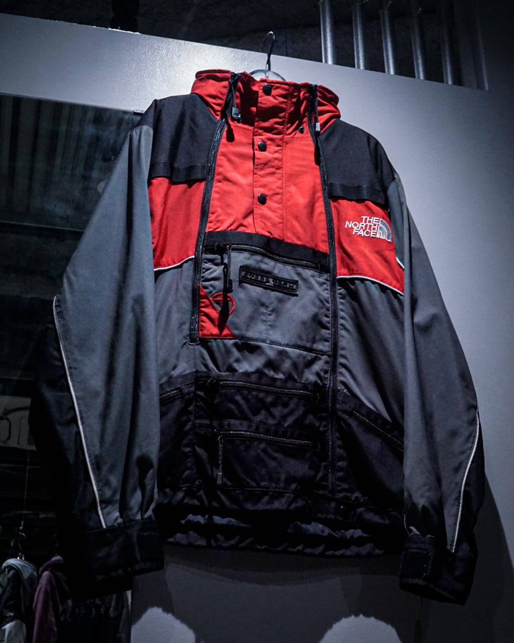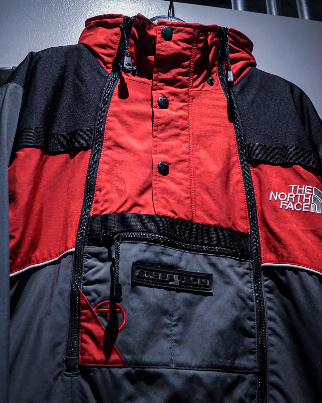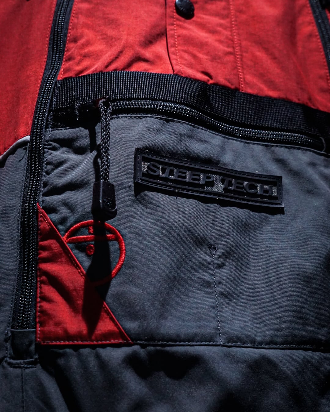レッド×ブラック×グレーの3トーンで切り替えを施したボディに、フロントには“STEEP TECH”ロゴパッチ、胸部にはジップ&フラップポケットを配置し、実用性とデザイン性を両立。アウトドアギアとしての機能性を確保しつつ、ストリートでも際立つ存在感を放ちます。