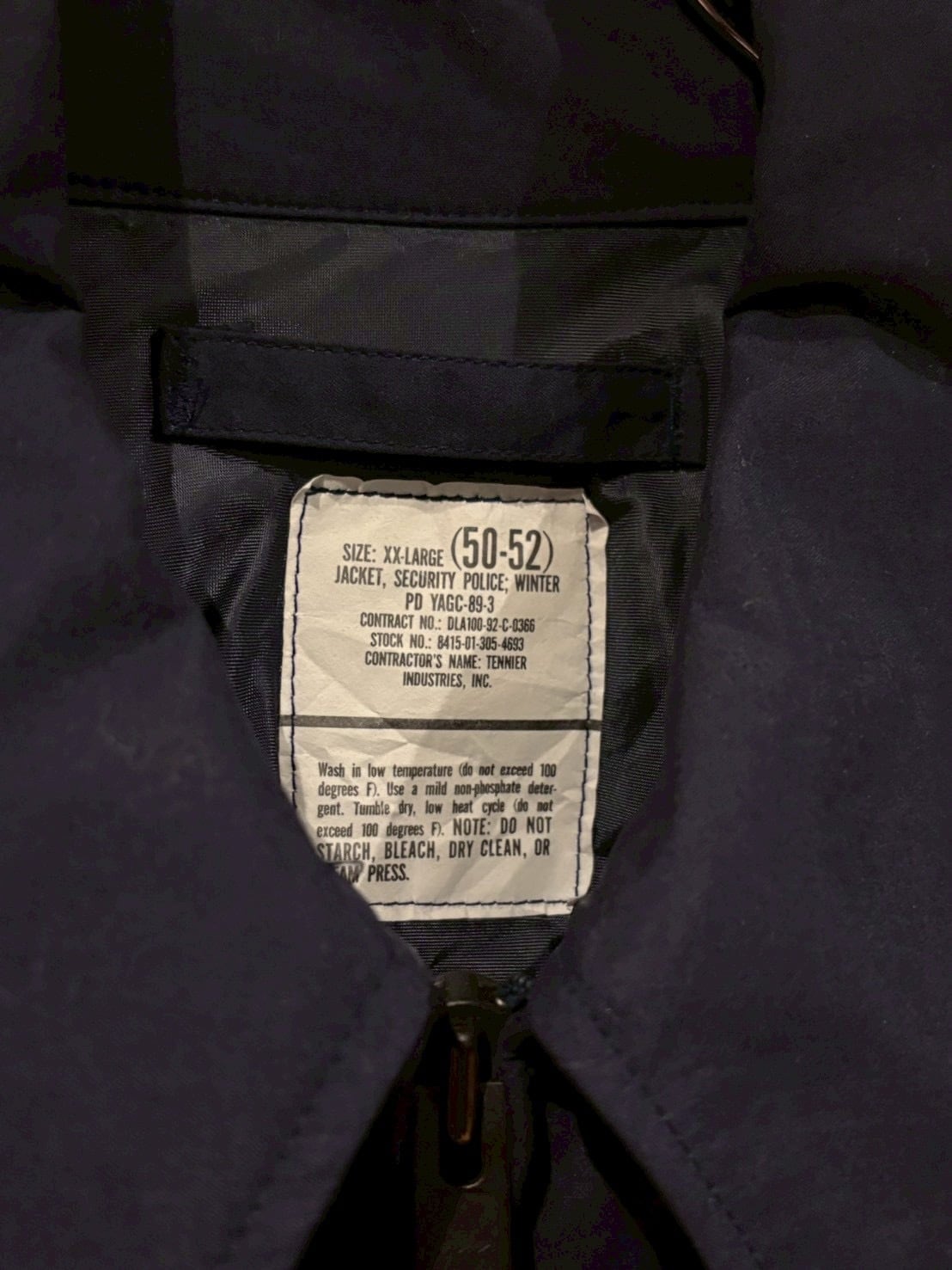 アメリカ軍のセキュリティポリス(警備部隊)向けに支給されていた、冬季用のポリスジャケット。米軍ミリタリーウェアの名門、Tennier Industries Inc. 製のオリジナルです。
