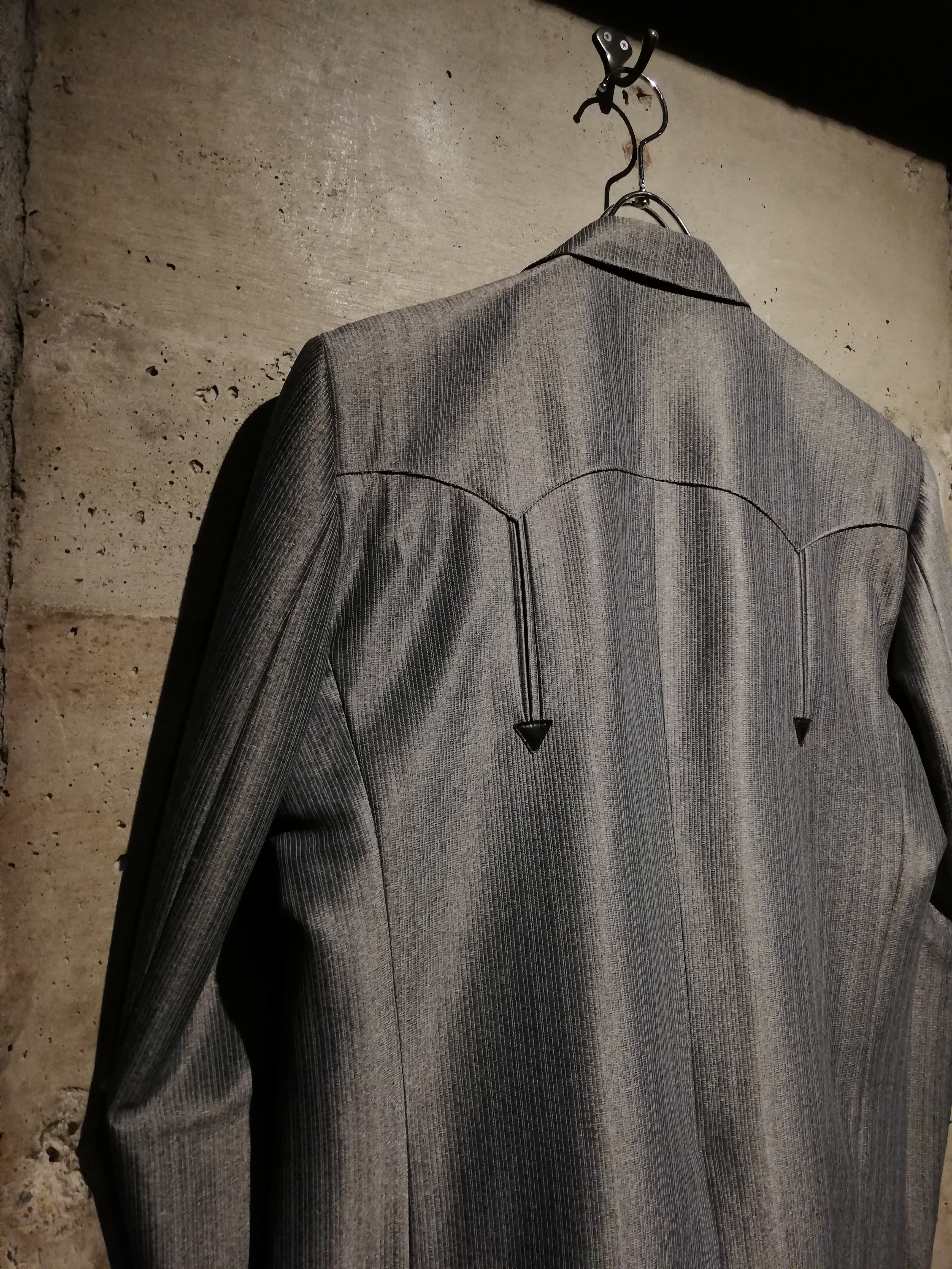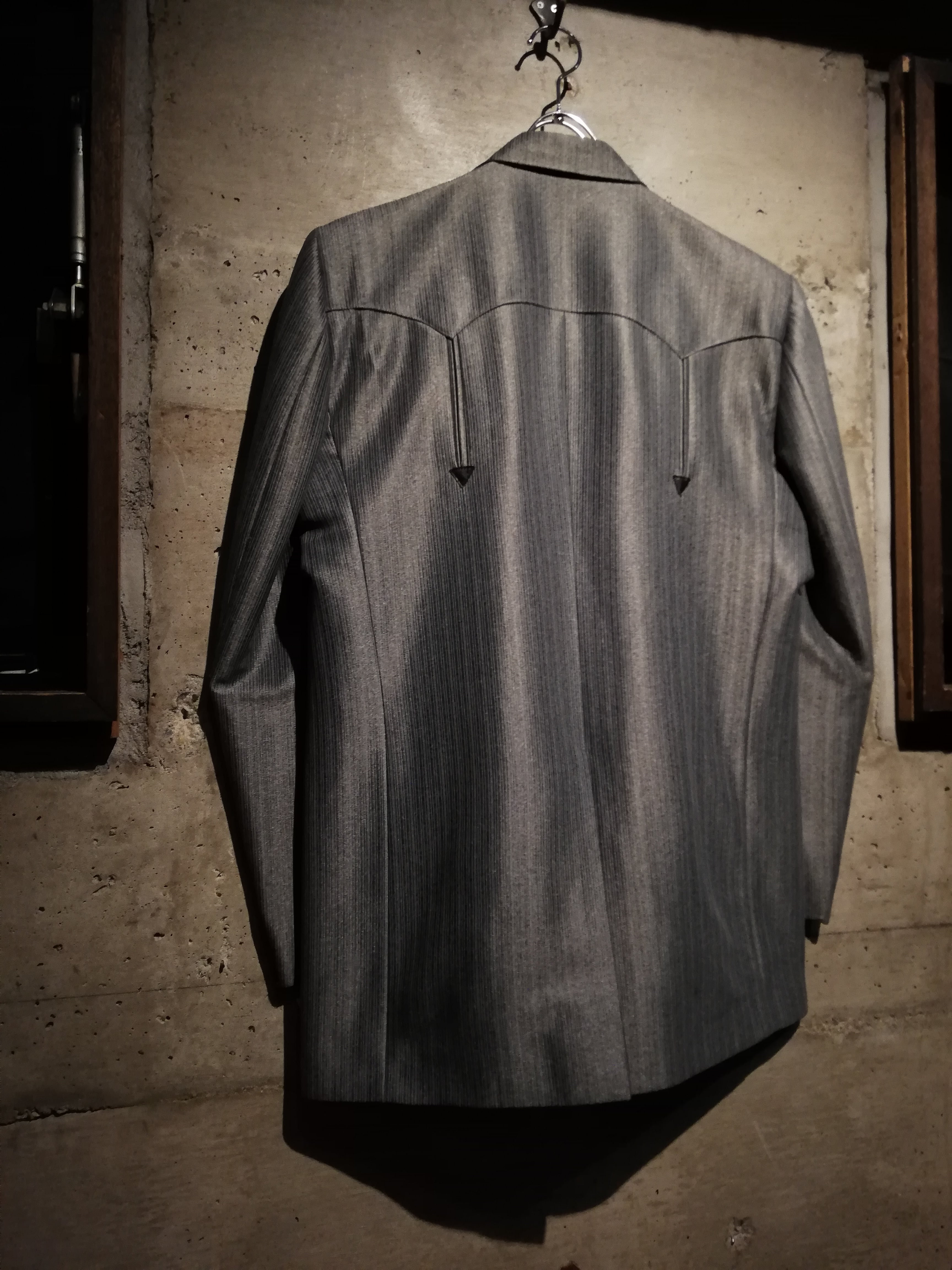 ストライプ状の織りを施した、気品漂う光沢を帯びた美しいテキスタイルをボディに採用し、フロントのヨークにリアルレザーを切り替えたウエスタン仕様のスペシャルなセットアップ。