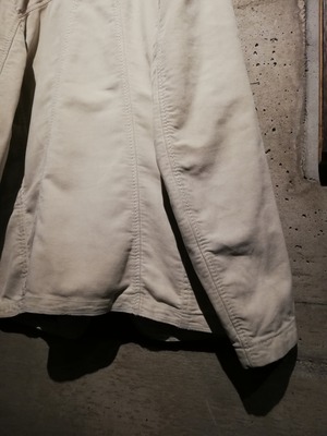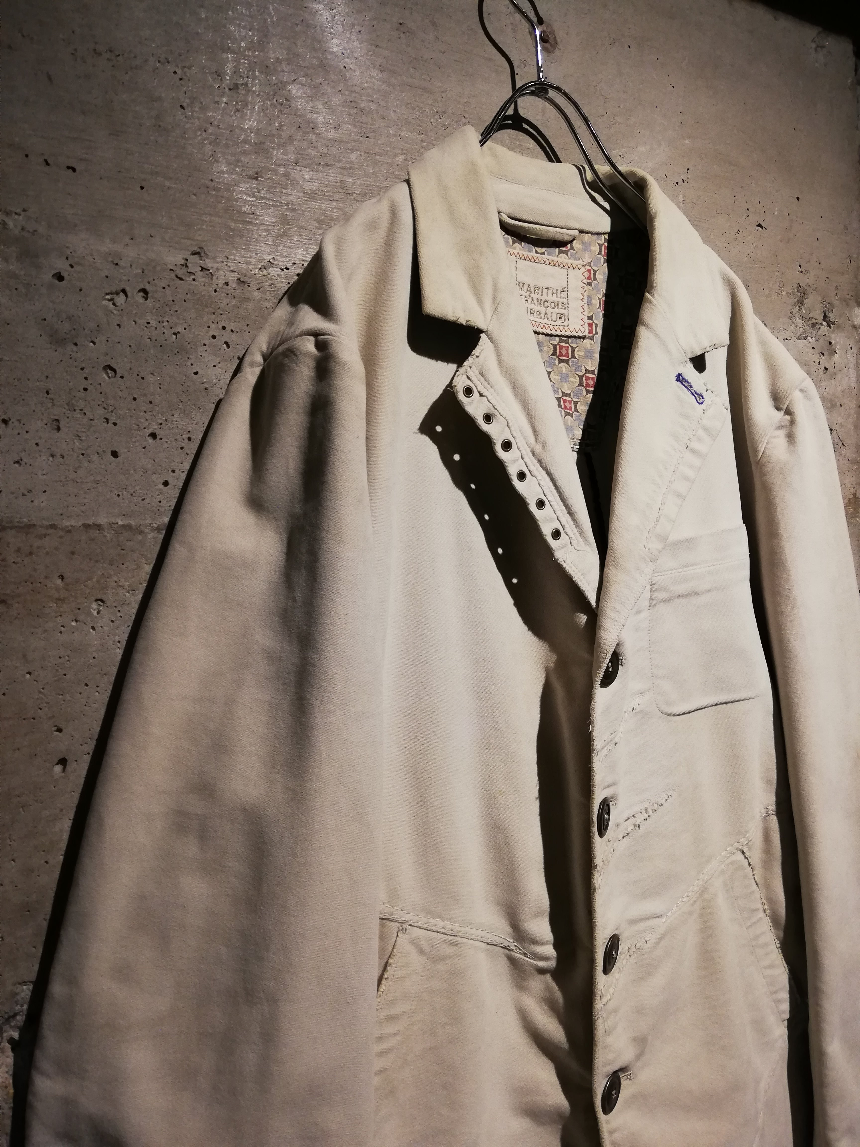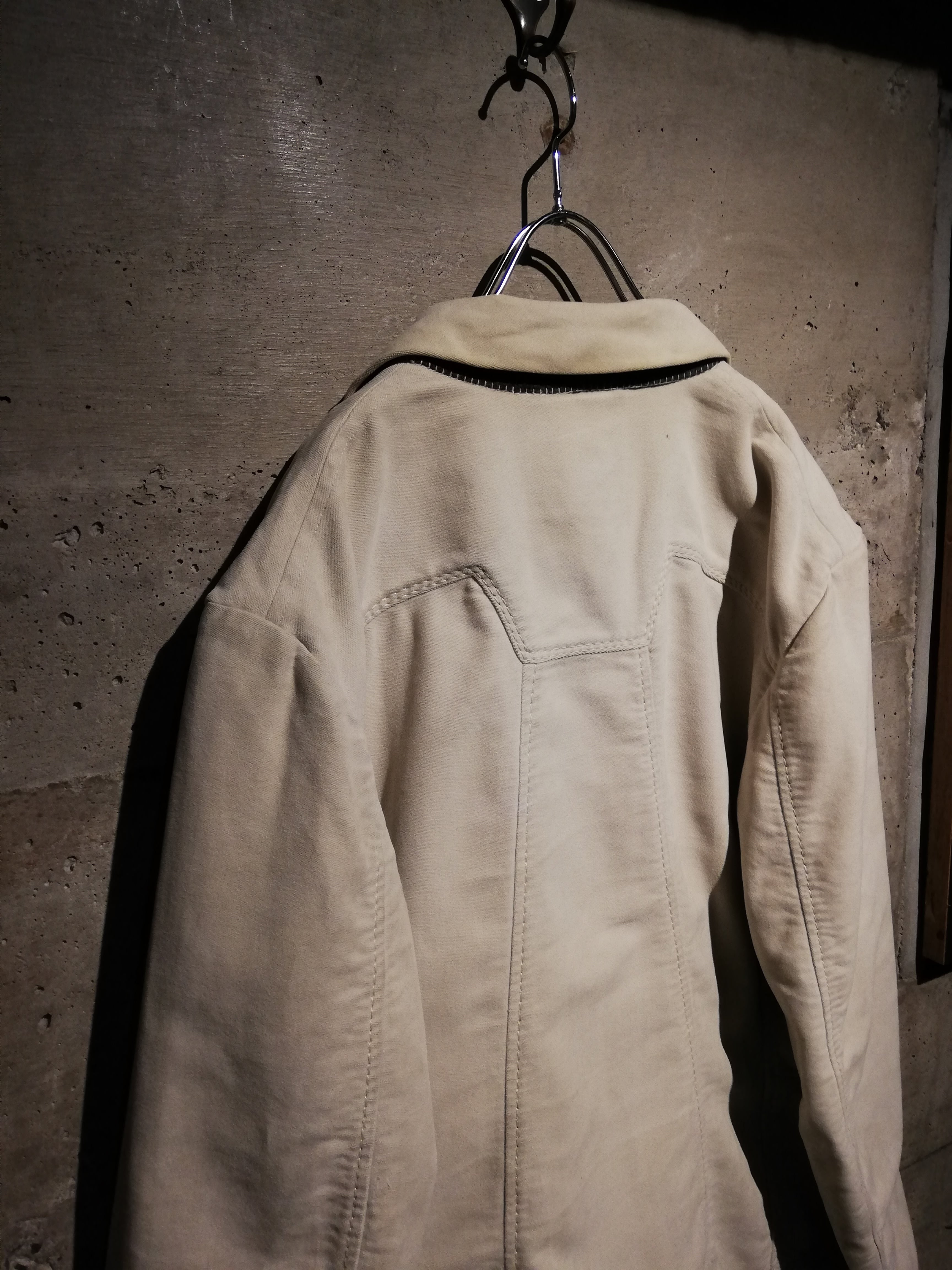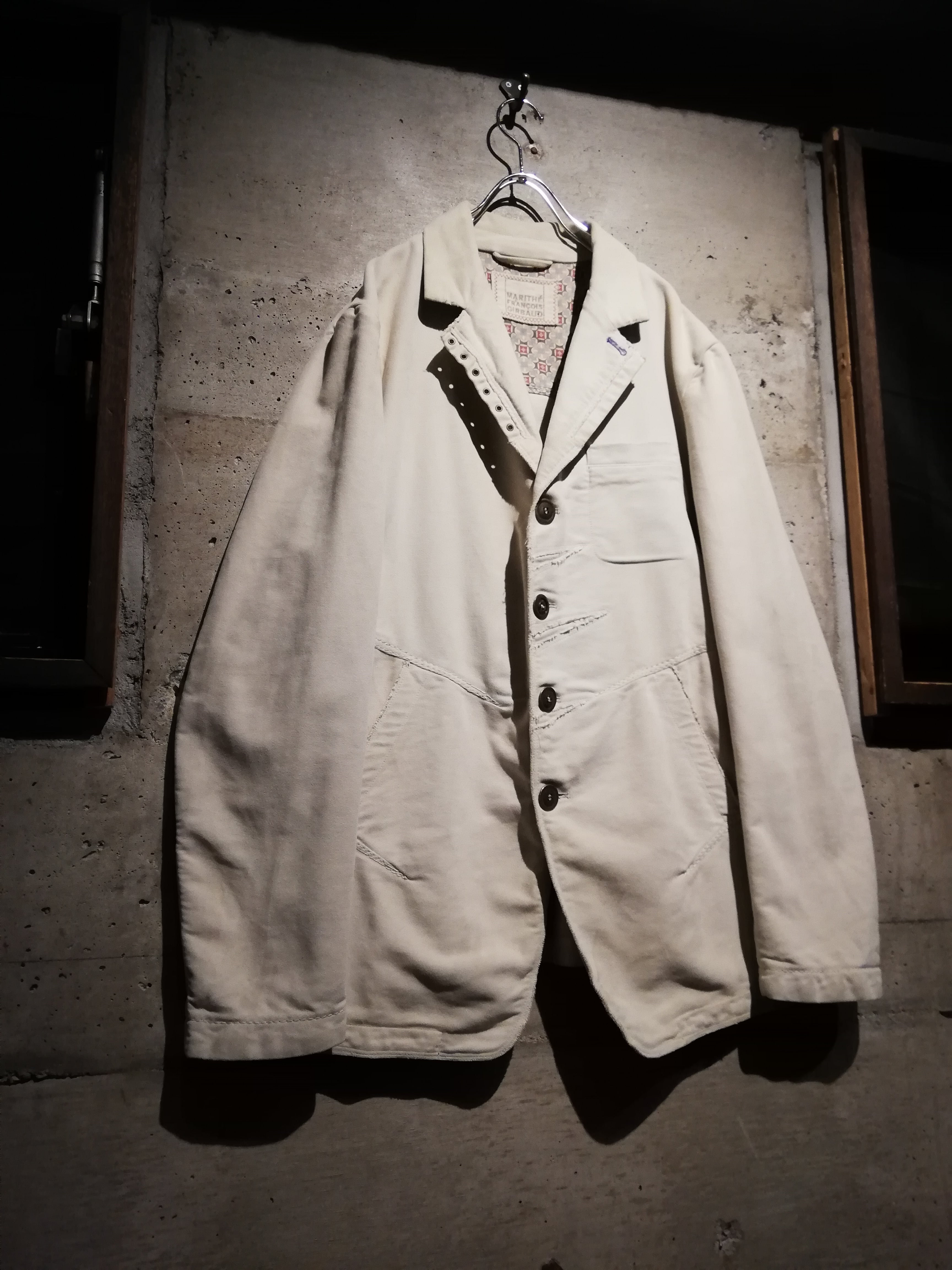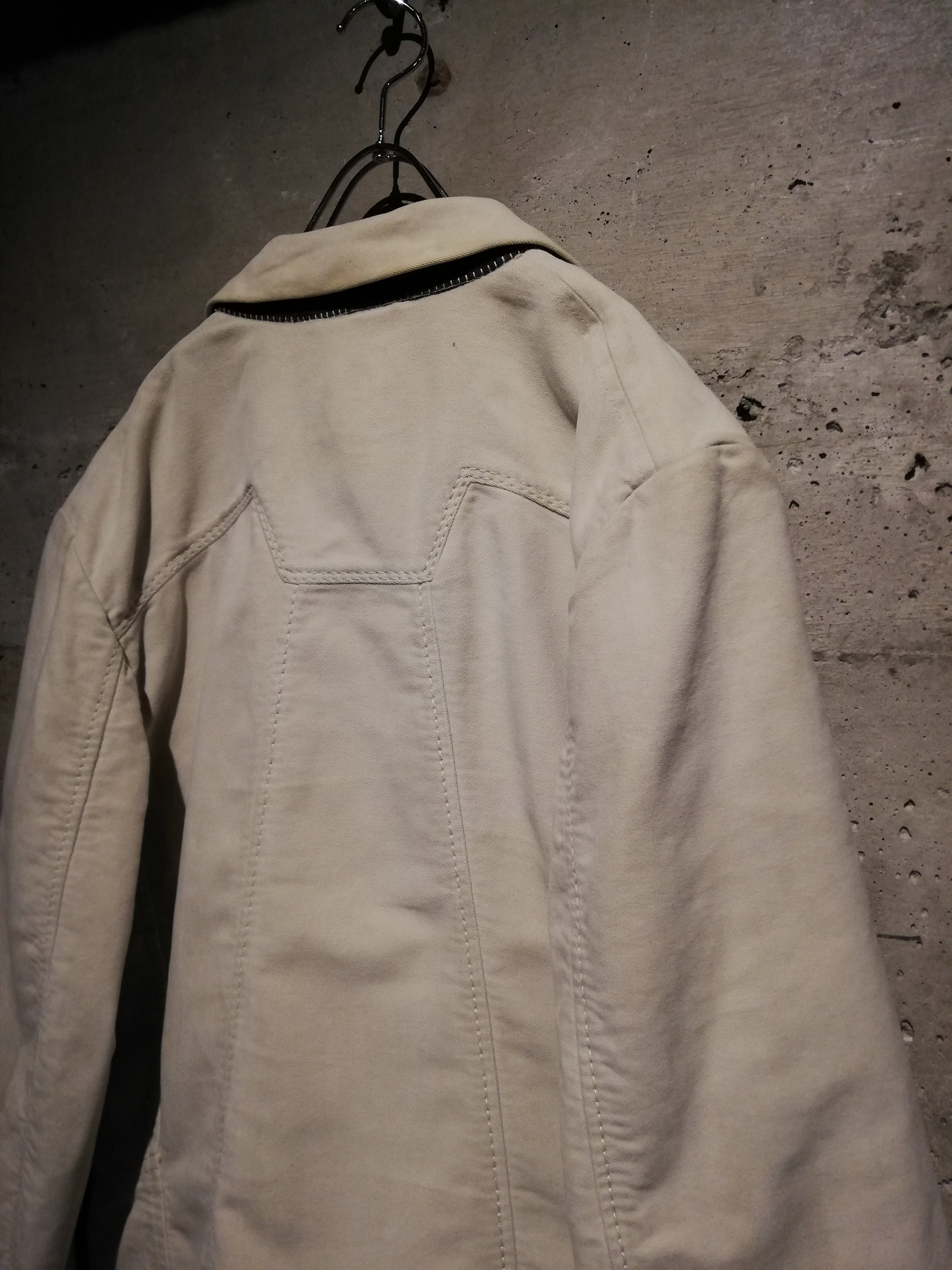 オフホワイトカラーの柔らかなモールスキンコットンをボディに使用し、ジルボーらしいクリエイティブな裁ち切りやディテールワークを随所に散りばめた1着。