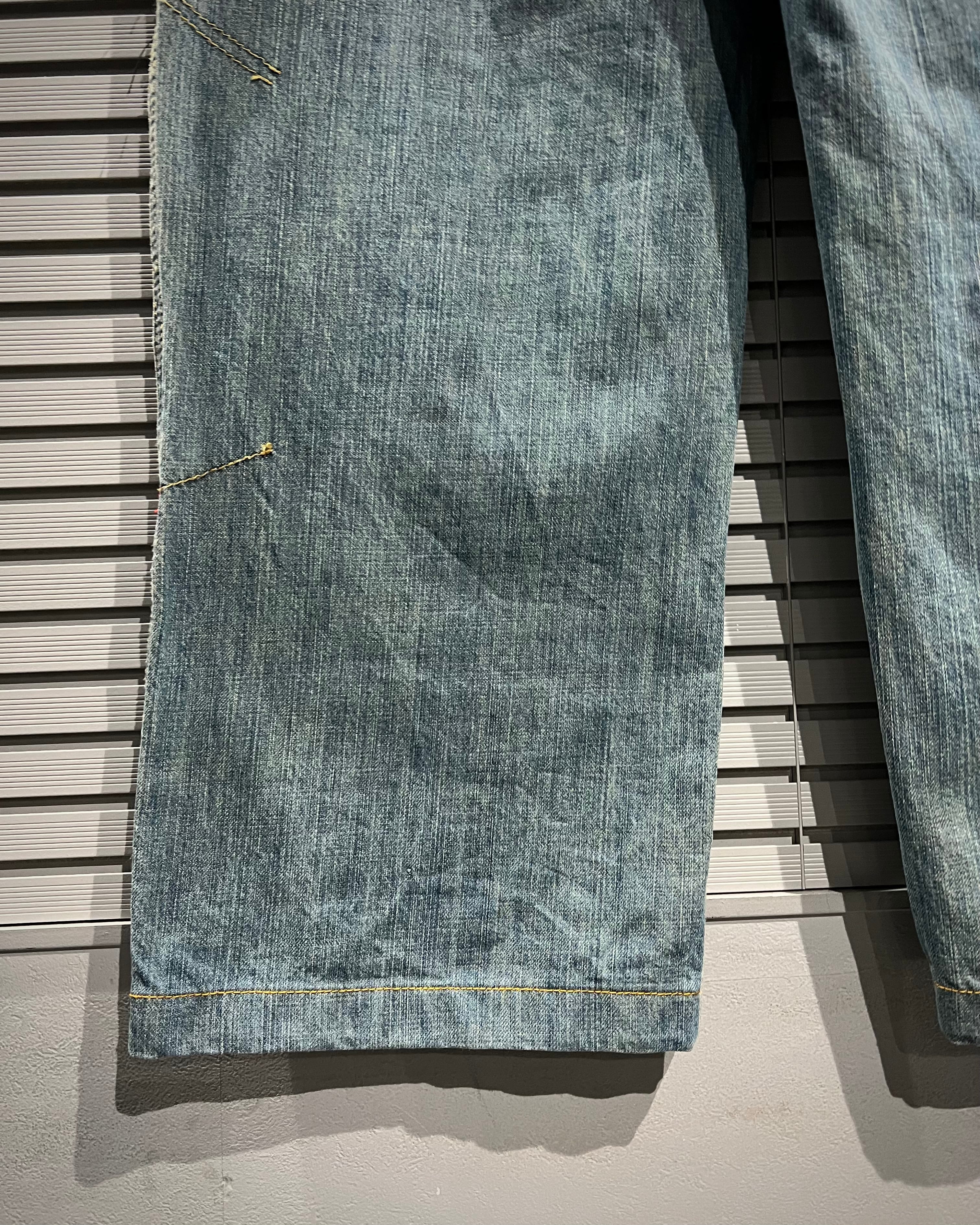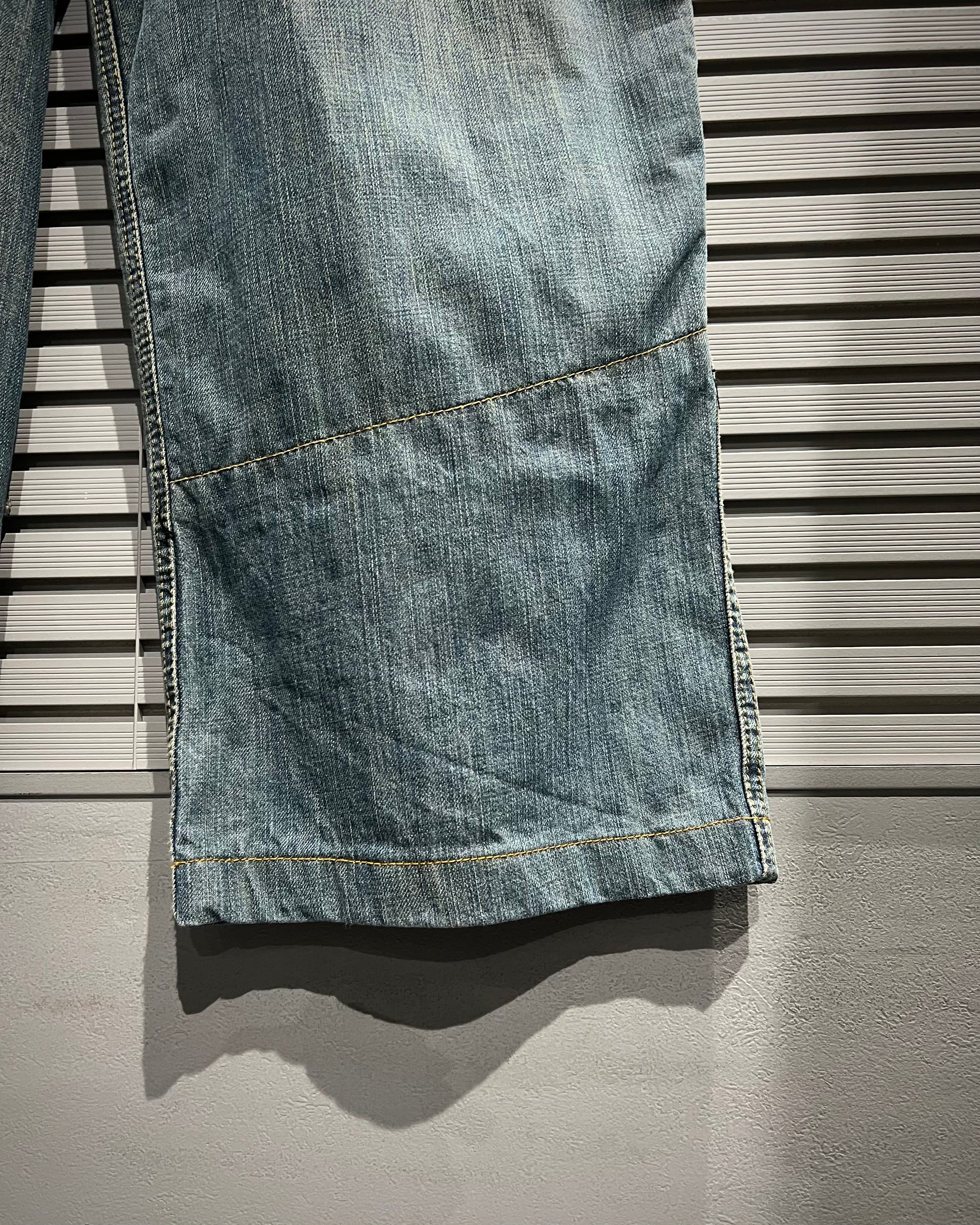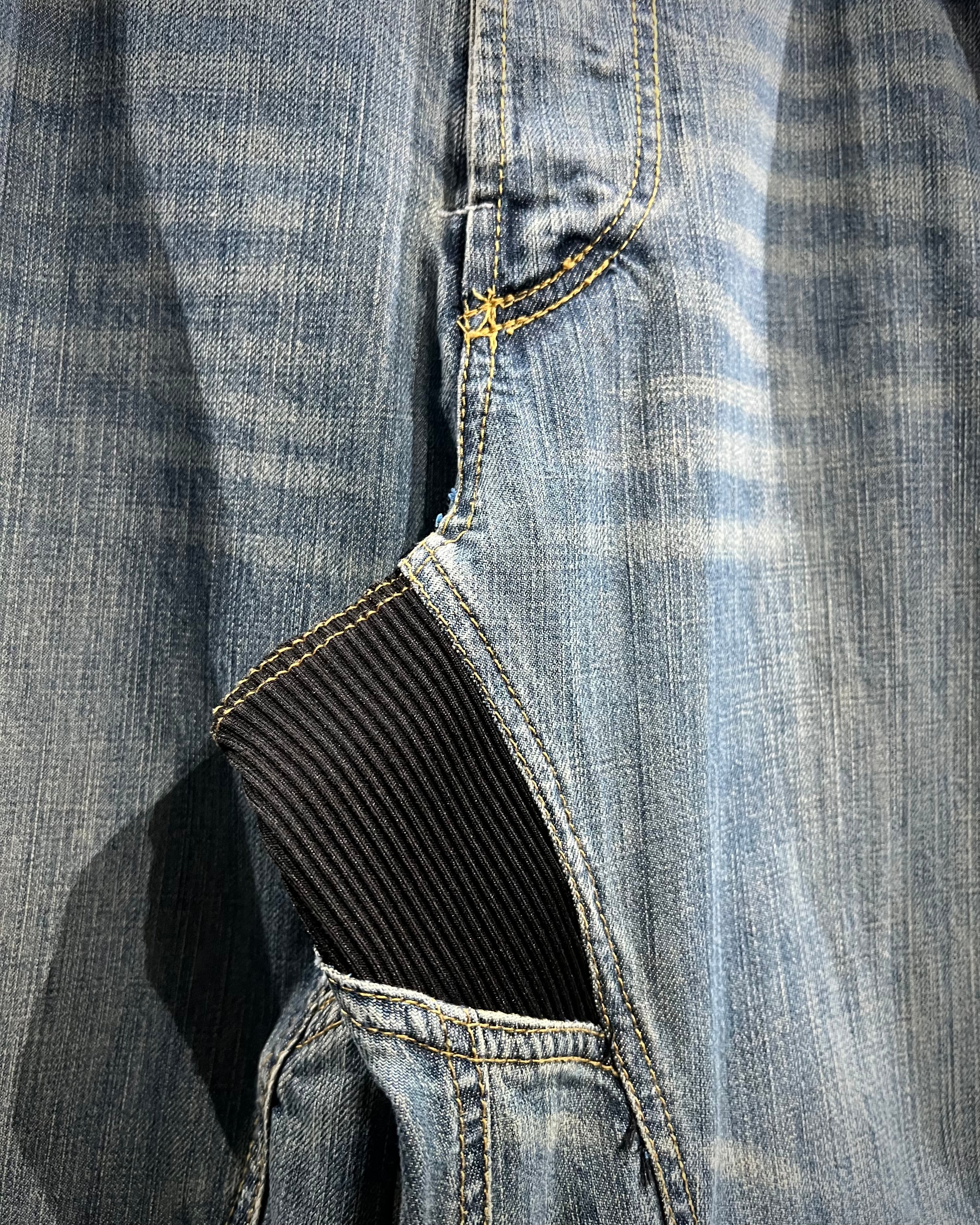 デニム地は程よくフェードしたライトブルーで、リアルなアタリが自然に入った表情豊かな風合い。着用の重ねることでより一層深みのある表情へと仕上がっていきます。