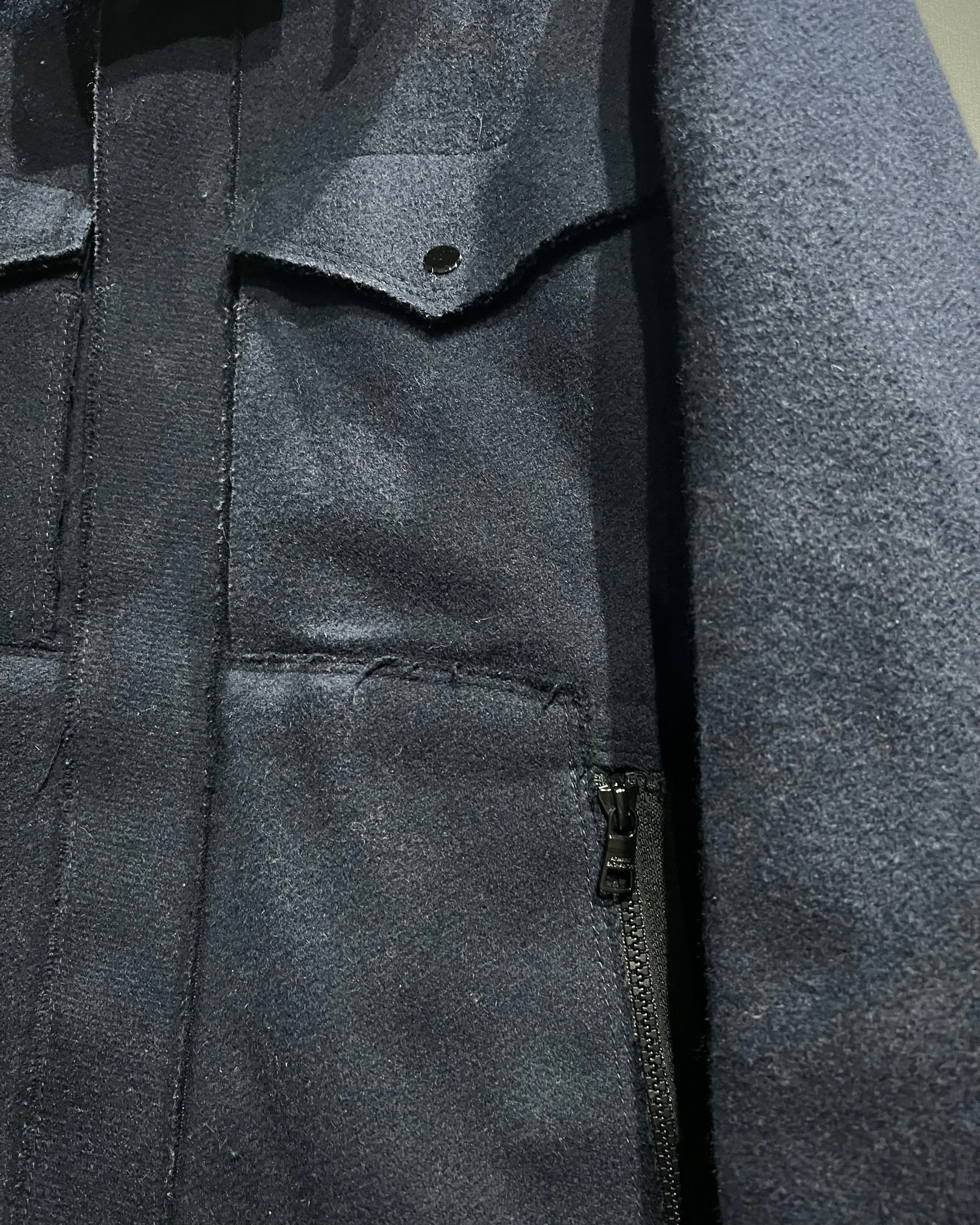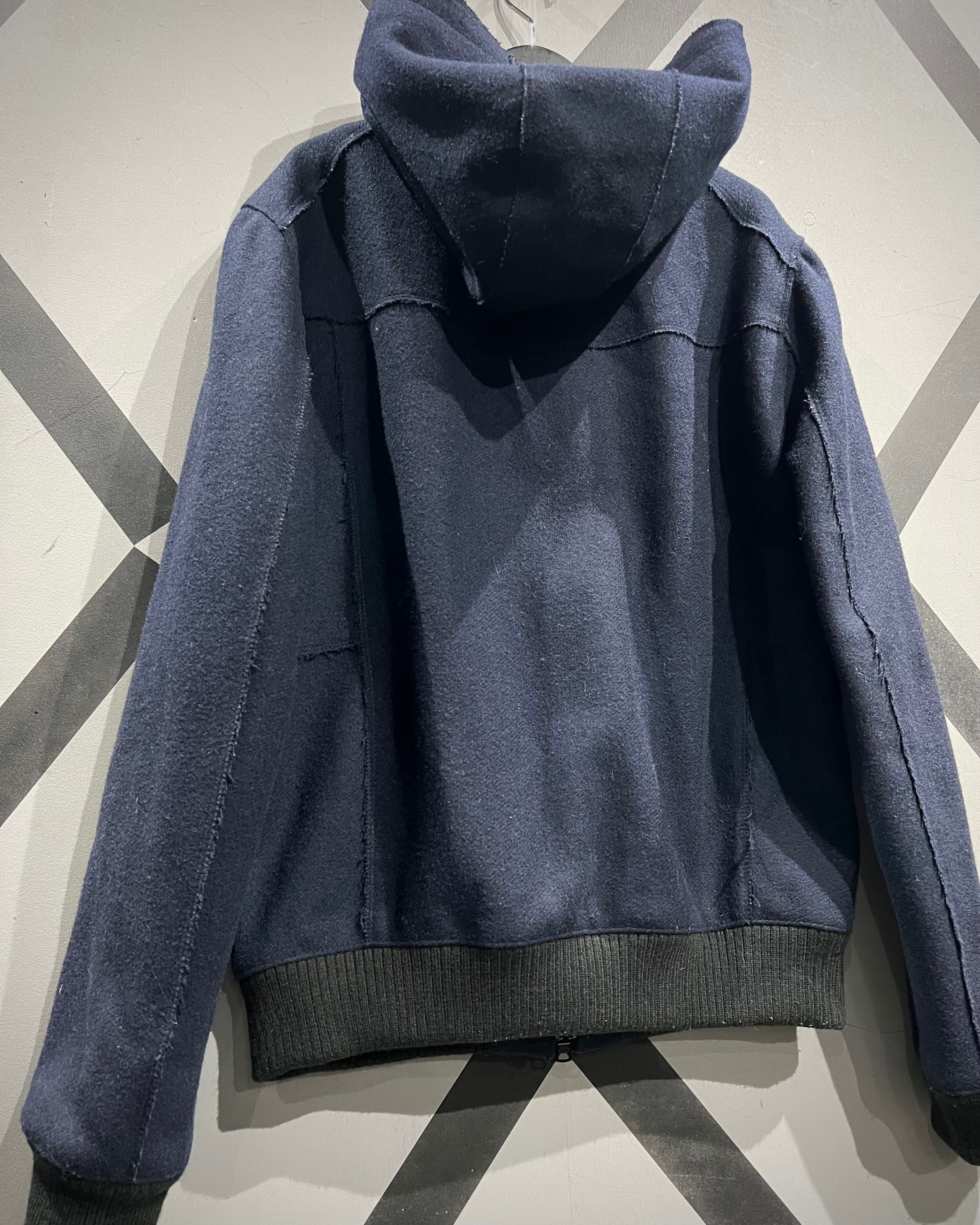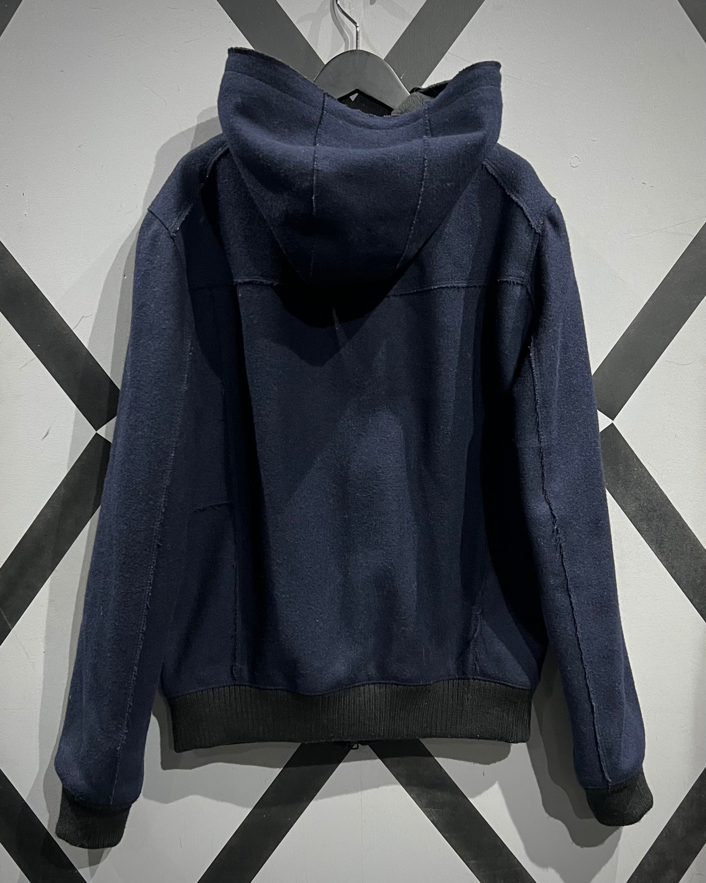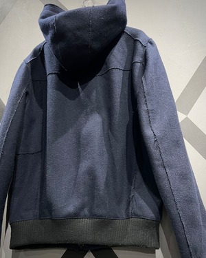 フロントはジップアップ+スナップボタン仕様。立体的なフードデザインが首周りに自然なボリュームを生み、リブ仕様の裾と袖口が全体を引き締めるバランスの取れたシルエット。ミニマルな中にもA|Xらしい構築的な美しさが際立ちます。