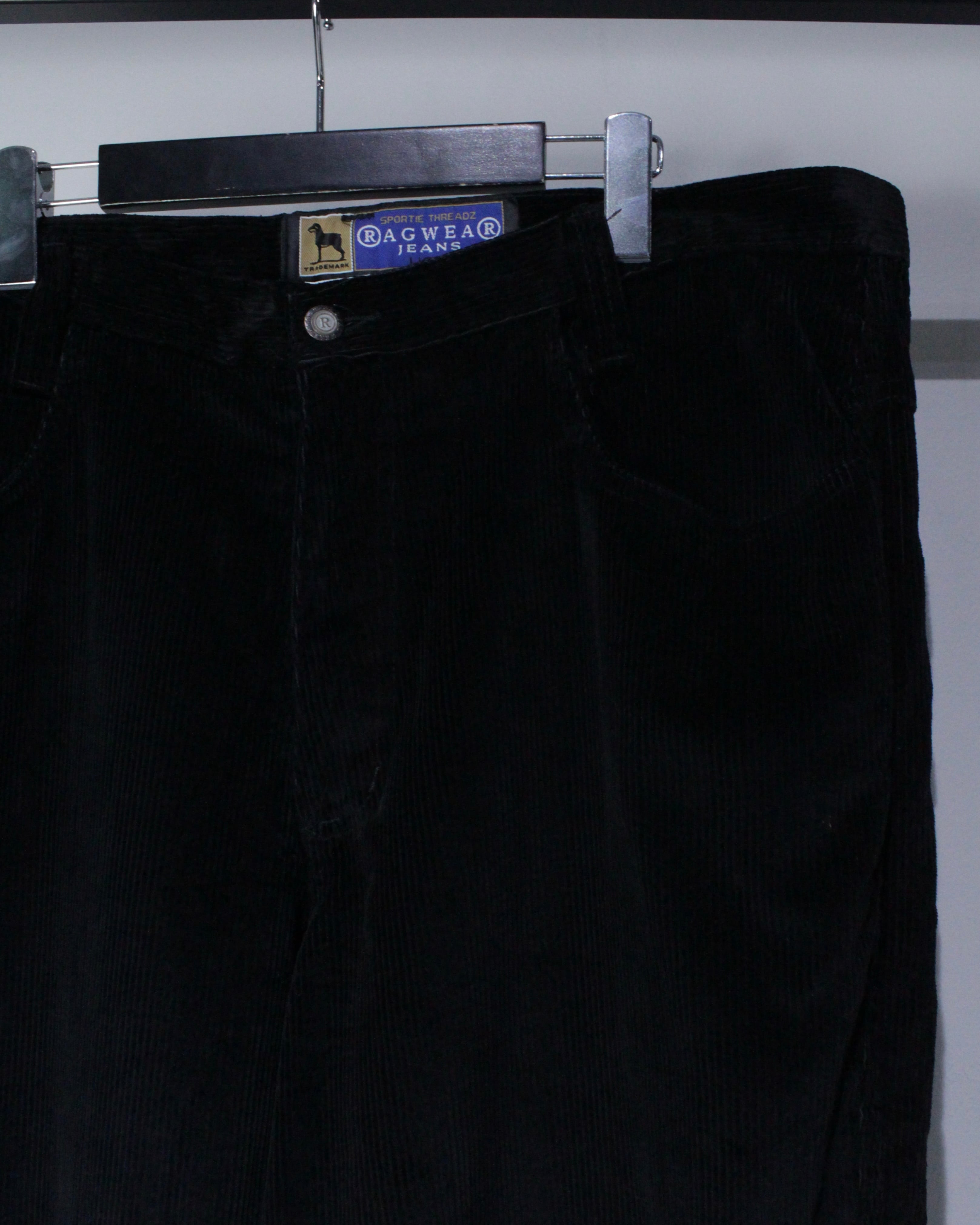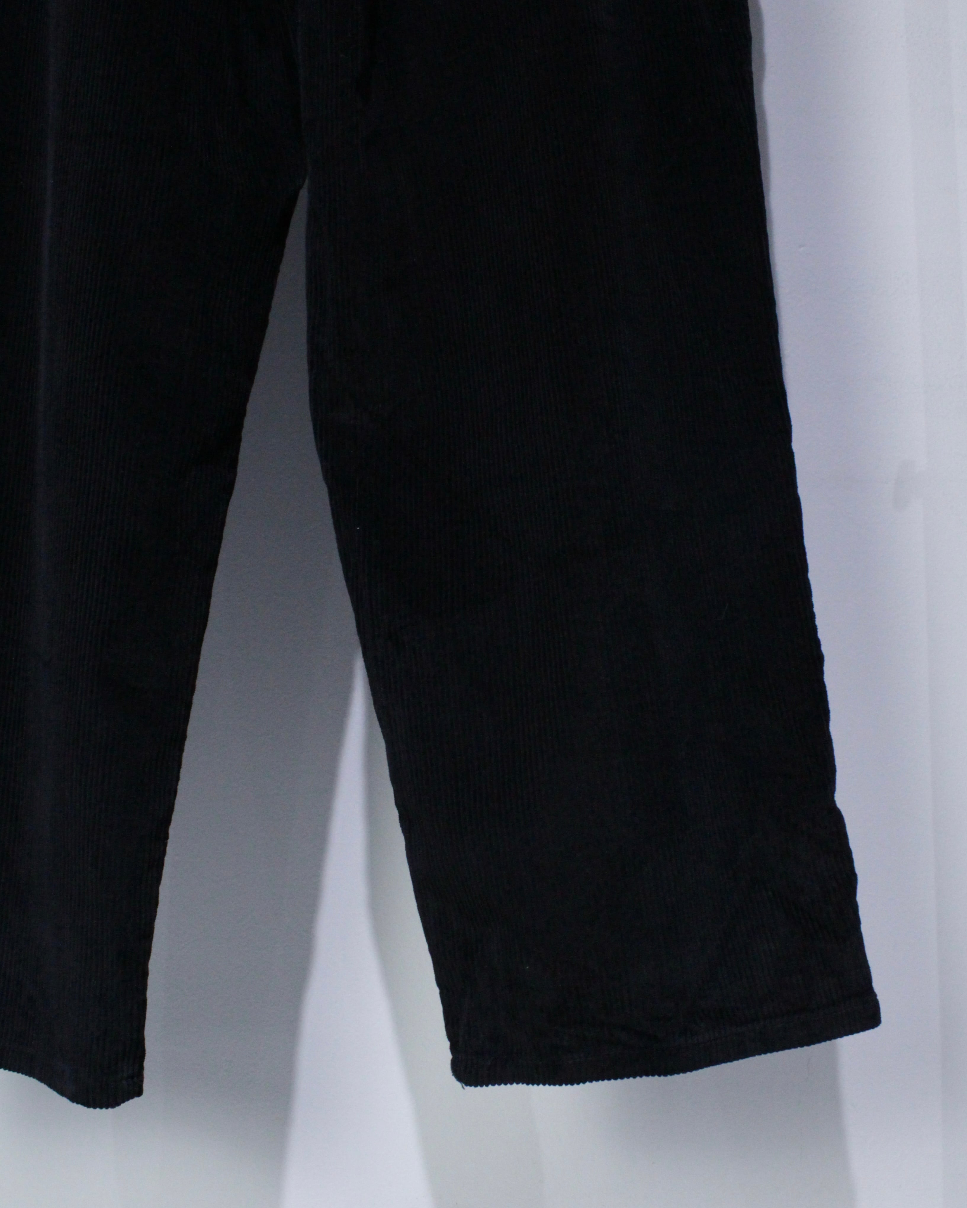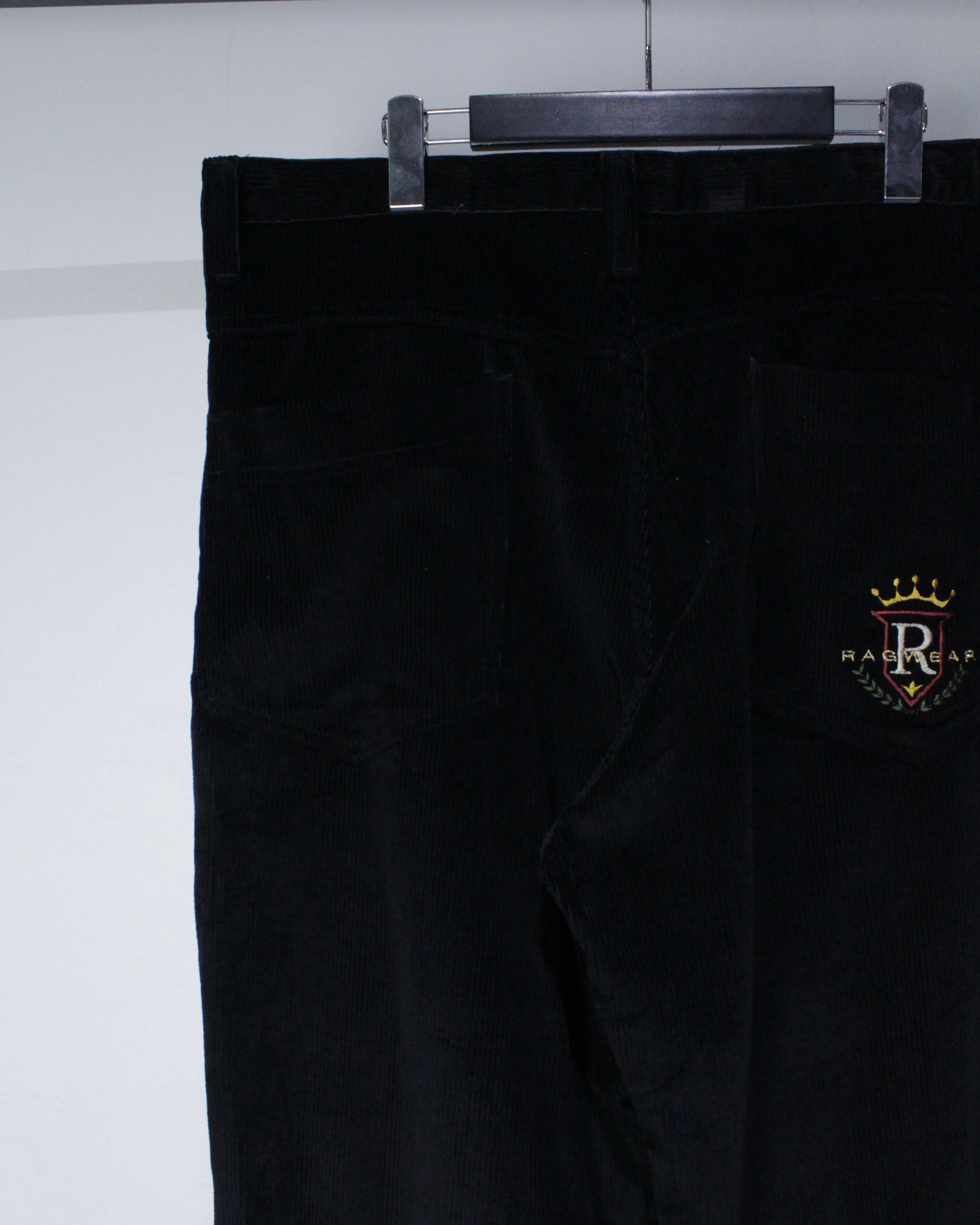 艶感を抑えた深いブラックコーデュロイを用いたボティに、刺繍ロゴを刻んだパンツ。