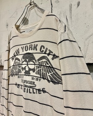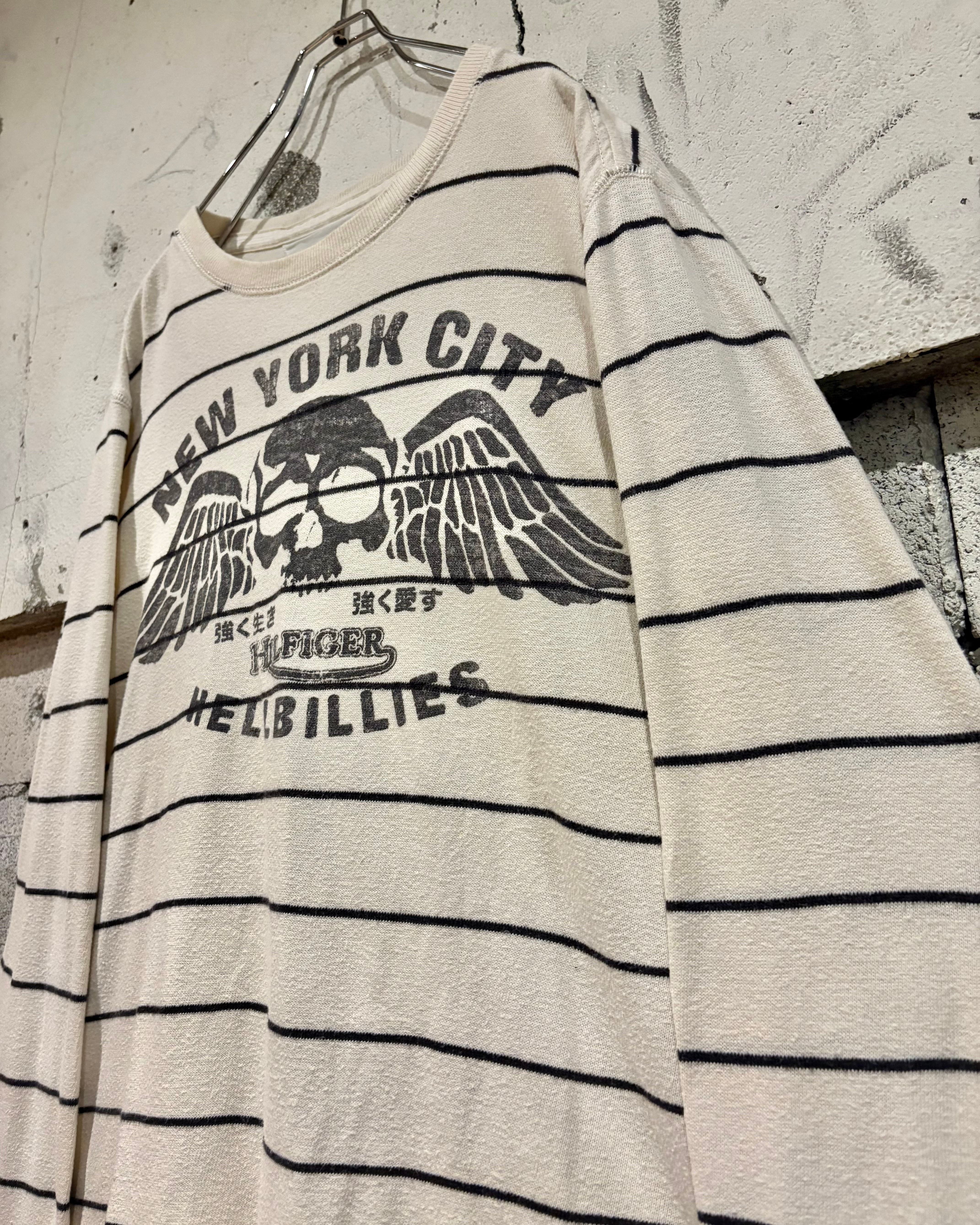 フロントには「NEW YORK CITY」「HELLBILLIES」の文字とともに、羽を広げたスカルを大胆にプリント。さらに中央には“強く生き 強く愛す”という日本語のメッセージを配置し、独特の存在感を放つ仕上がりに。