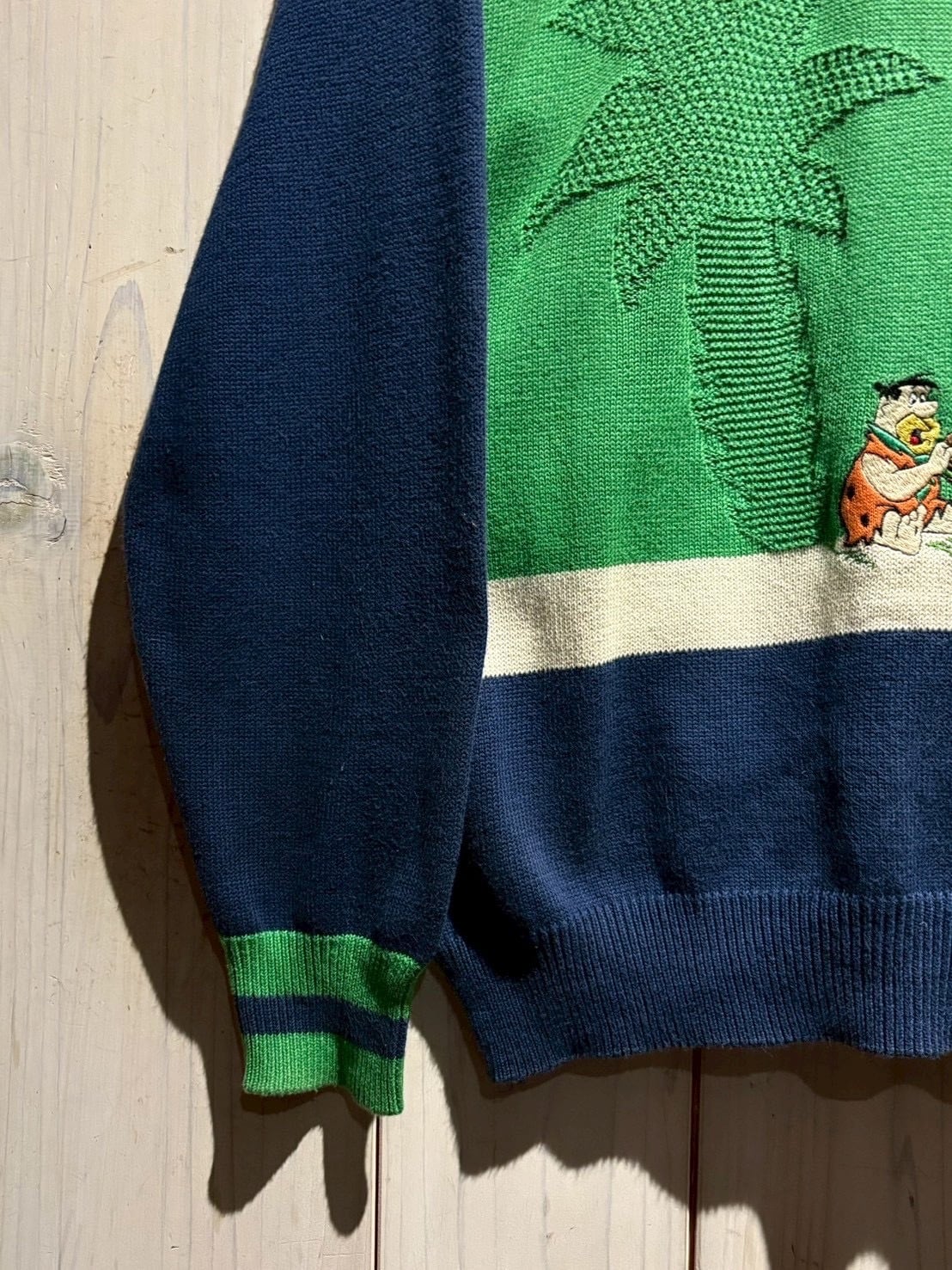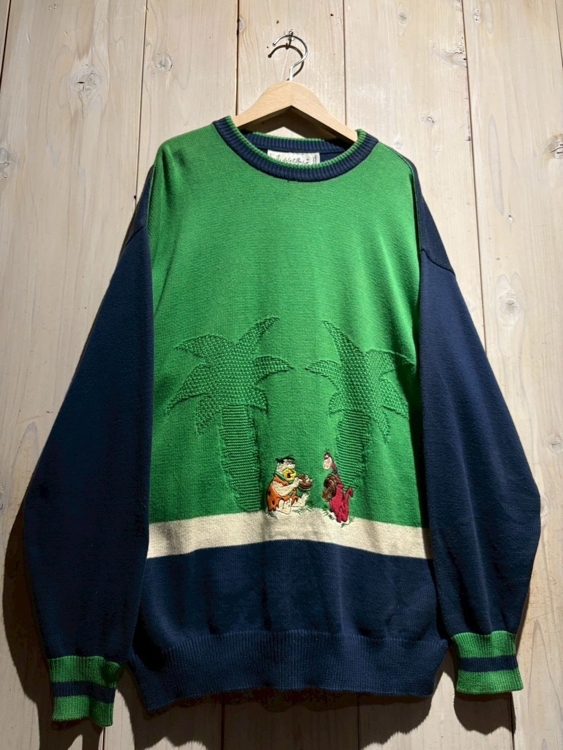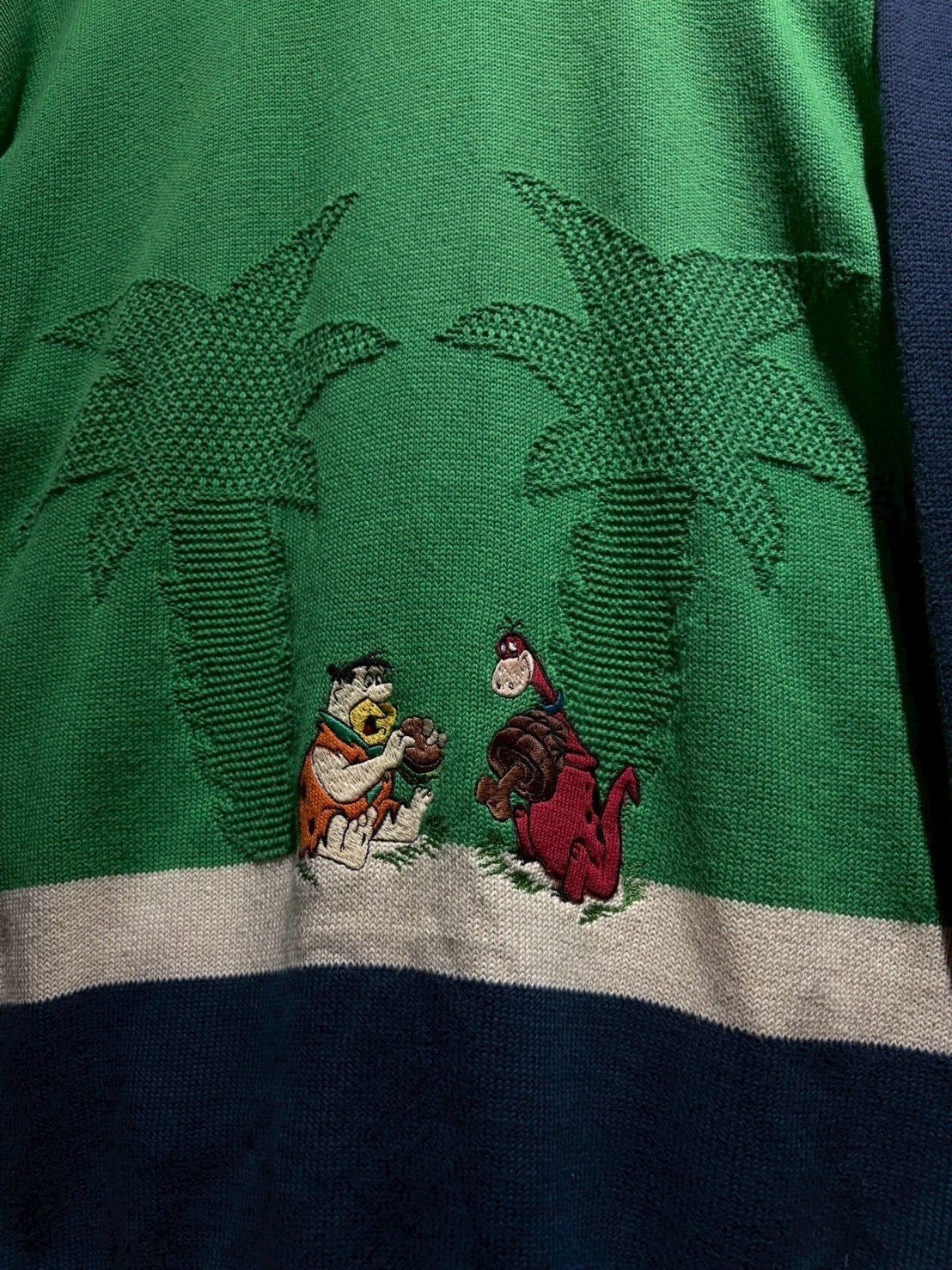 鮮やかなグリーン×ネイビーの切り替えをベースに、フロントにはパームツリーの立体的な編み模様と、原始家族のキャラクター刺繍を配置。背面には「THE FLINTSTONES」のロゴがニットで浮かび上がる遊び心あるデザインに仕上げられています。