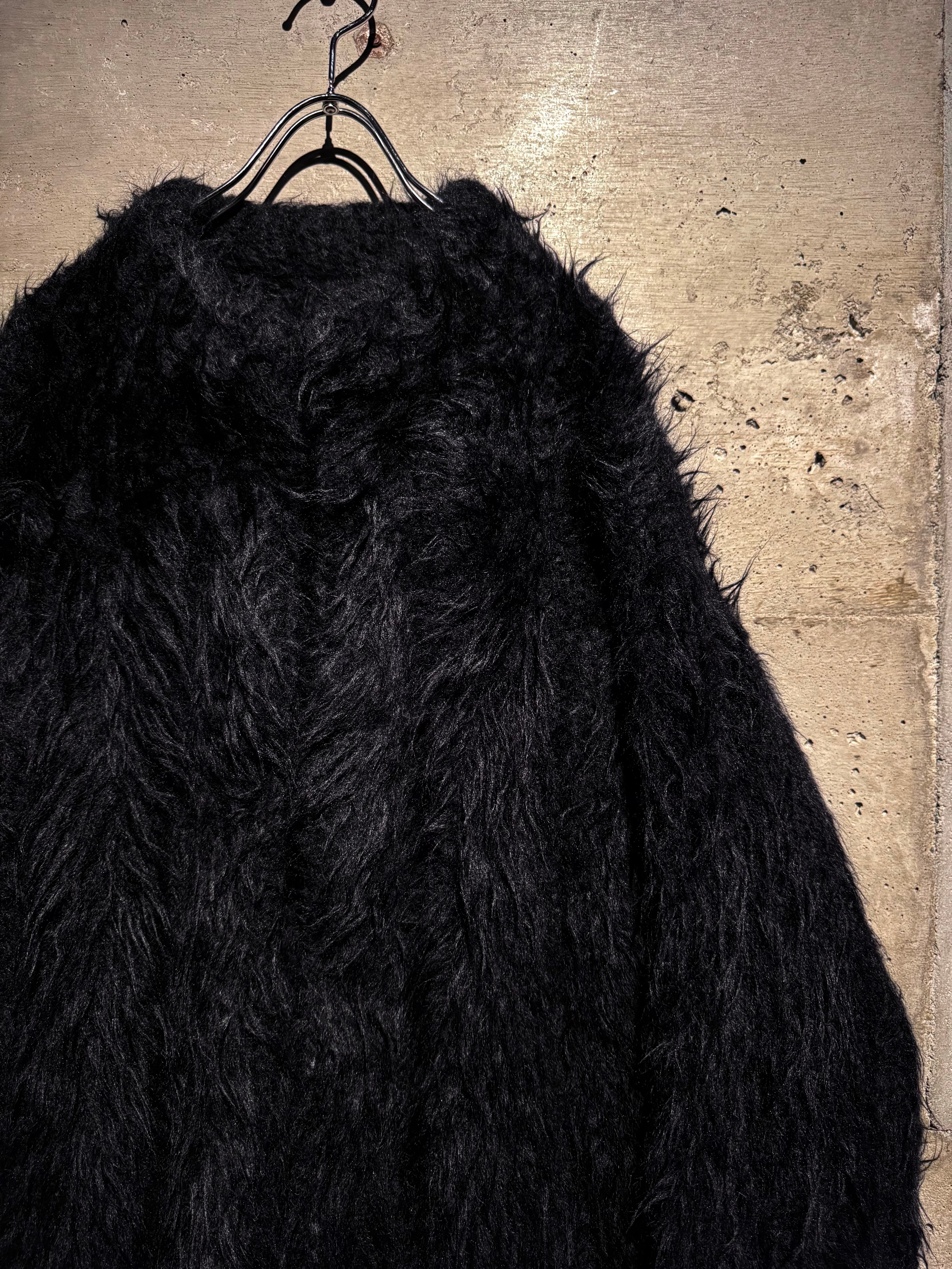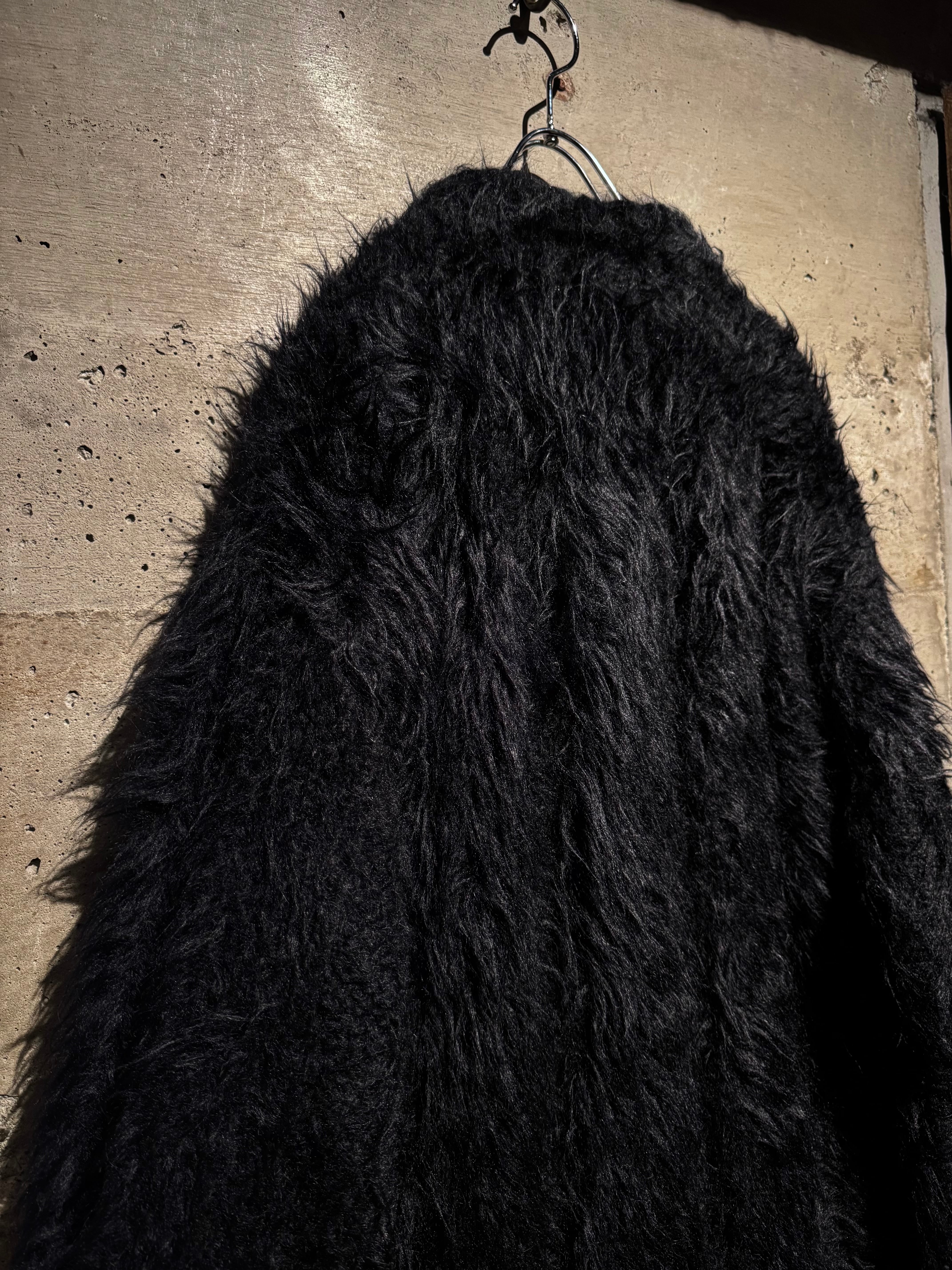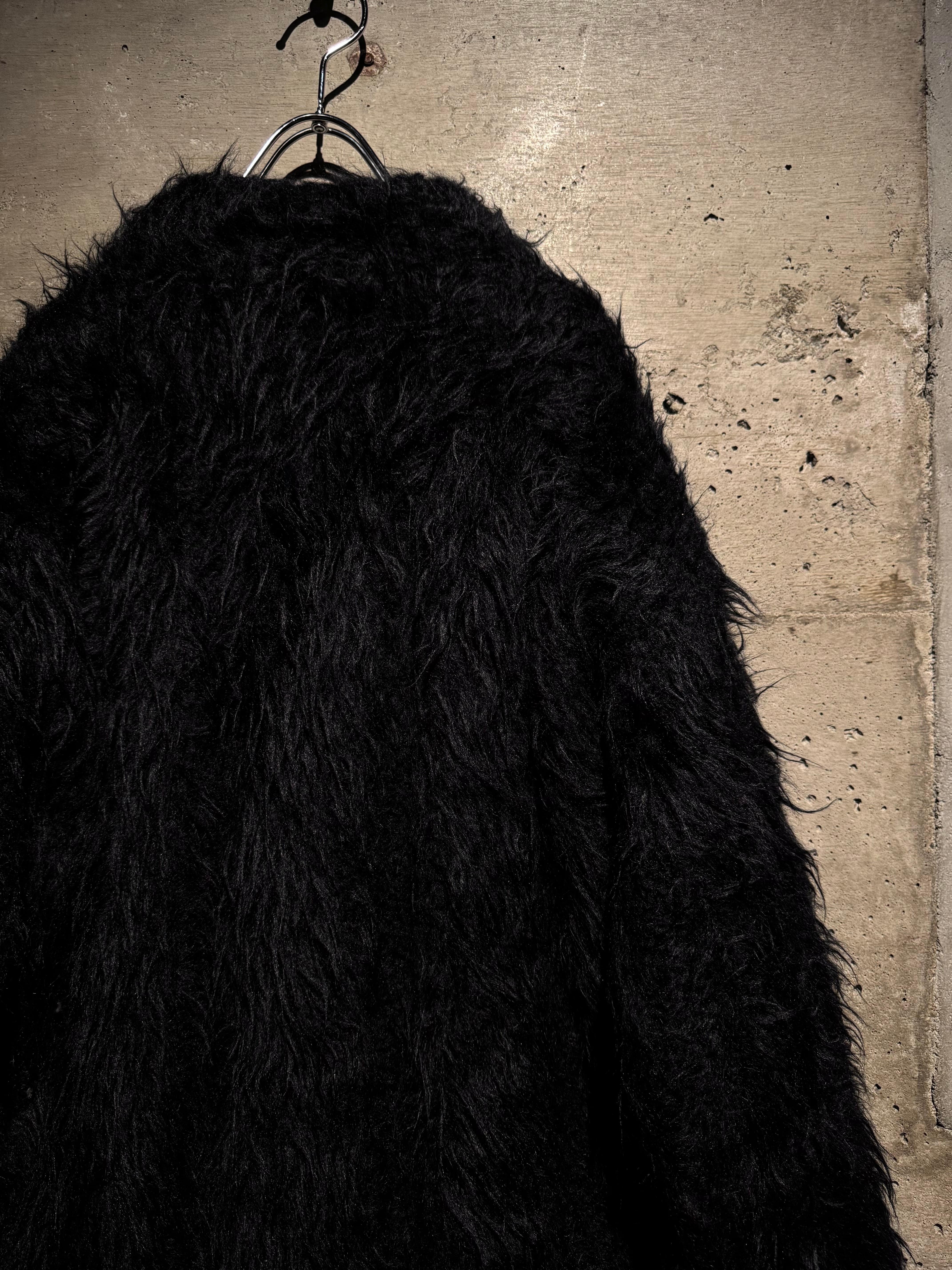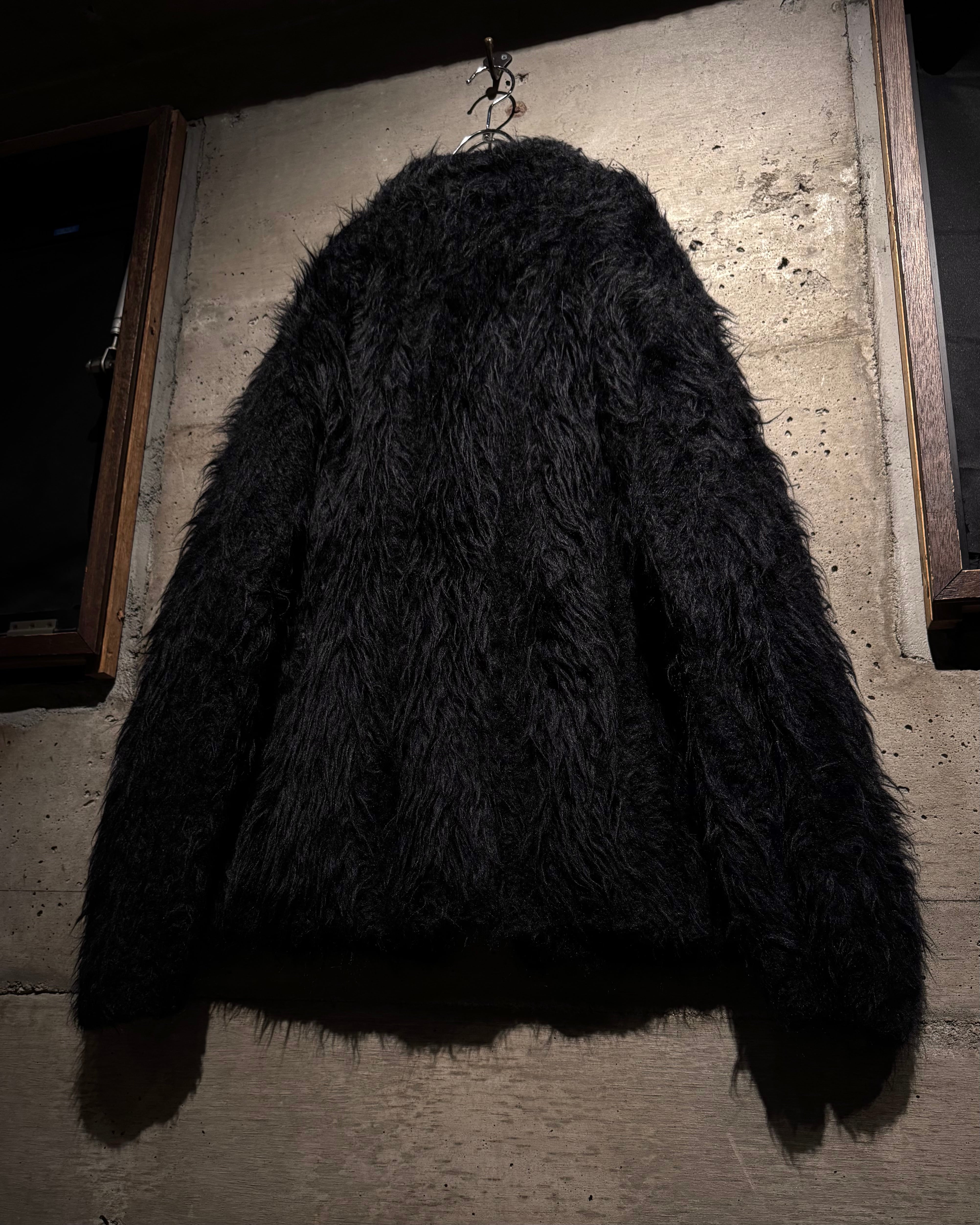 視線を奪うほどの毛足を持つ、ロングシャギーニットジャケット。深みのあるブラックボディに、光の角度で揺らめく起毛の陰影が重なり、静かな迫力を感じさせる一着。ジャケット型のフォルムを採用することで、ラグジュアリーさと存在感を両立しています。
