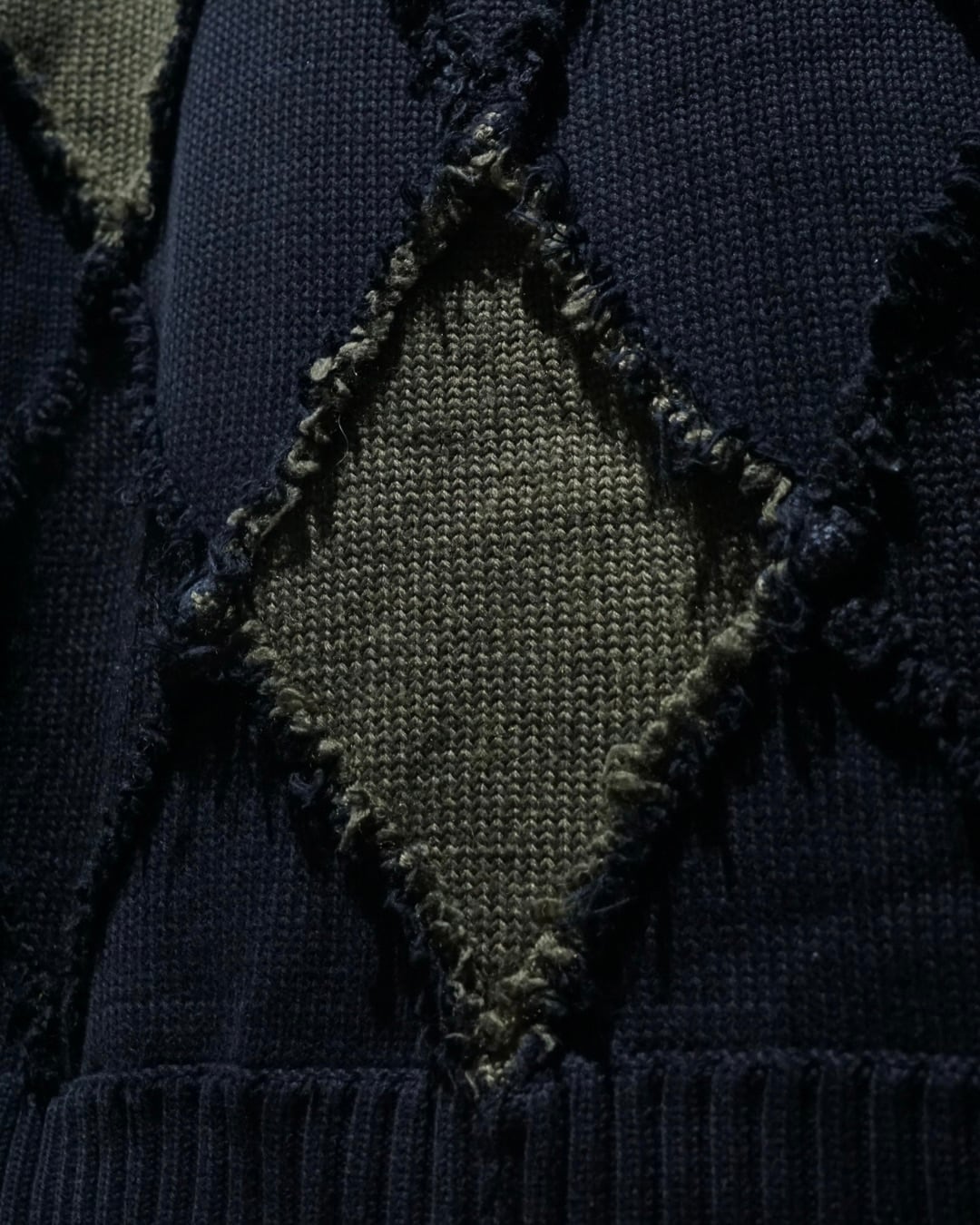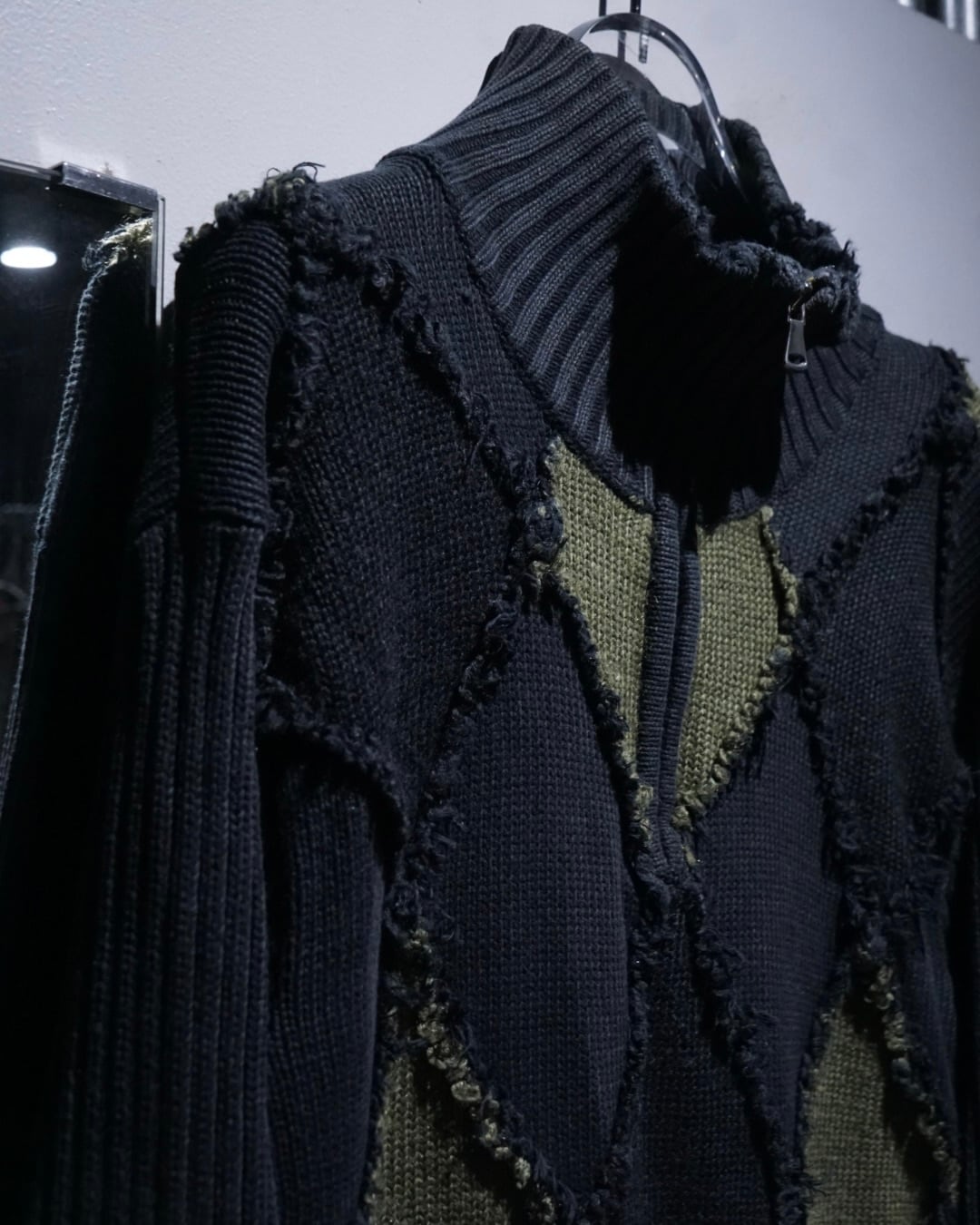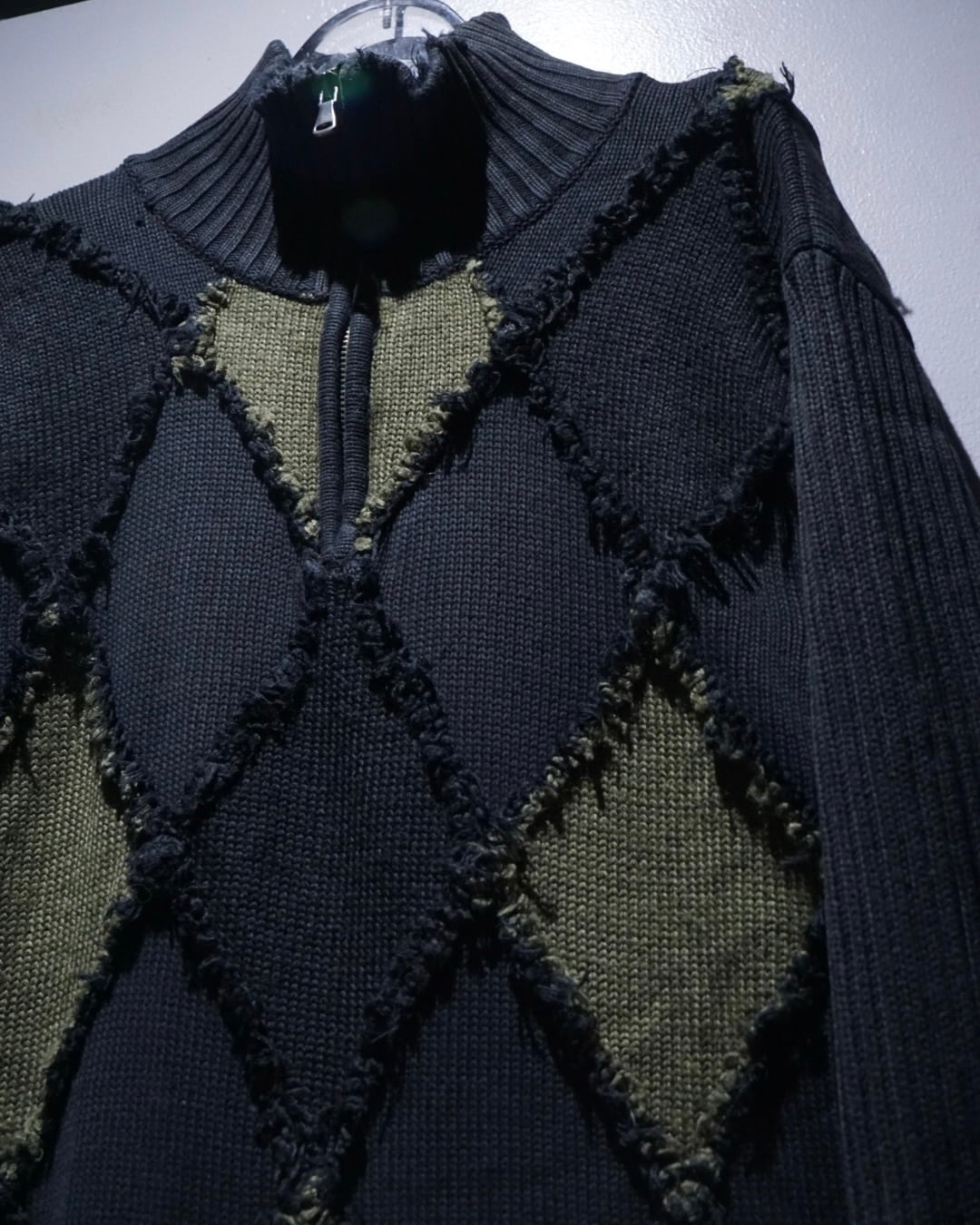 深みのあるブラックをベースに、モスグリーンのアーガイルパターンを切り替えで配置。ラインには断ち切り風に仕上げ、ボディのフェード感と相まって退廃的な雰囲気に仕上げられています。