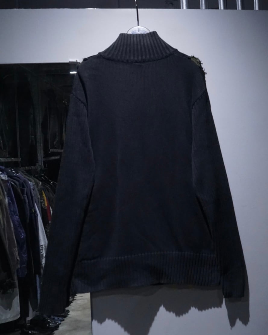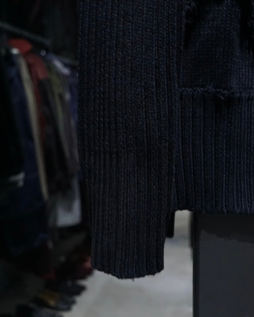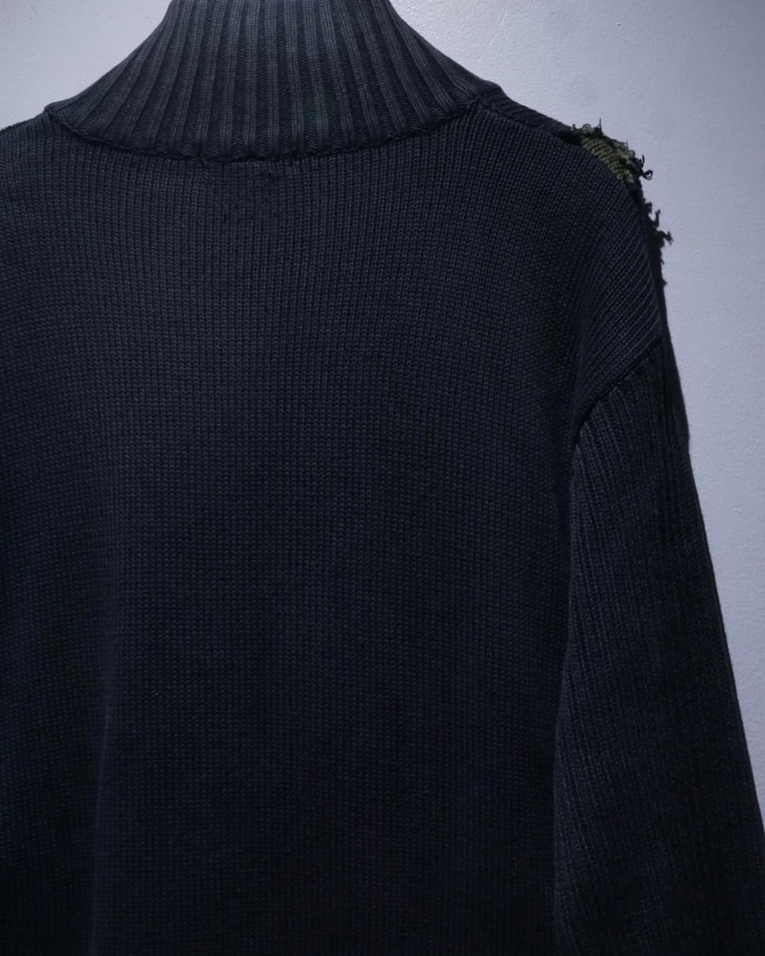 立体的な編み地と断ち切り風のデザインが特徴的なハーフジップコットンニット。