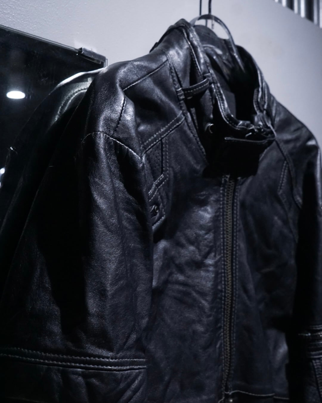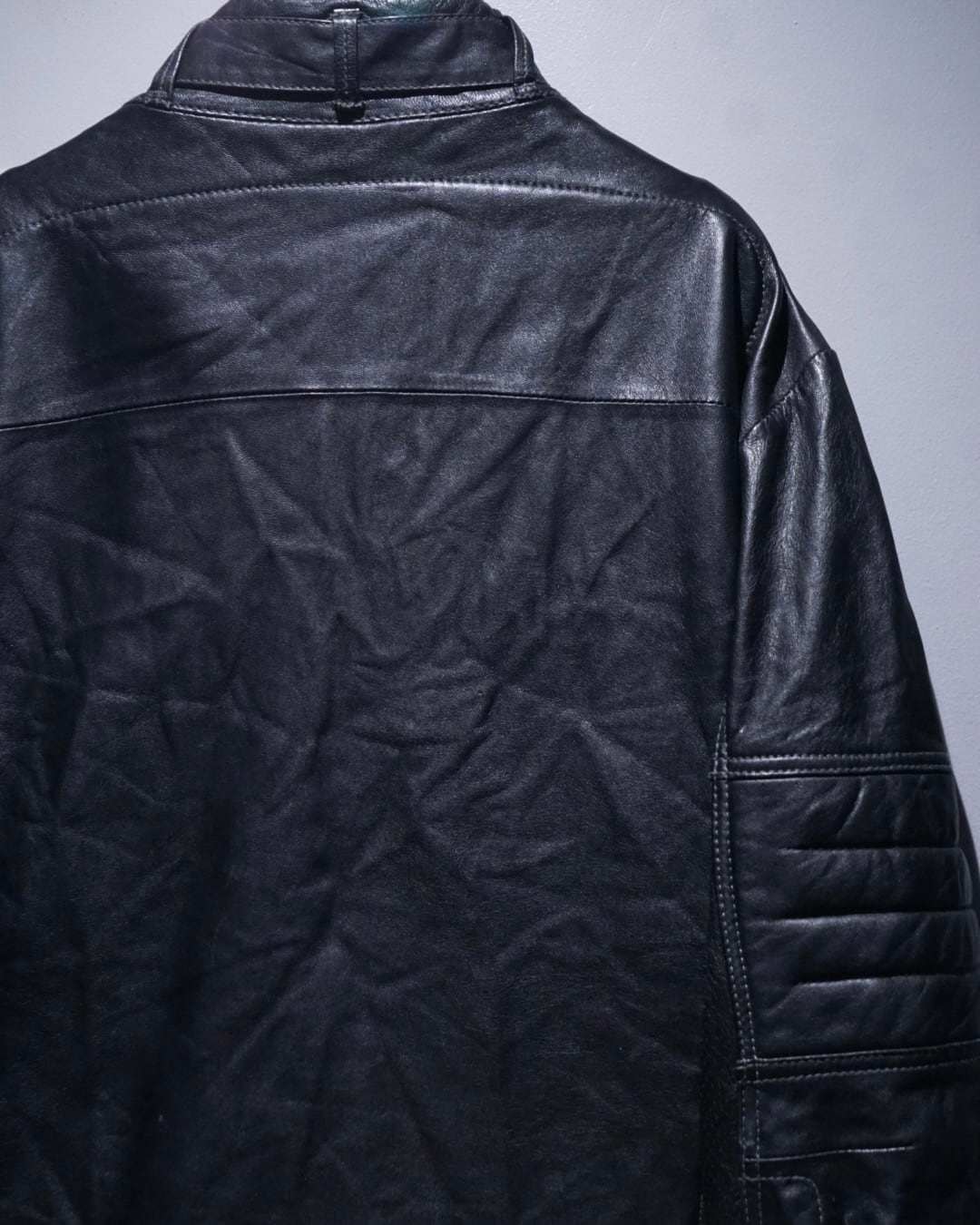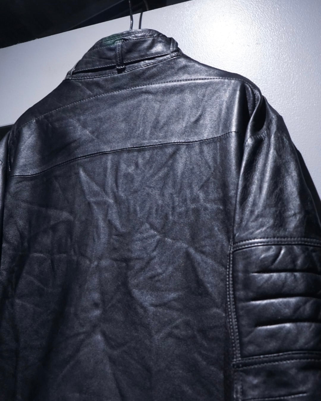 艶を抑えたマットなブラックレザーを使用したボディに、肘にはキルティングパネルを配し、全体に刻まれたステッチが立体感を演出。ネックにはストラップ付きのスタンドカラーで、ミニマルながら作りながらタフさも感じられるバランス感が◎