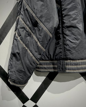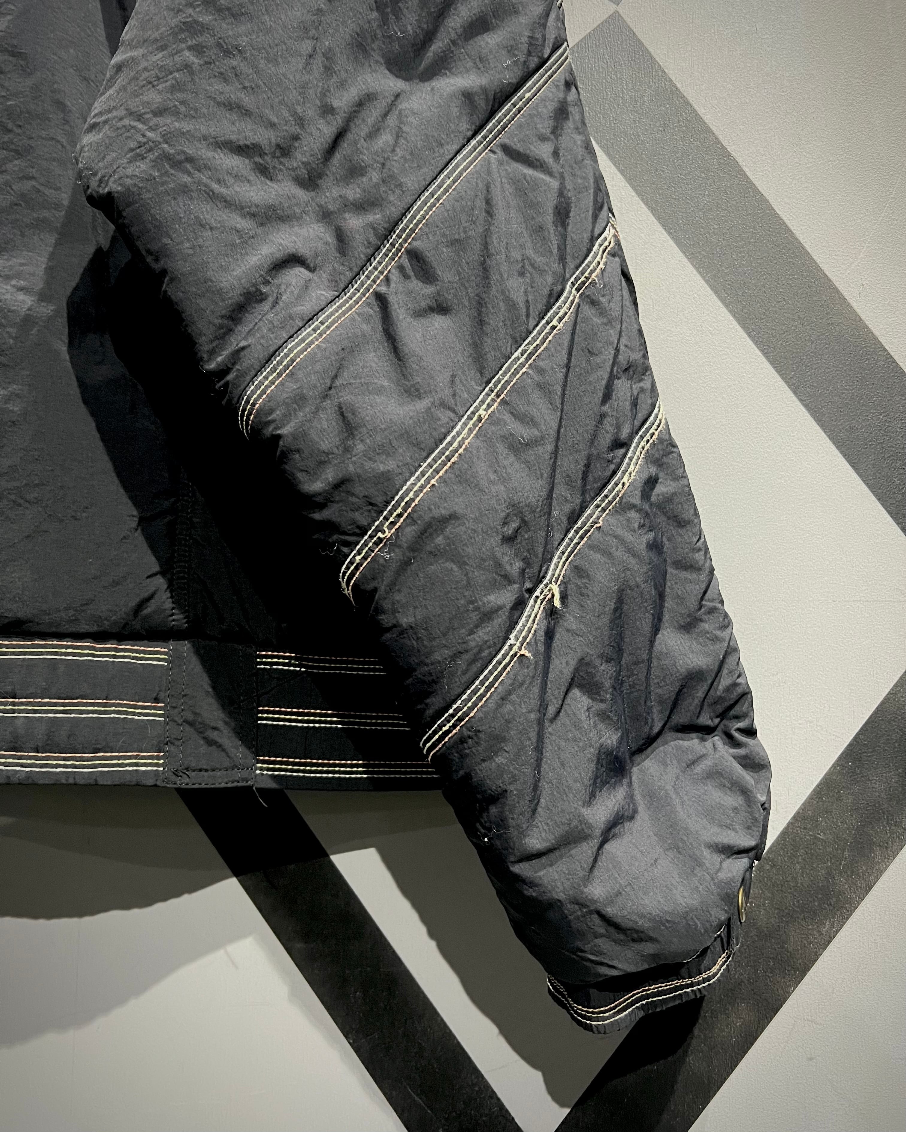 マットな質感のナイロンボディに、随所へ施されたステッチラインがグラフィカルに走るデザイン。ショルダーからアームにかけて流れるように配置されたステッチが、スポーティーでありながらモードな印象を与えています。