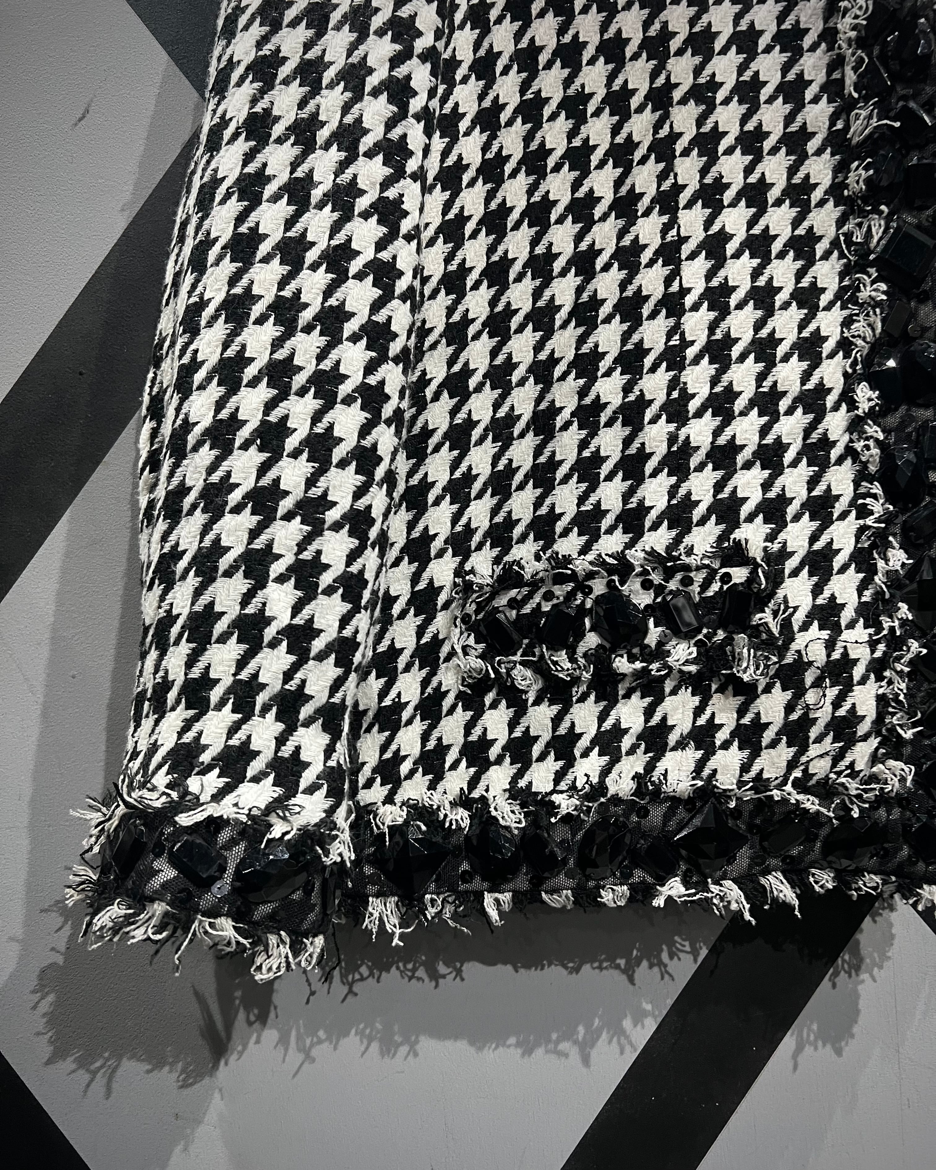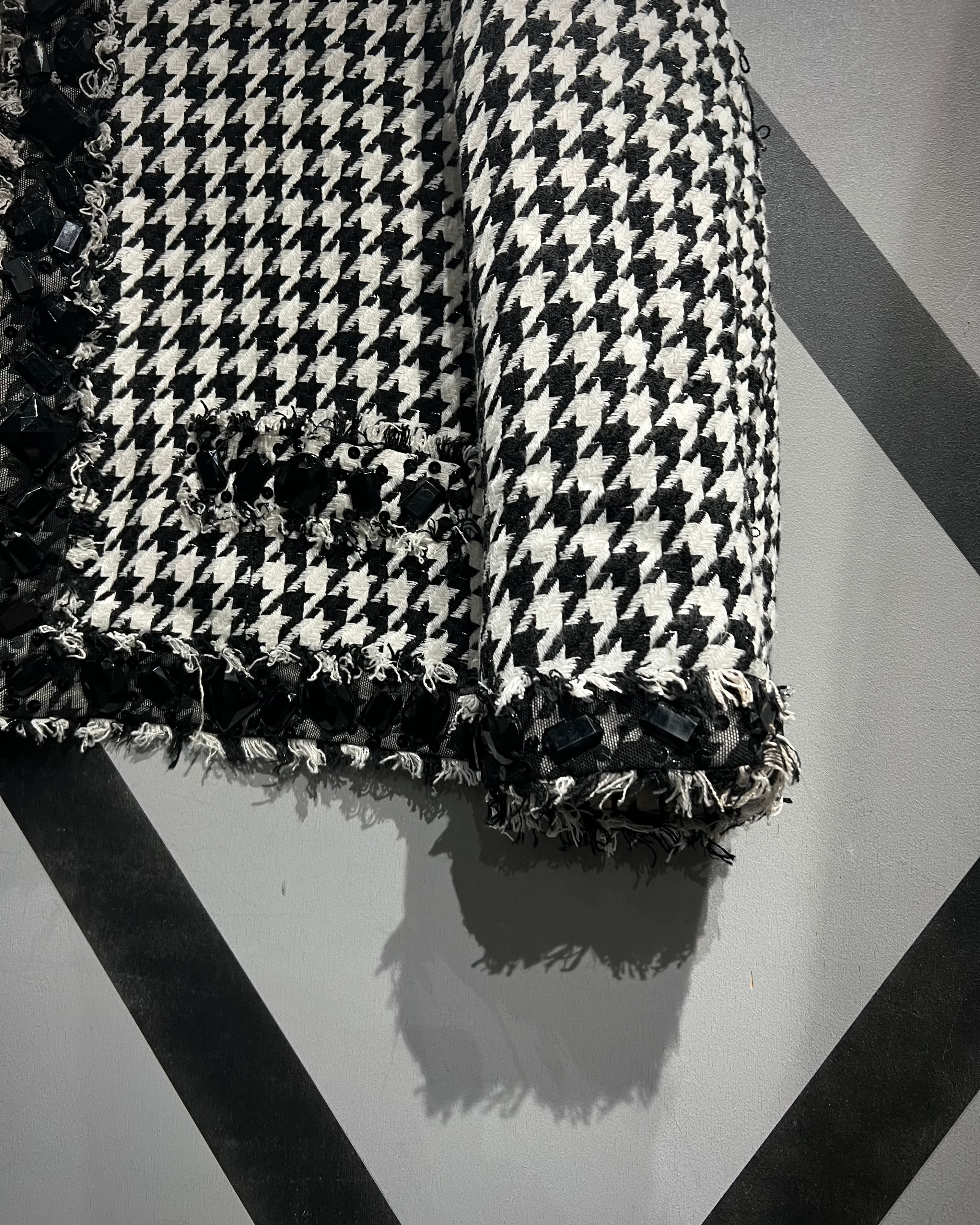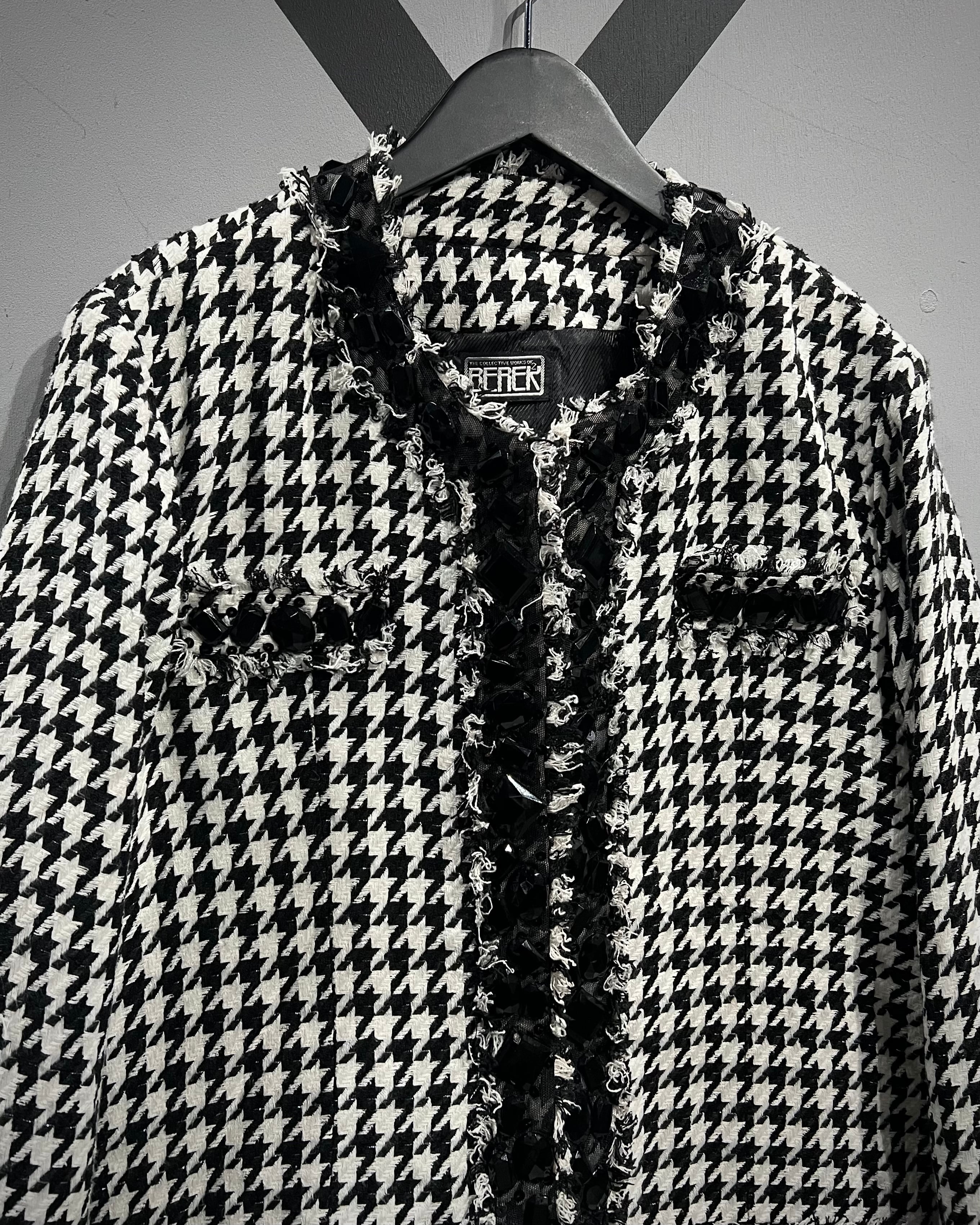 クラシックな千鳥格子柄をベースに、フリンジやビジューを大胆にあしらうことでモードに昇華させたツイードジャケット。