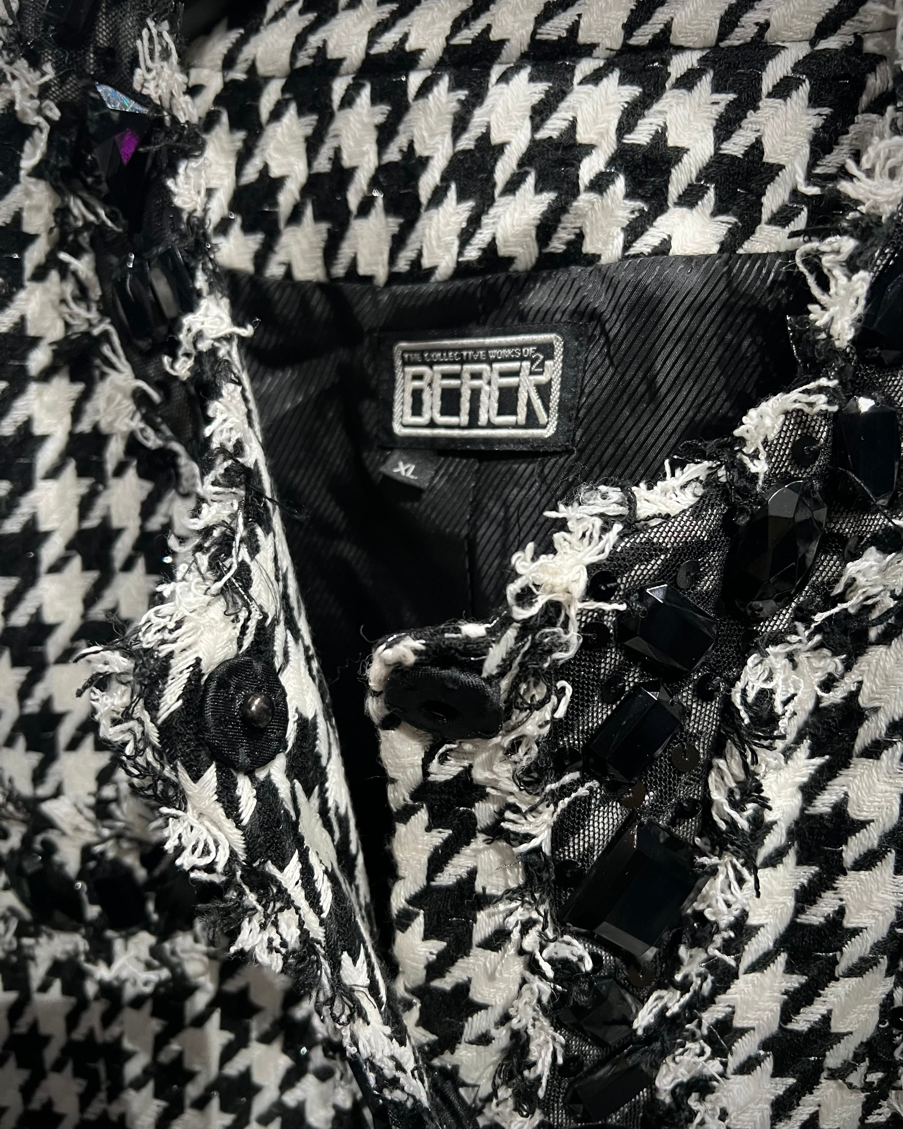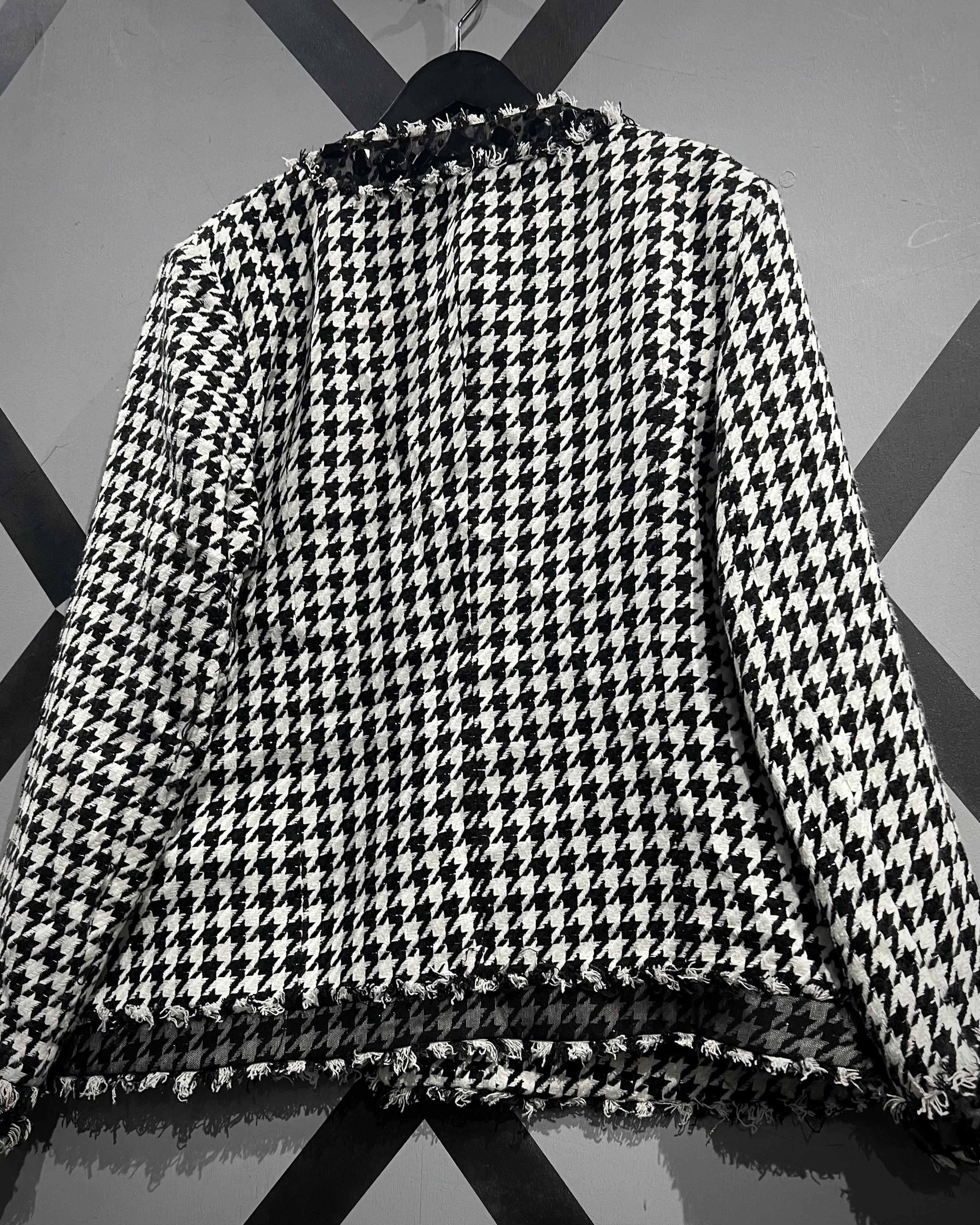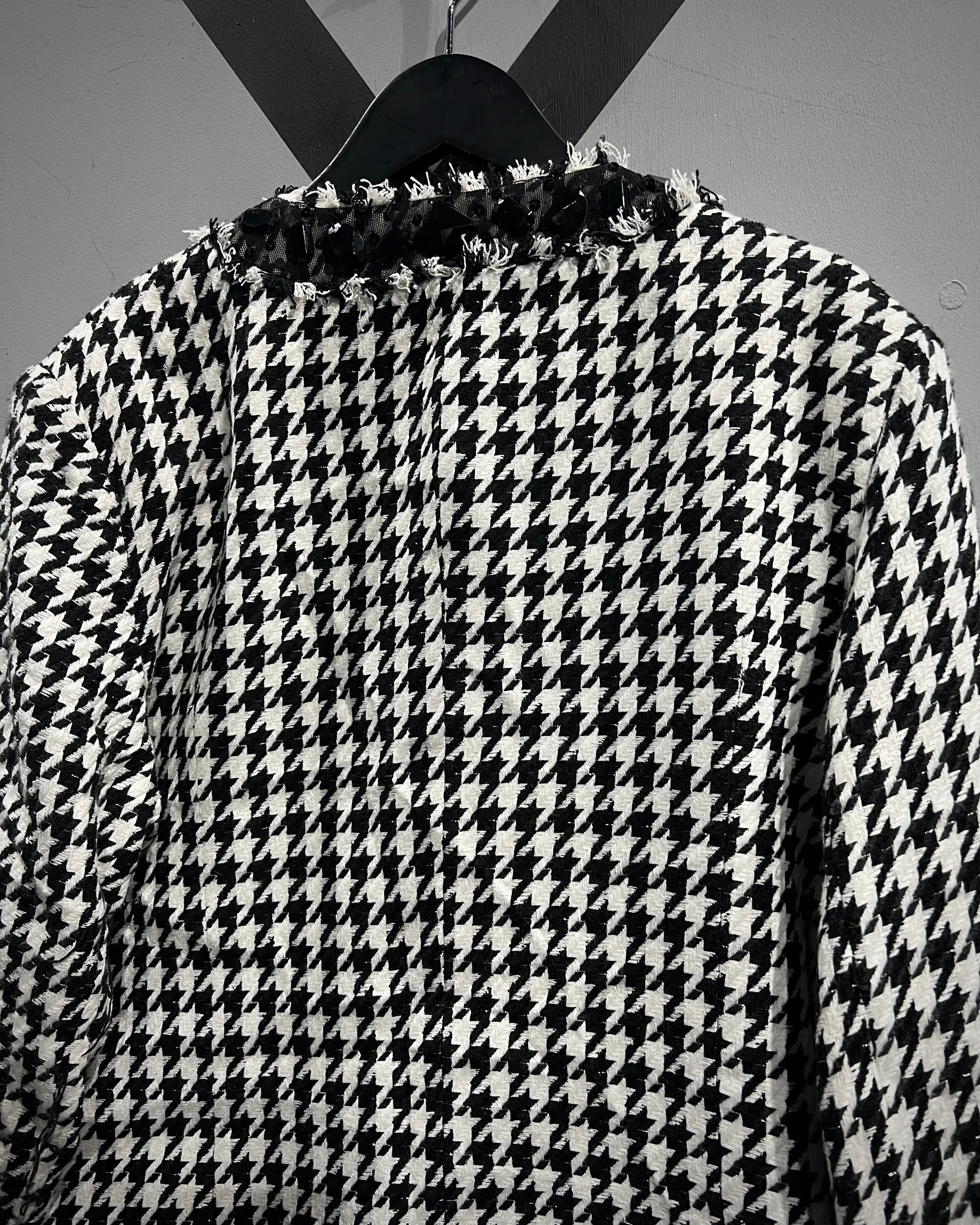 クラシックな千鳥格子柄をベースに、フリンジやビジューを大胆にあしらうことでモードに昇華させたツイードジャケット。