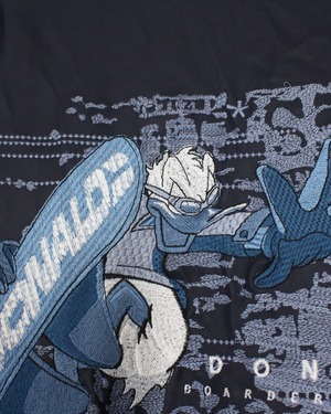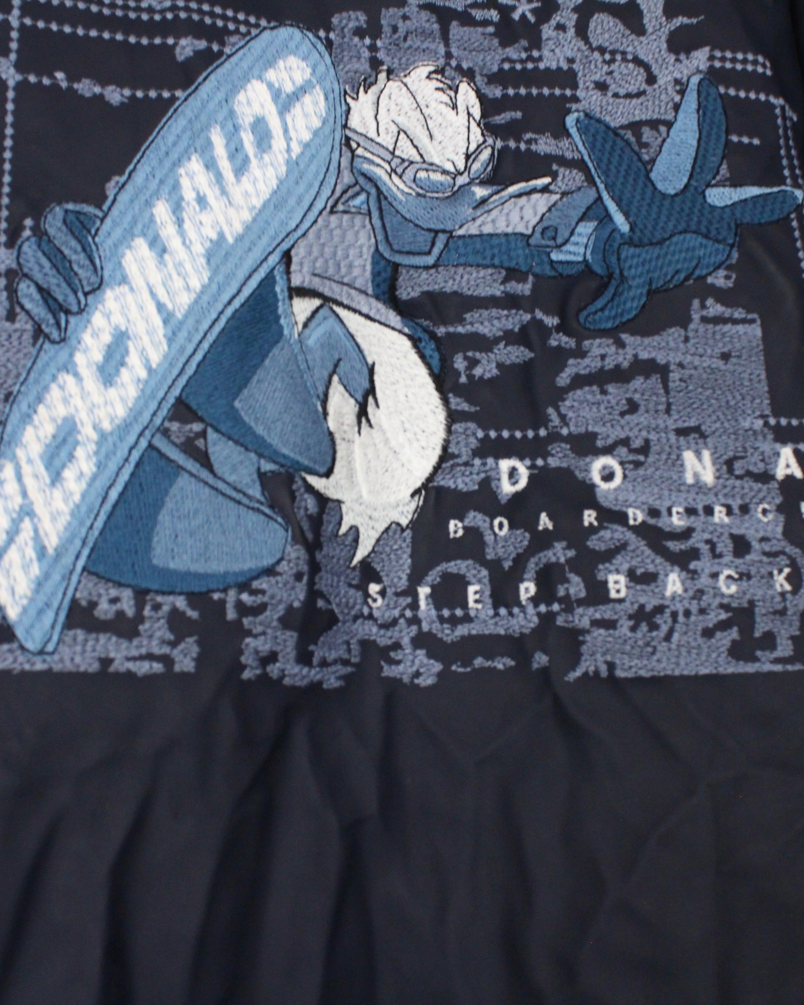 最大の特徴は、フロントとバックに施された大判のドナルド刺繍。スノーボードを抱えたアクティブなデザインが90’sカルチャーを彷彿とさせ、ストリートとポップアートが融合した唯一無二の存在感を放ちます。